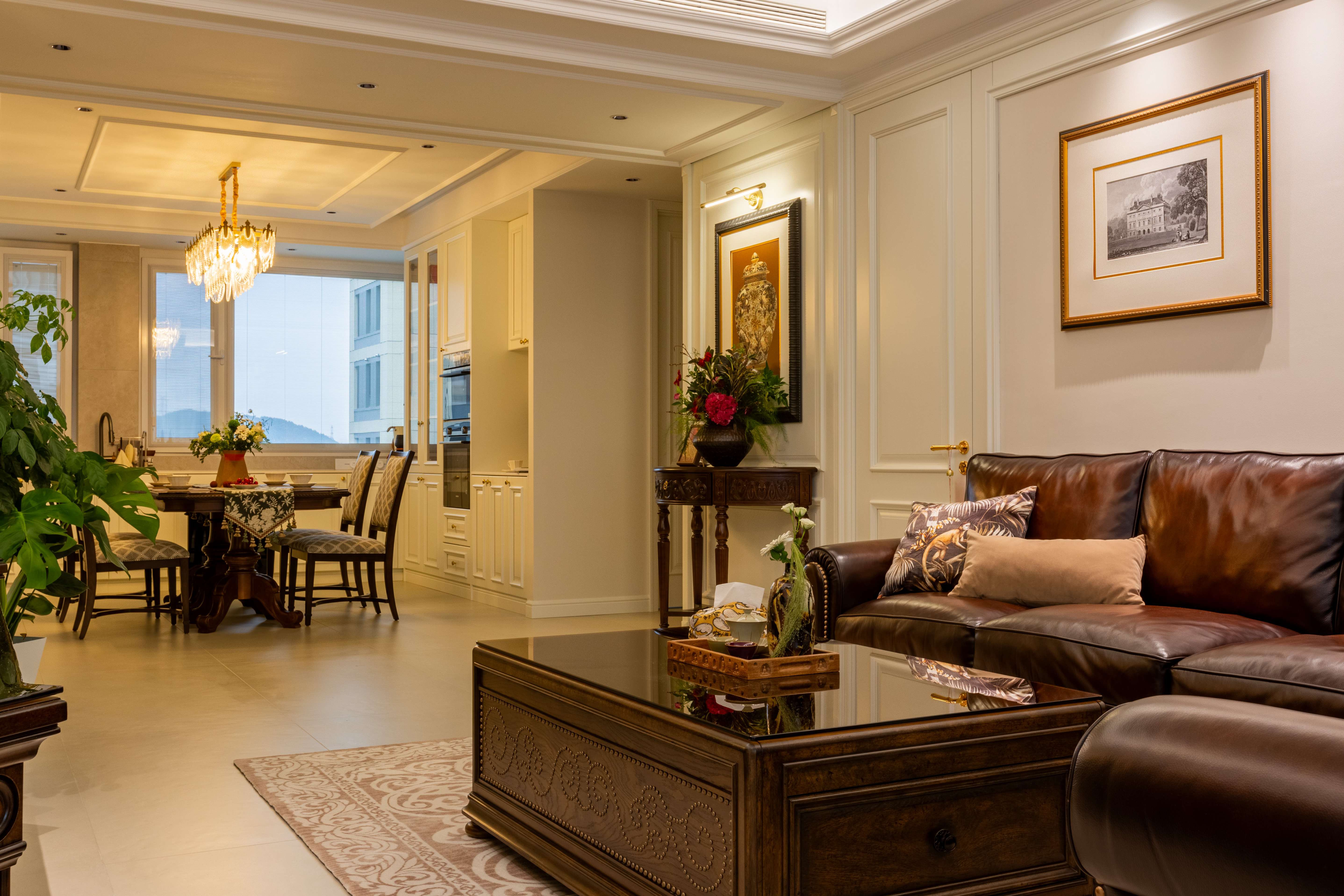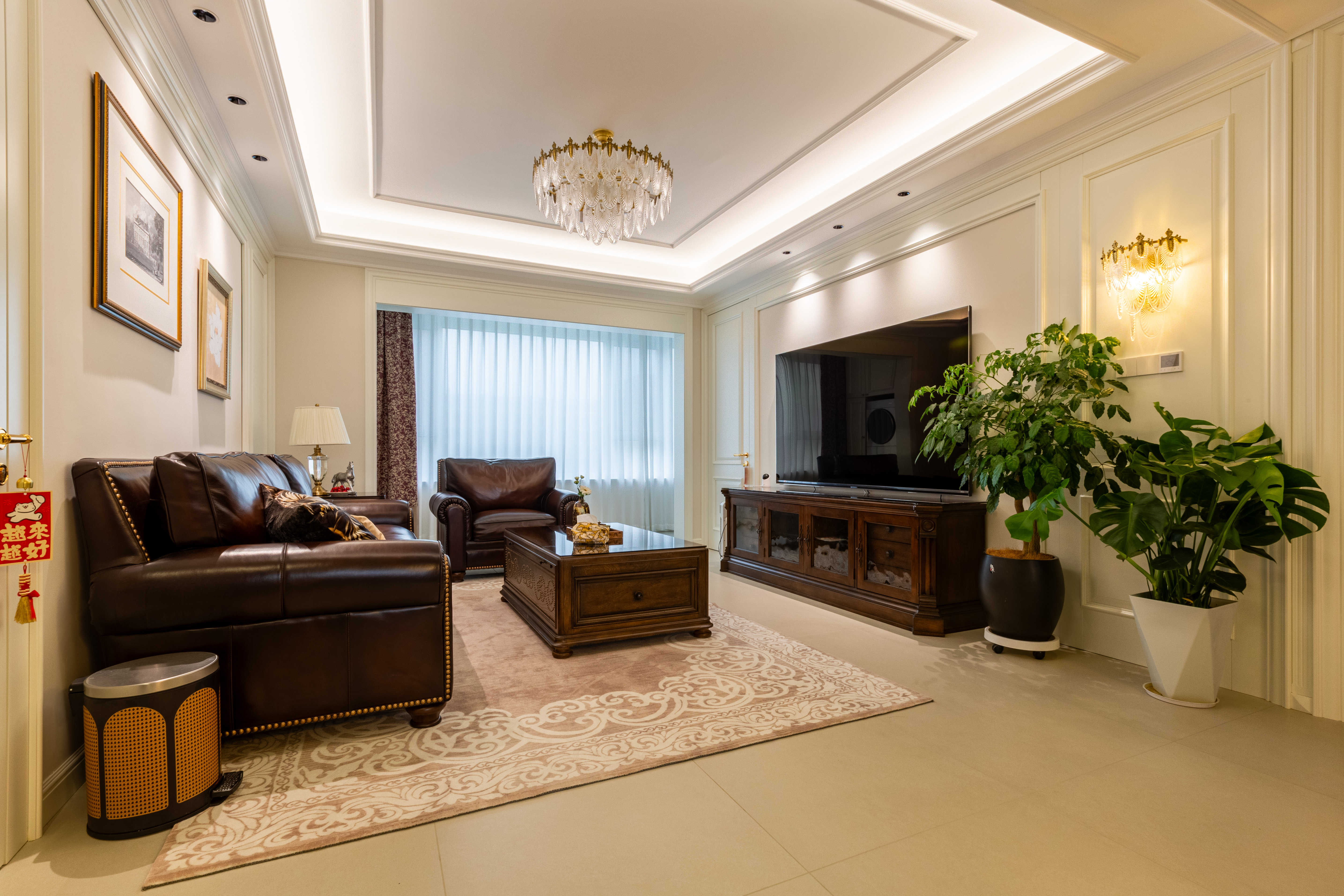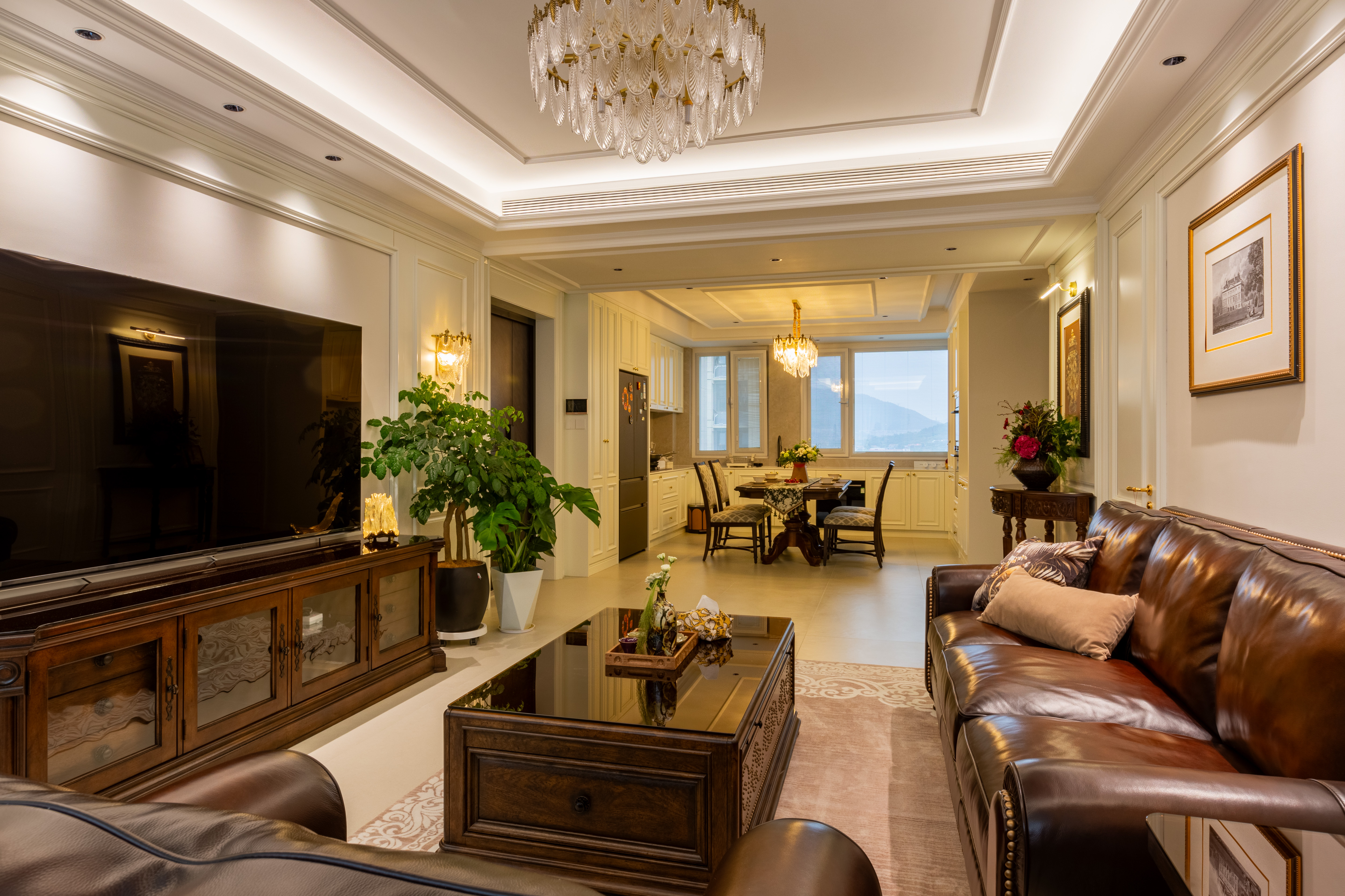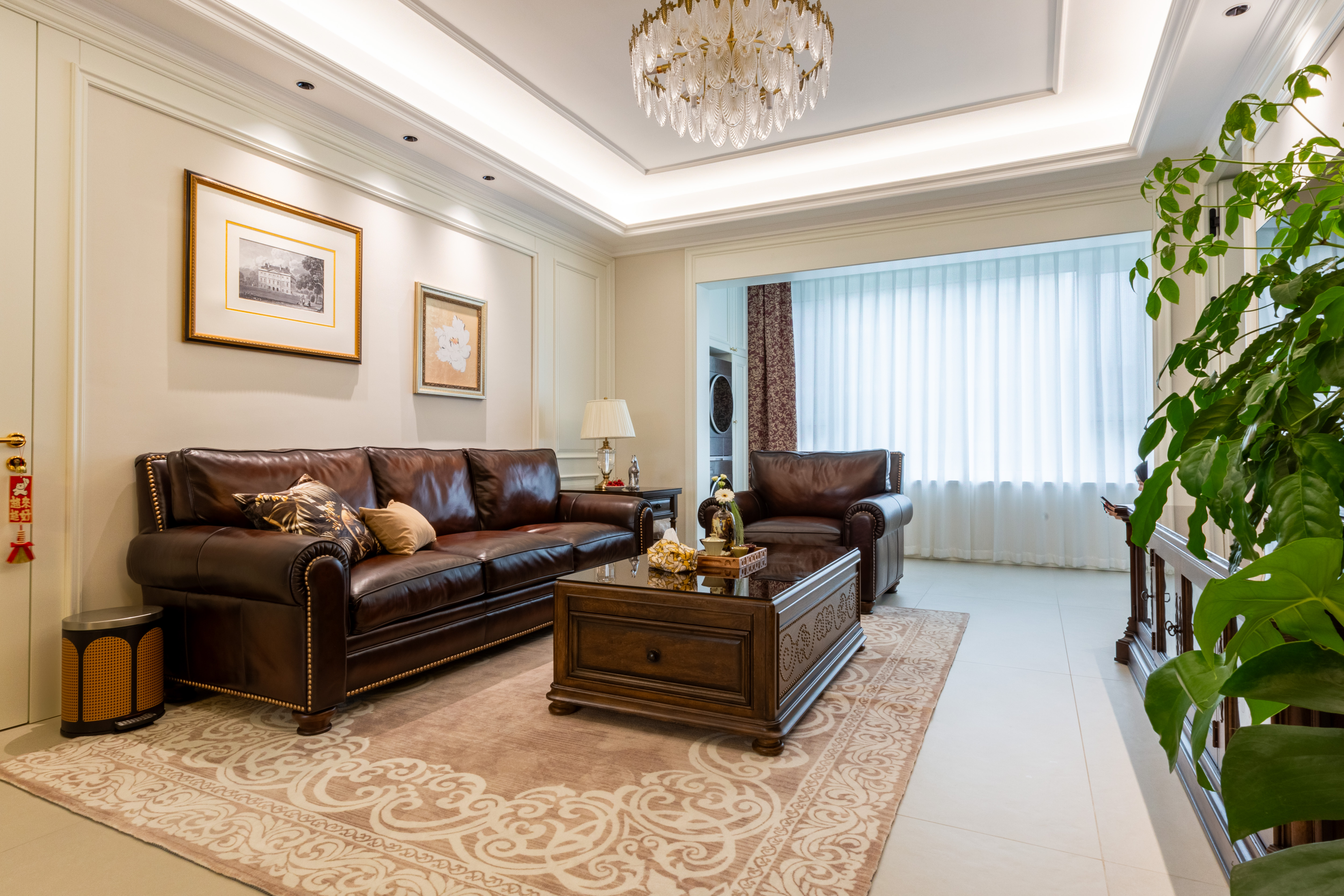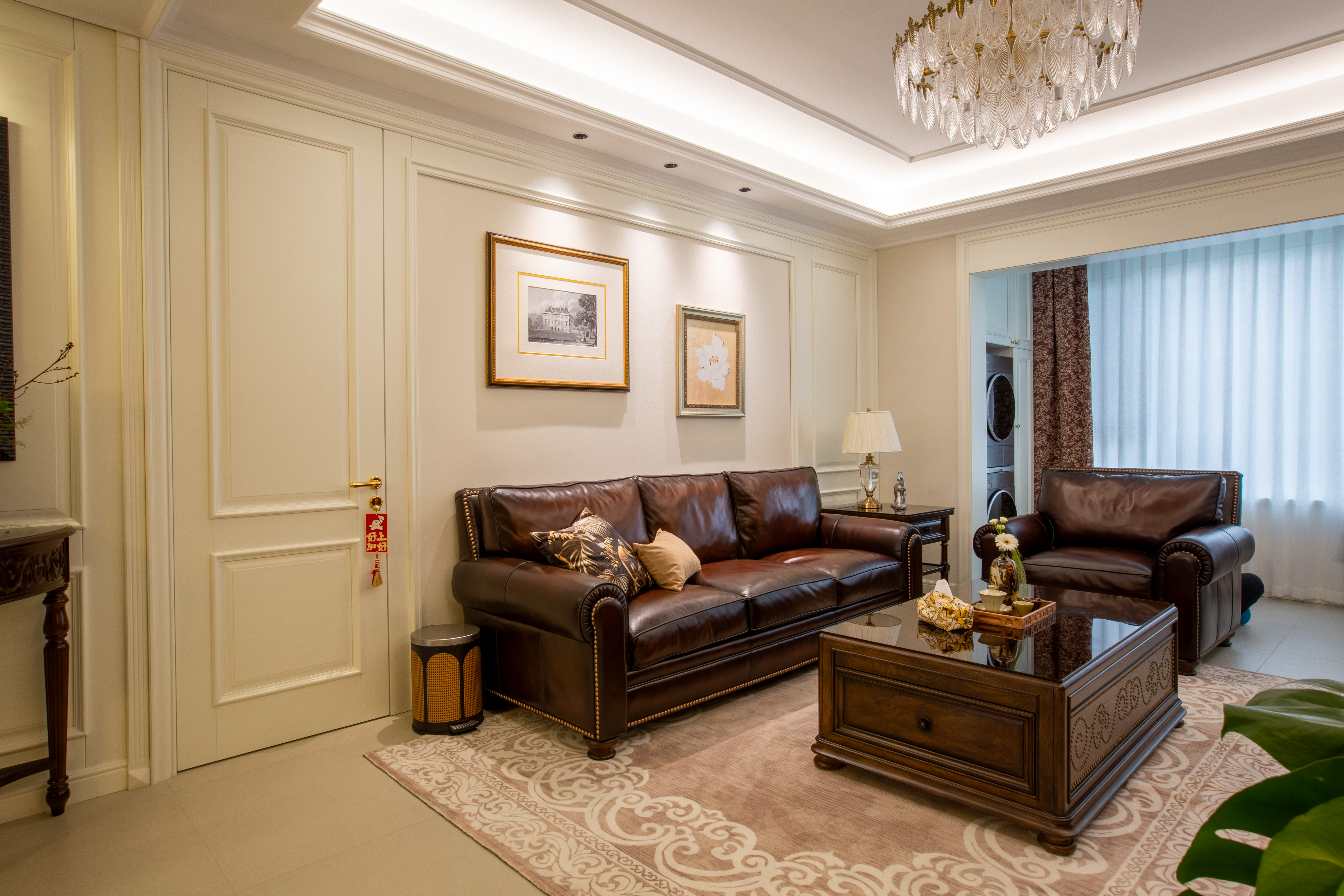 空间意境:深棕皮革与雕花实木碰撞,水晶光影交织复古软装,勾勒出“复古而不陈旧、轻奢而不浮夸”的美式诗意场景,让居家时光满是雅致仪式感。
