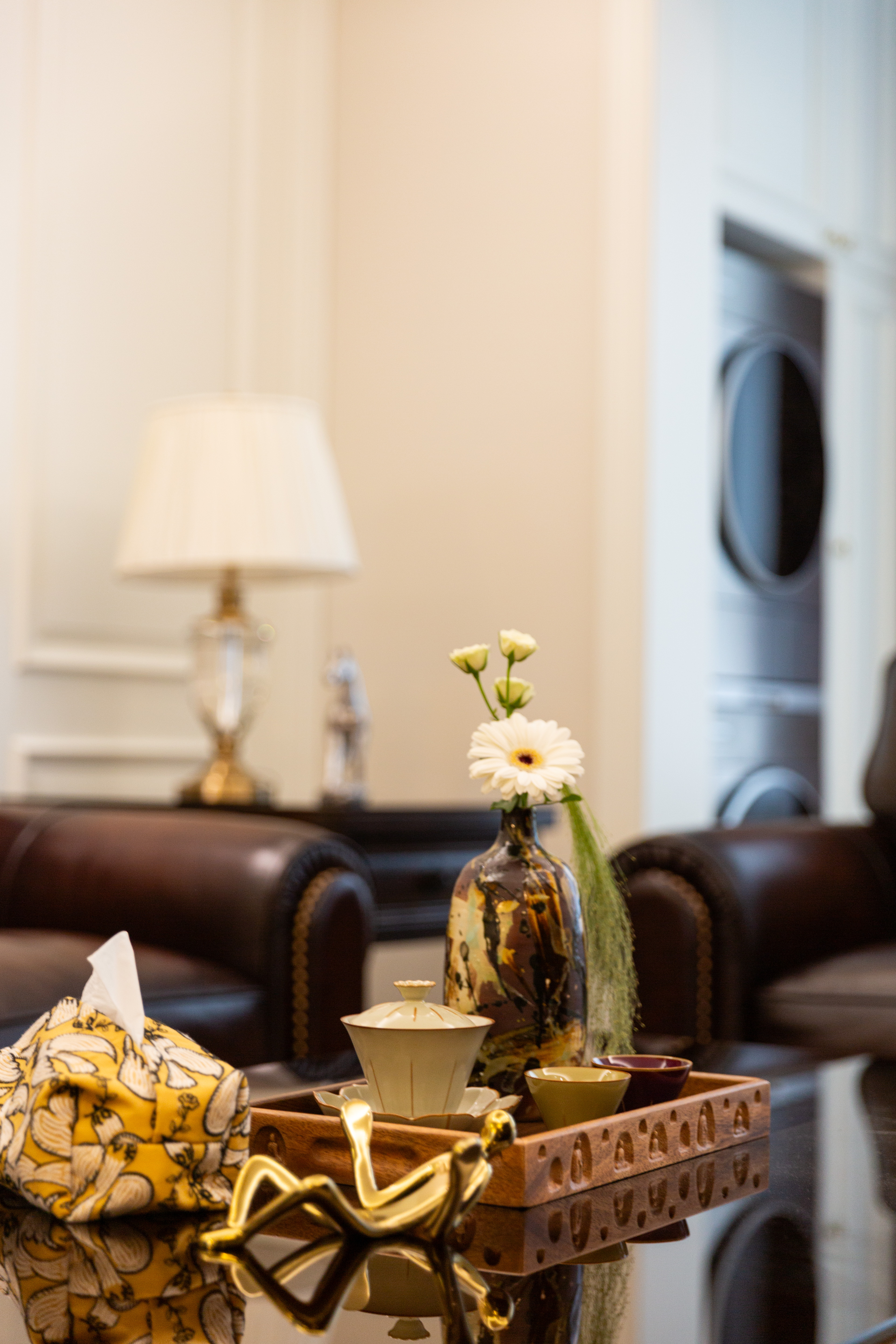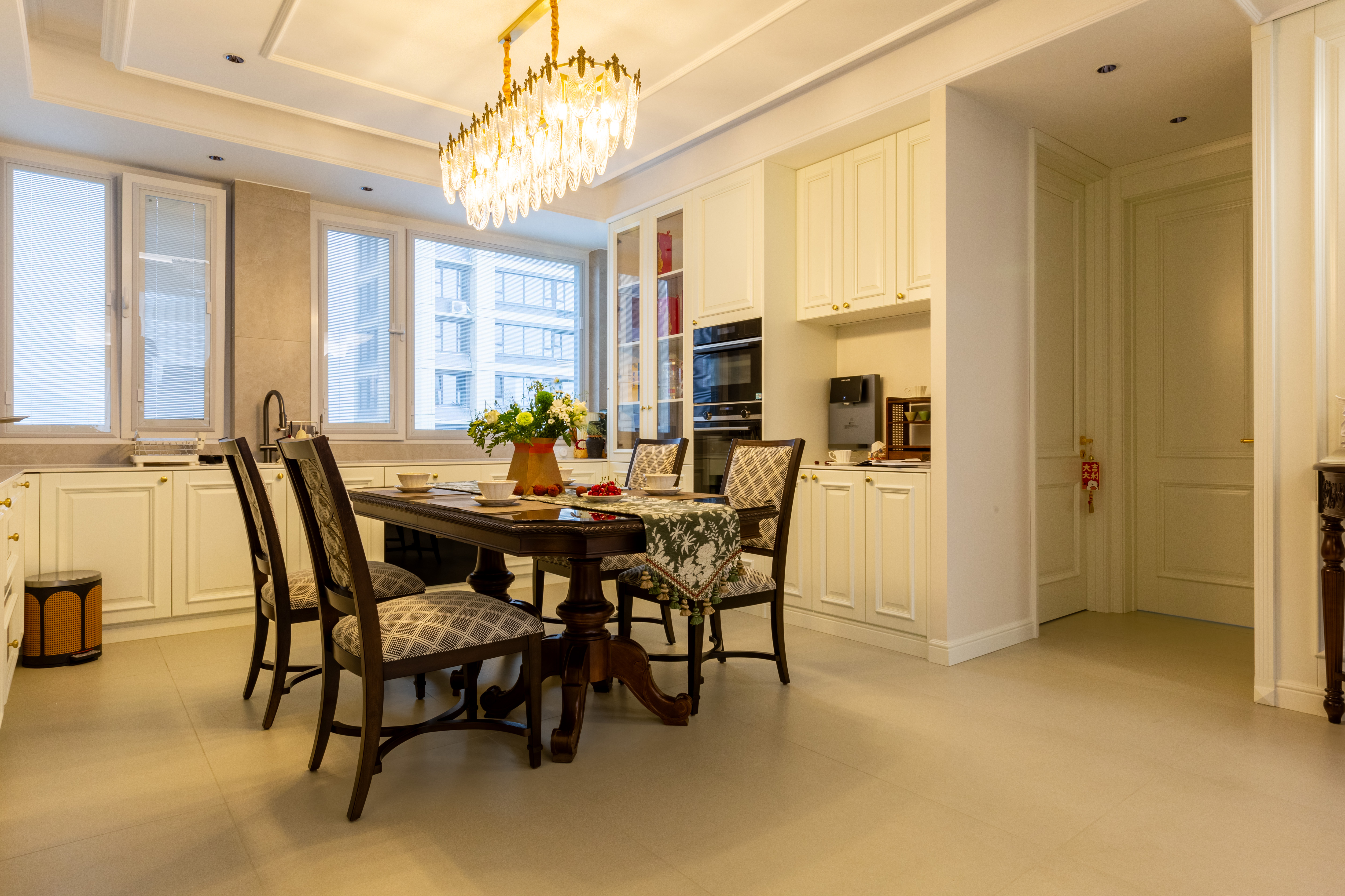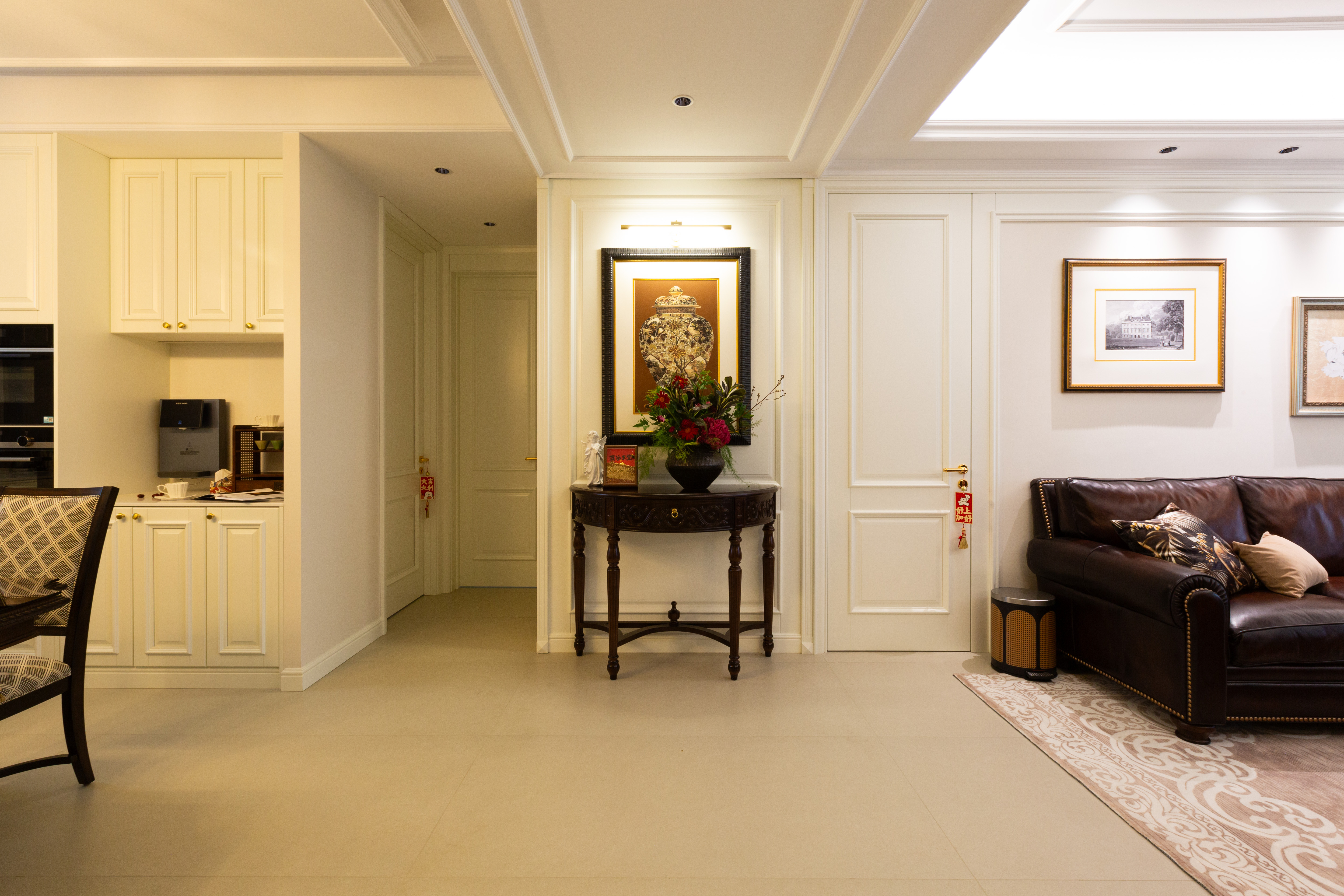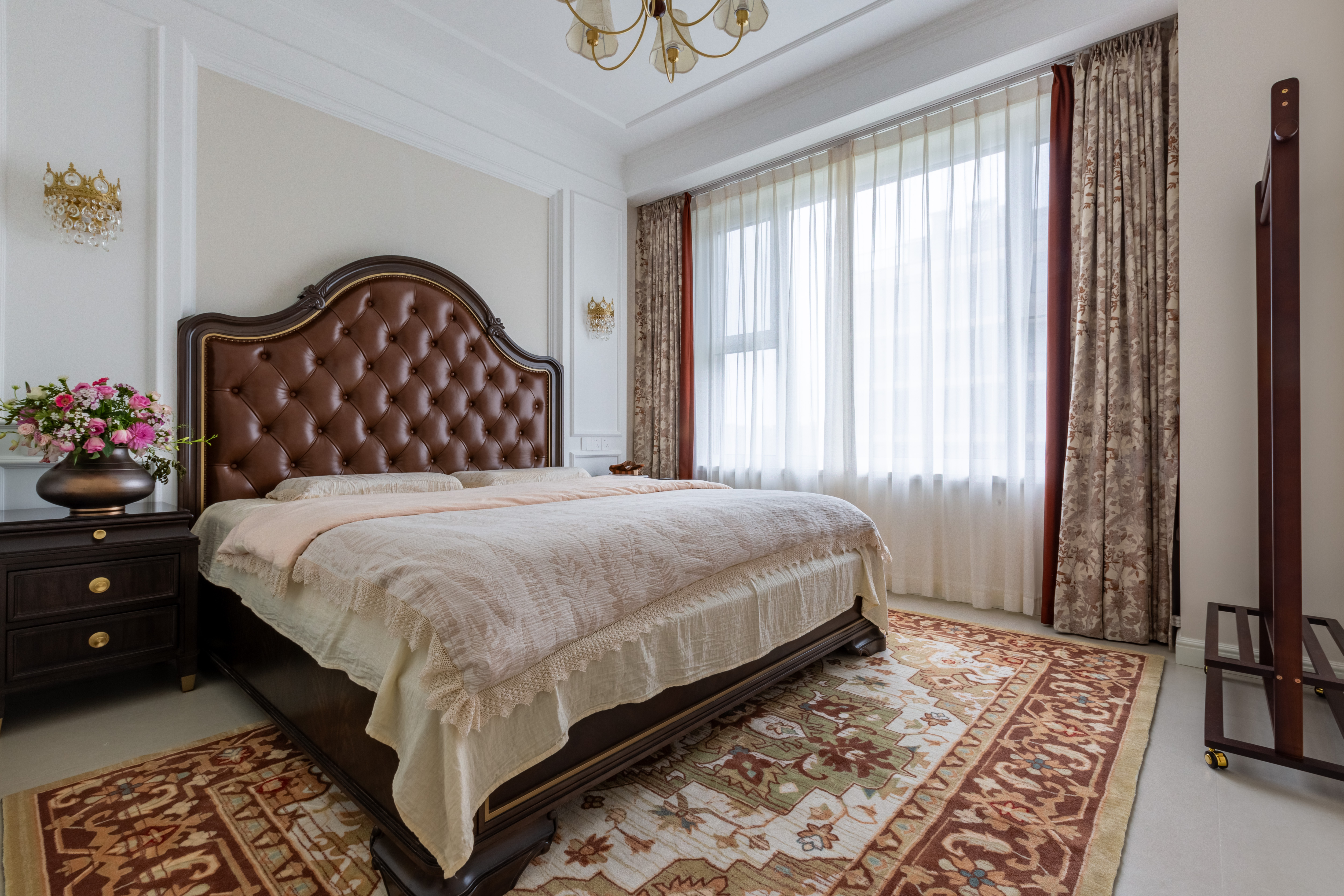 空间意境:深棕皮革与雕花实木碰撞,水晶光影交织复古软装,勾勒出“复古而不陈旧、轻奢而不浮夸”的美式诗意场景,让居家时光满是雅致仪式感。