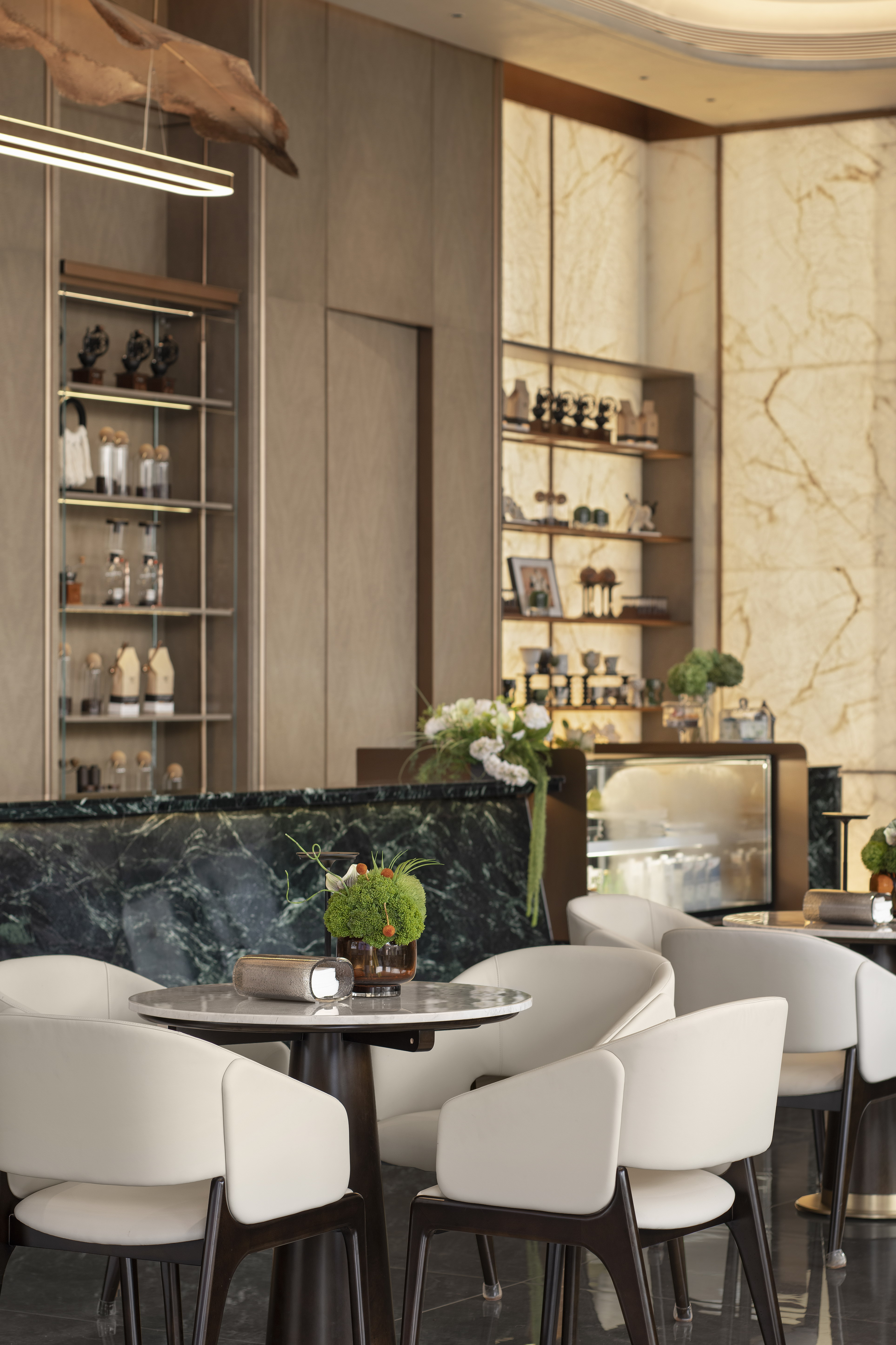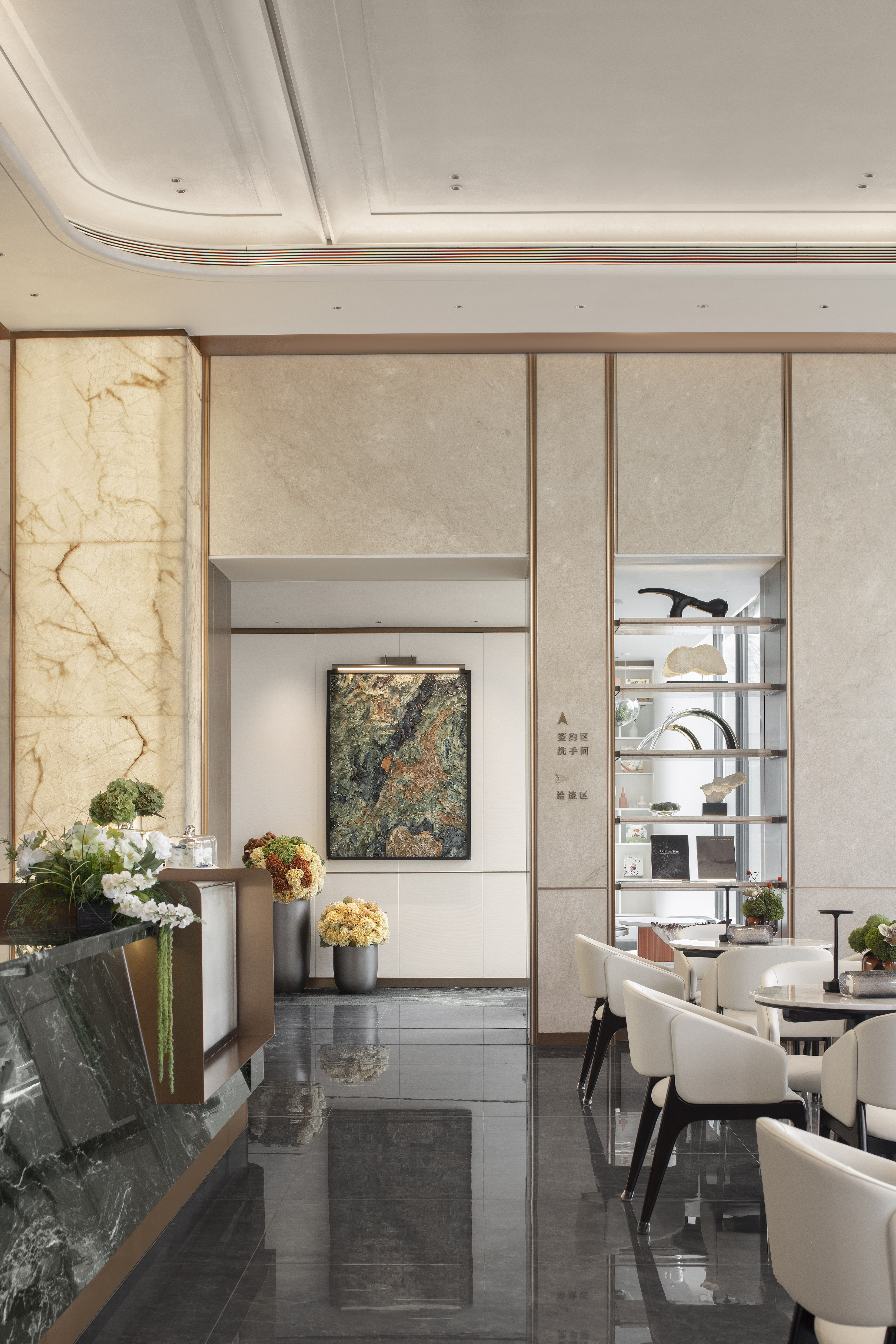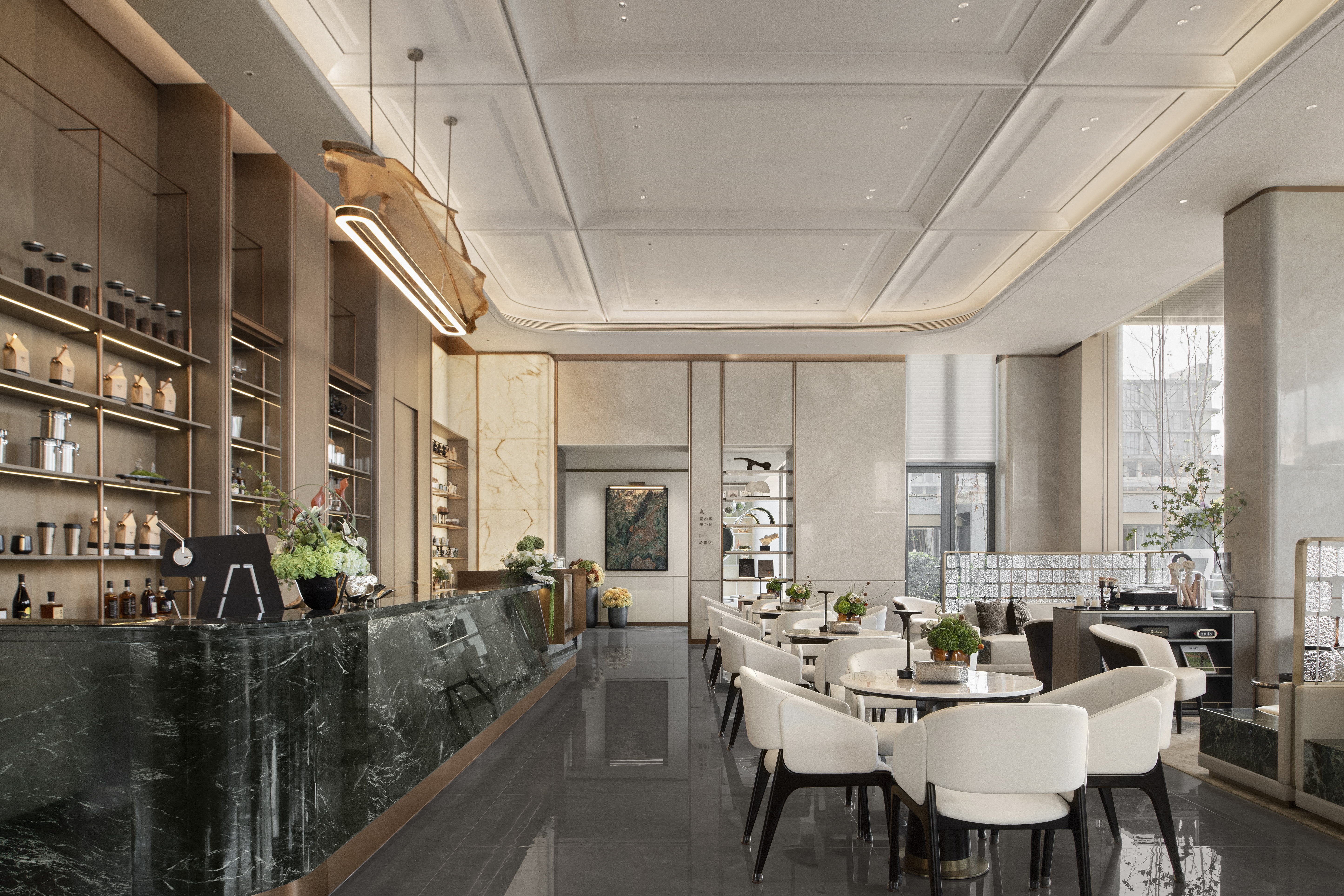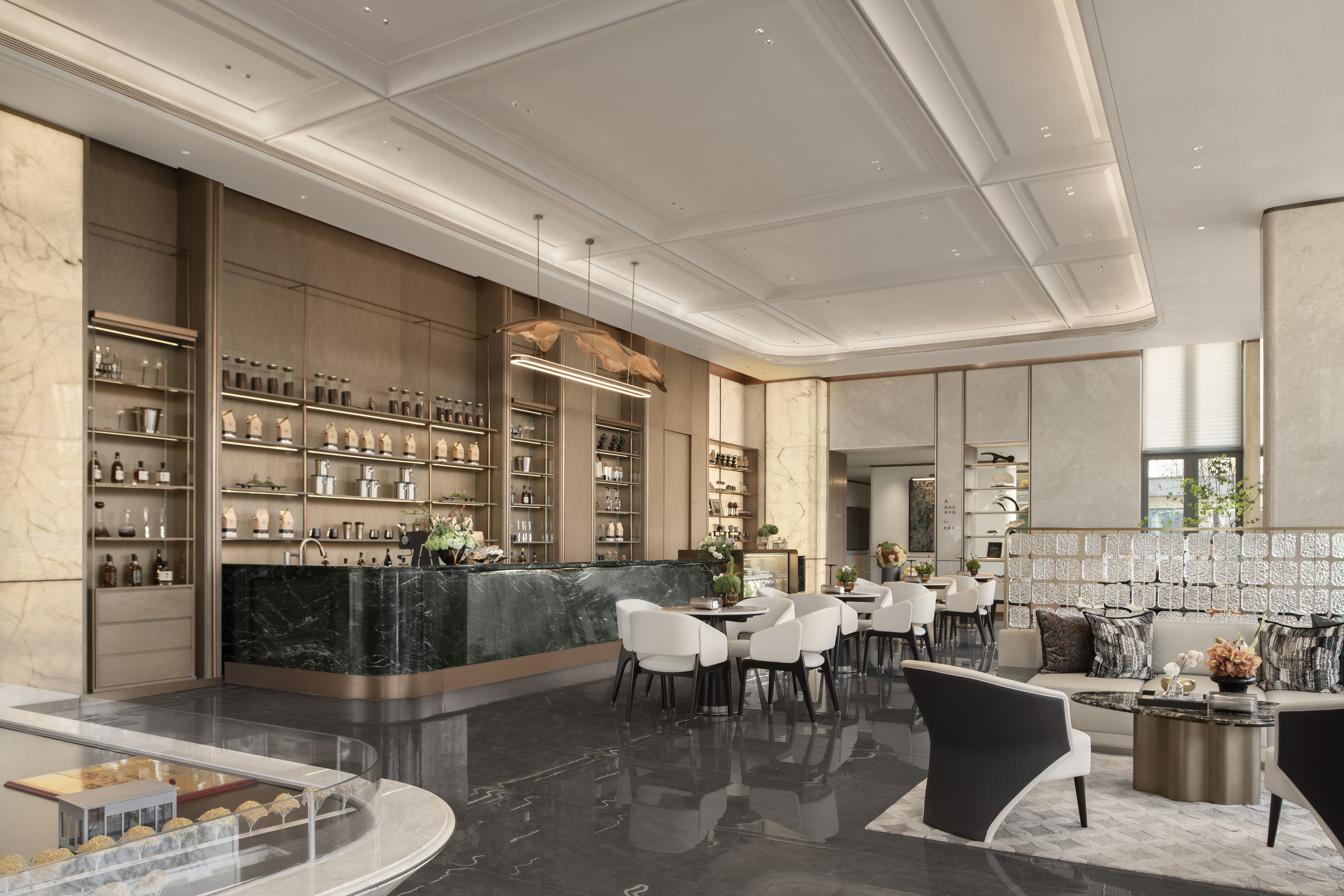 空间布局:销售中心整体设计以精致悦己,向往自然为基调,以低奢、精致、松弛和优雅的美学风格贯穿整体设计. 销售中心空间规划流畅,松弛有道,以“林影拾光”、“轻咖沙龙”、“香草图书馆”、“花语会客厅”,不同场景空间,满足客户的不同需求,并在照明设计精心考量下,营造出温馨而动人的氛围