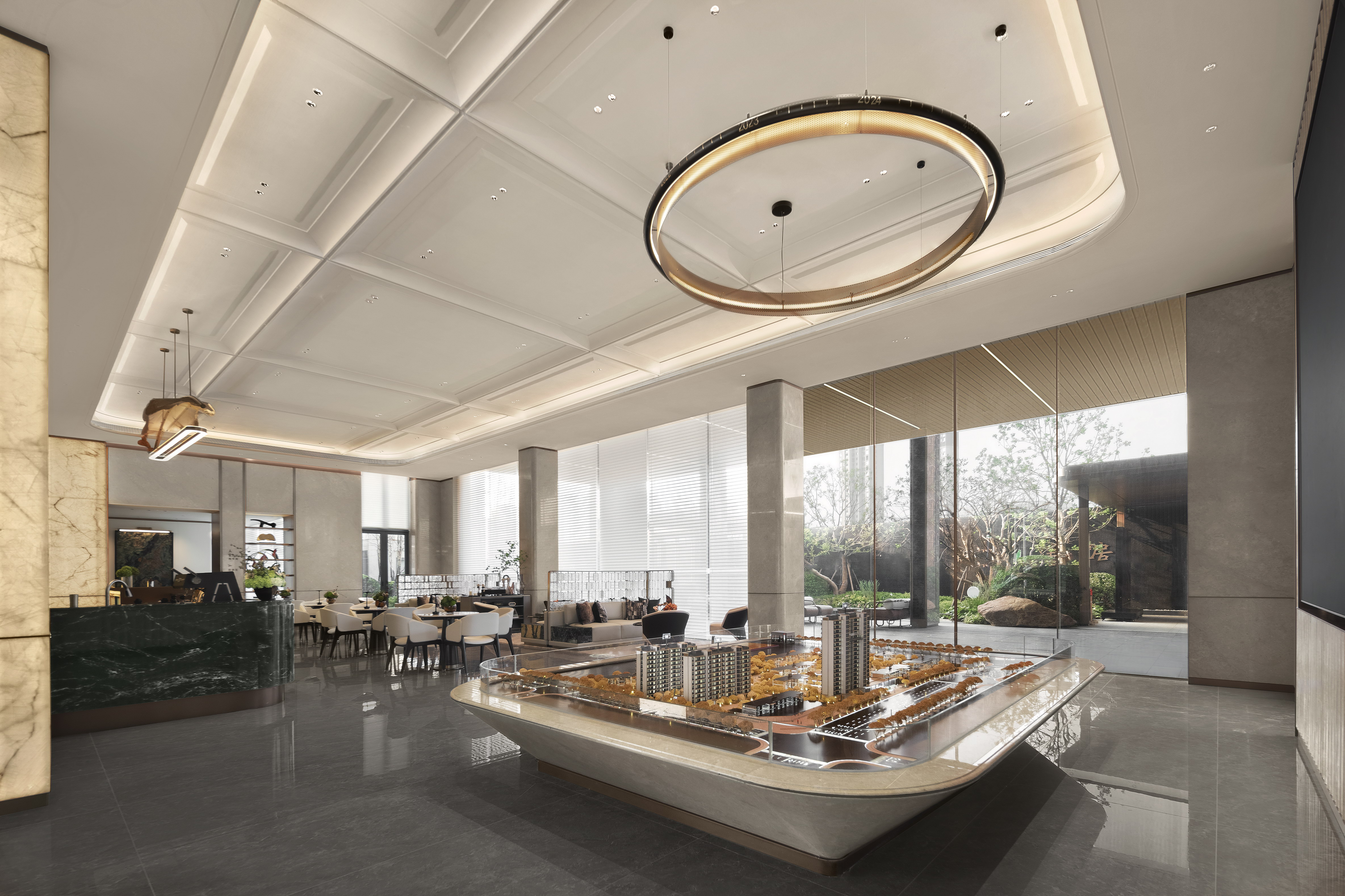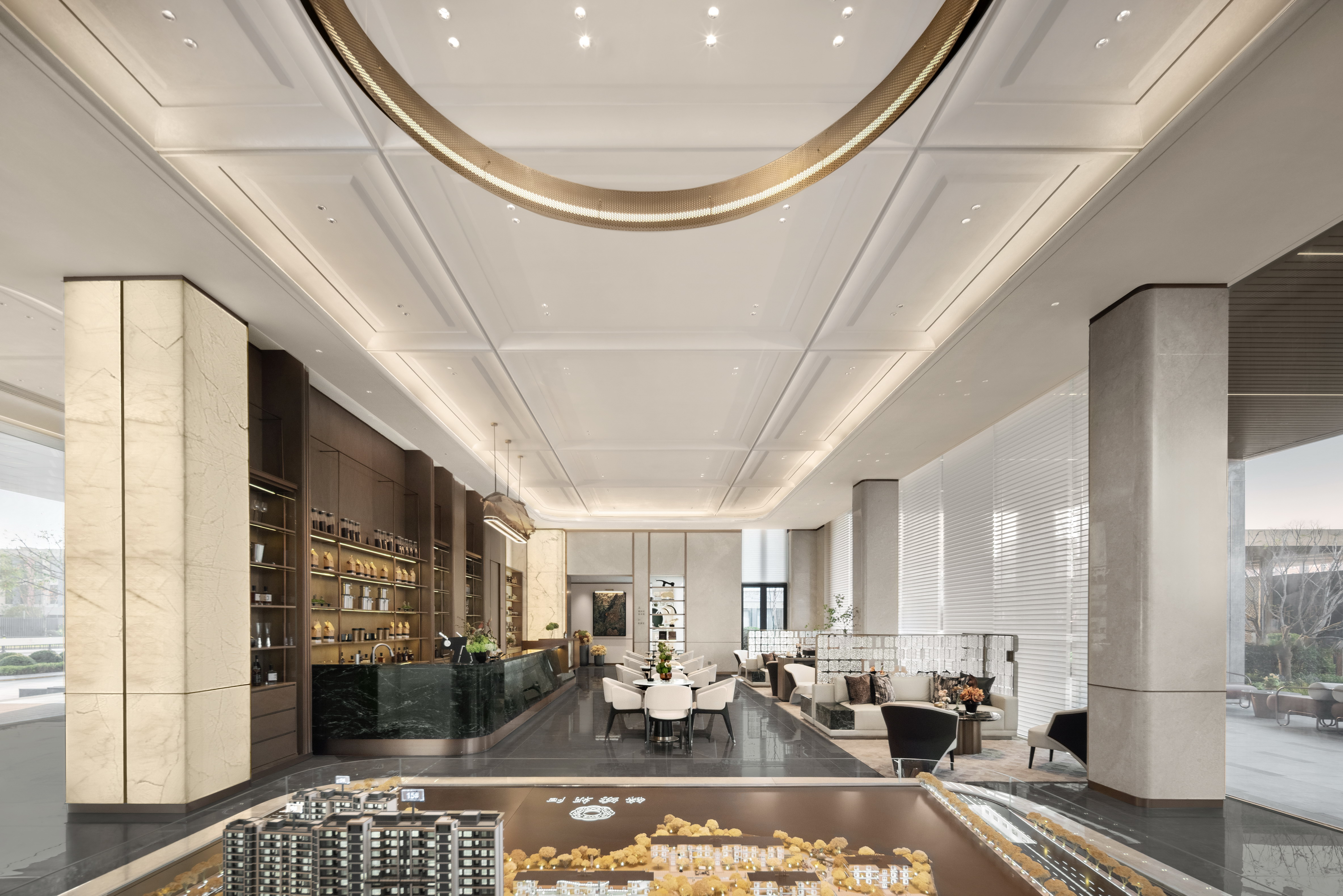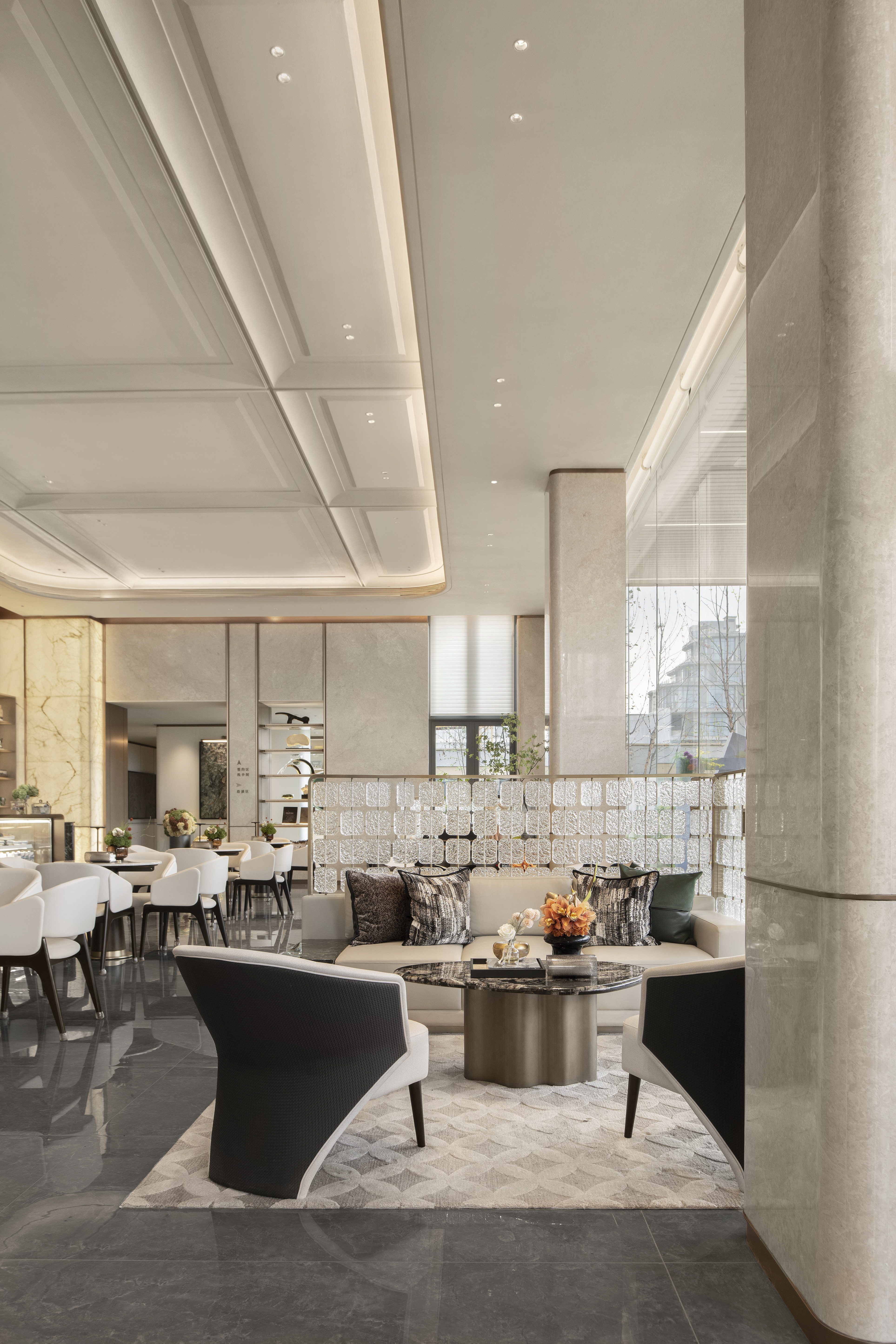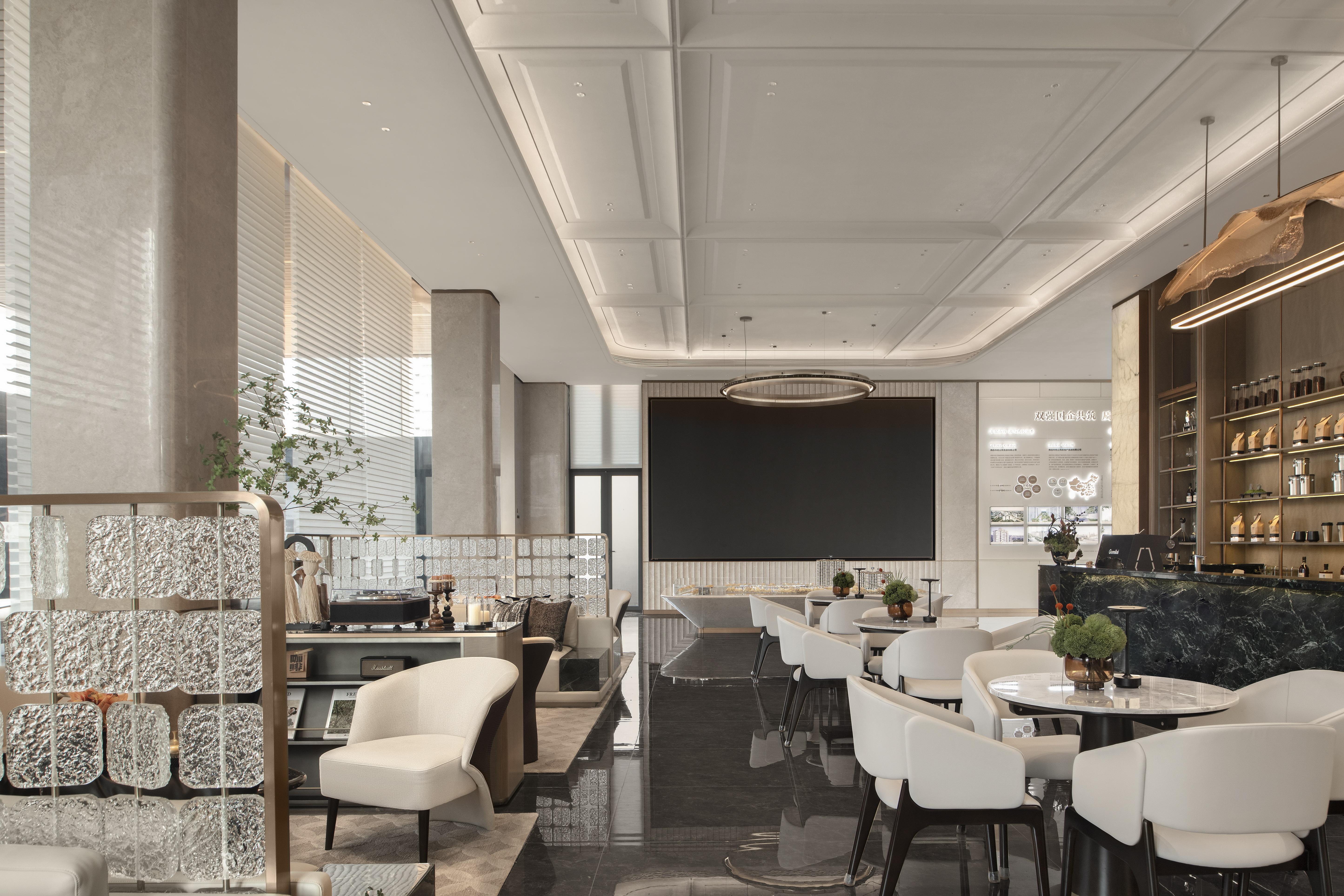 空间布局:销售中心整体设计以精致悦己,向往自然为基调,以低奢、精致、松弛和优雅的美学风格贯穿整体设计. 销售中心空间规划流畅,松弛有道,以“林影拾光”、“轻咖沙龙”、“香草图书馆”、“花语会客厅”,不同场景空间,满足客户的不同需求,并在照明设计精心考量下,营造出温馨而动人的氛围