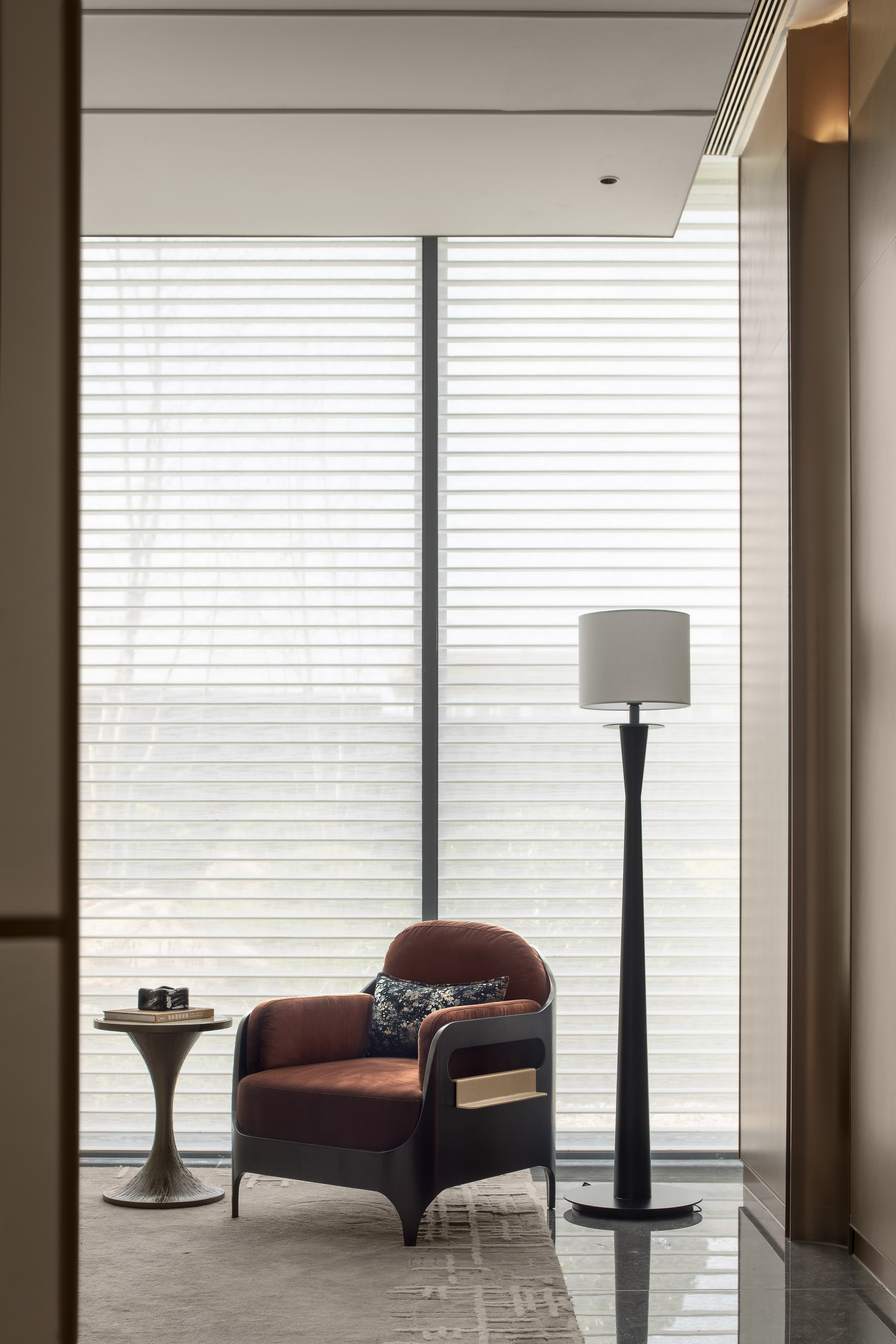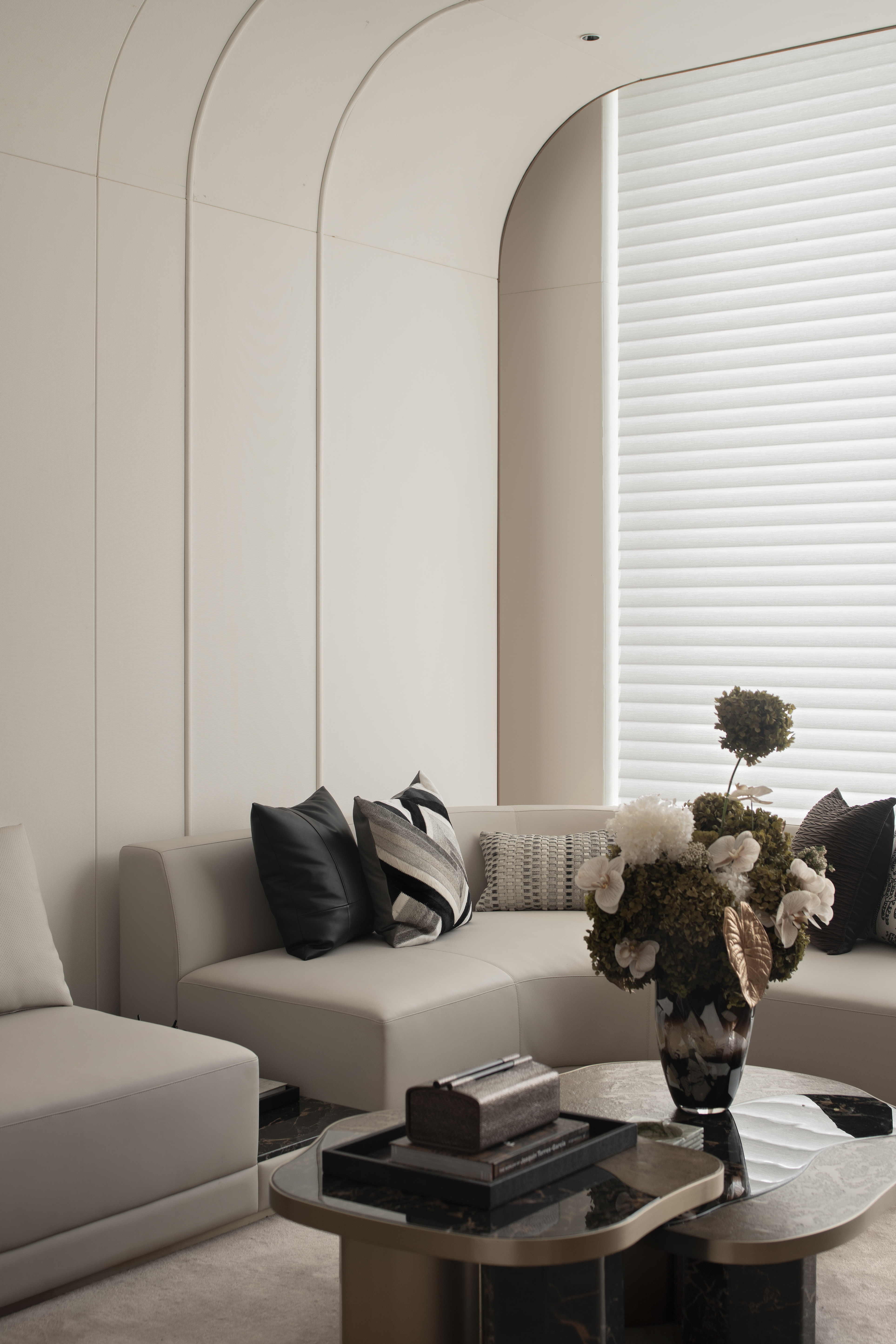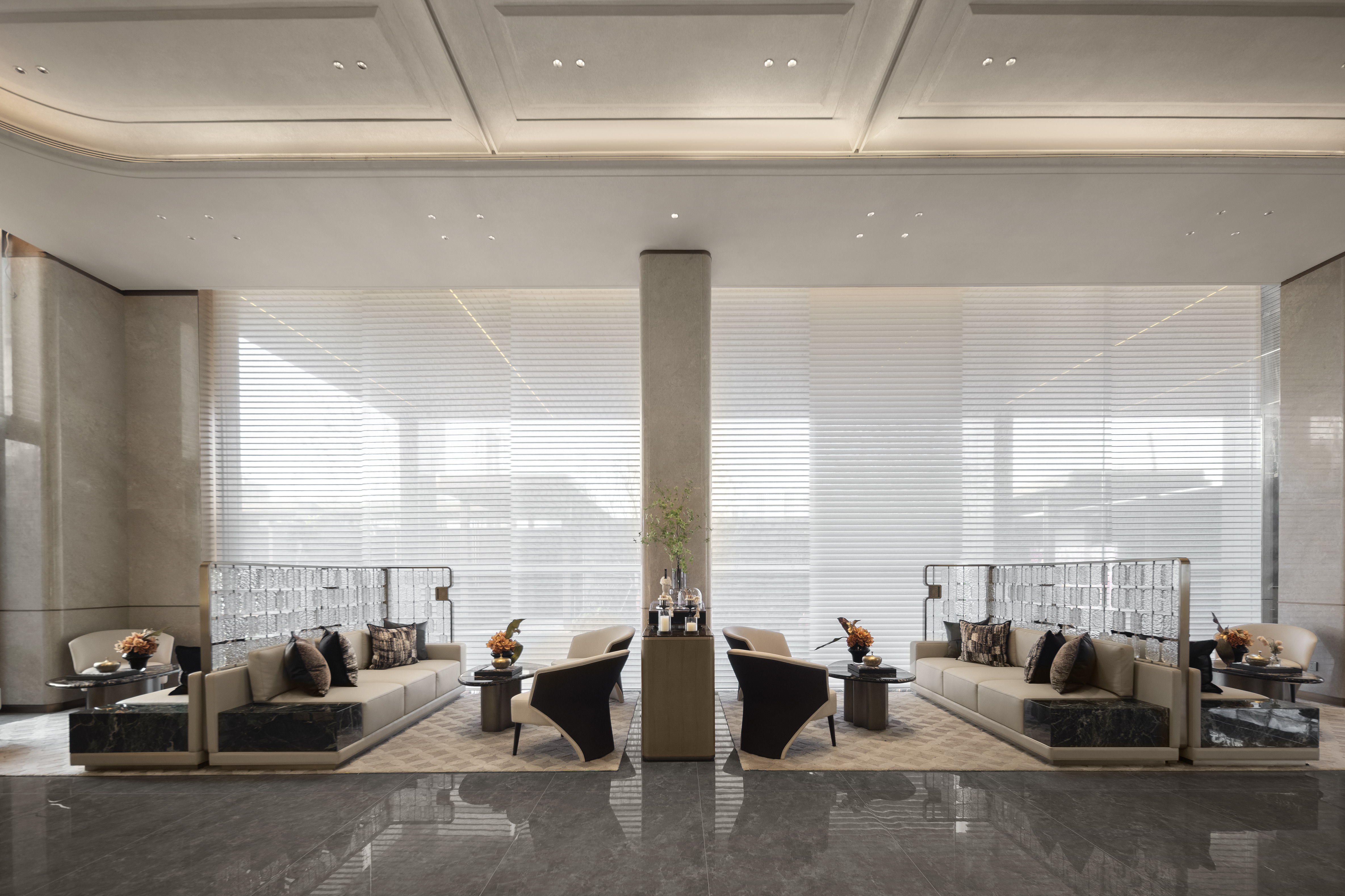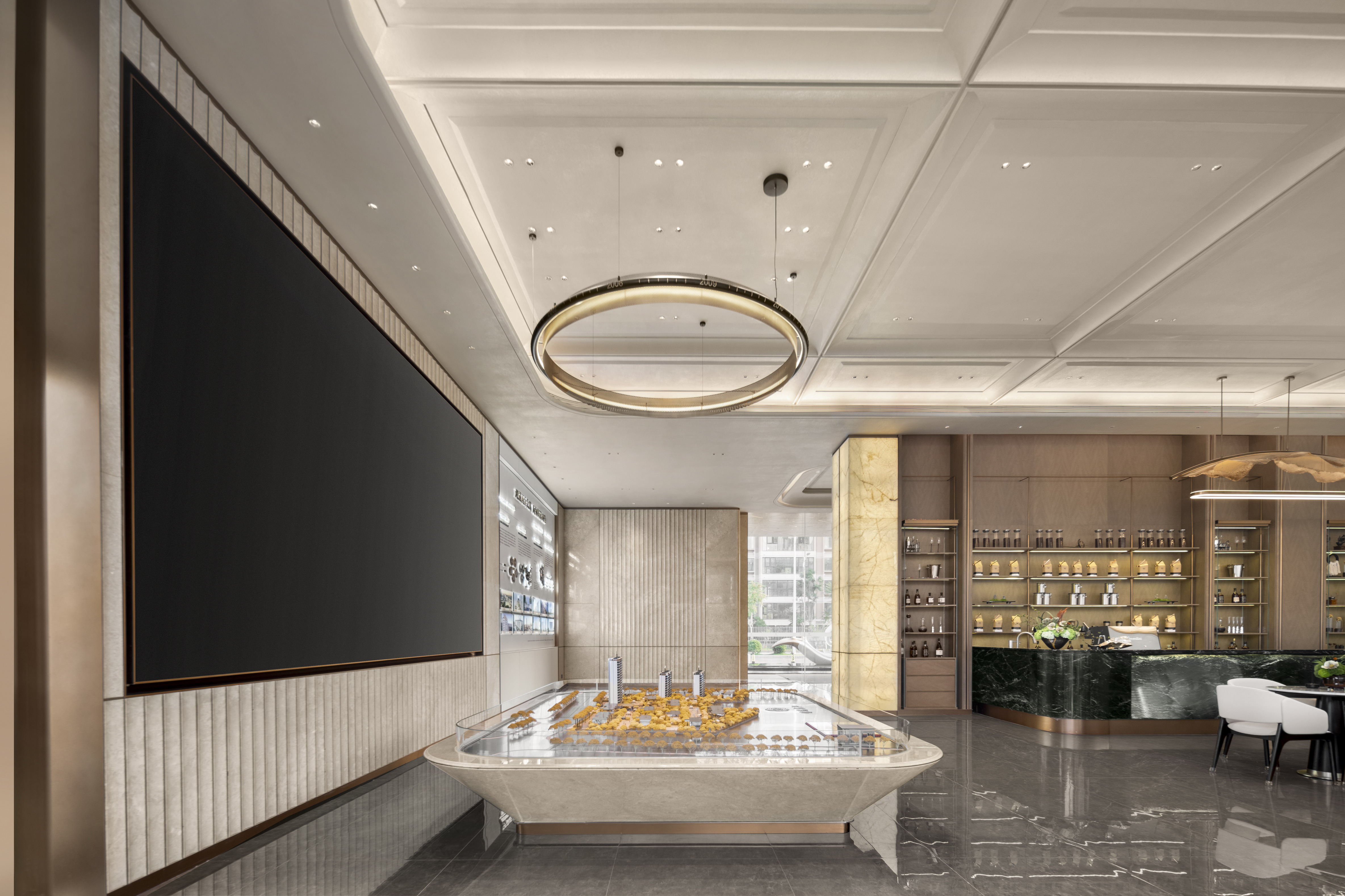 空间布局:销售中心整体设计以精致悦己,向往自然为基调,以低奢、精致、松弛和优雅的美学风格贯穿整体设计. 销售中心空间规划流畅,松弛有道,以“林影拾光”、“轻咖沙龙”、“香草图书馆”、“花语会客厅”,不同场景空间,满足客户的不同需求,并在照明设计精心考量下,营造出温馨而动人的氛围