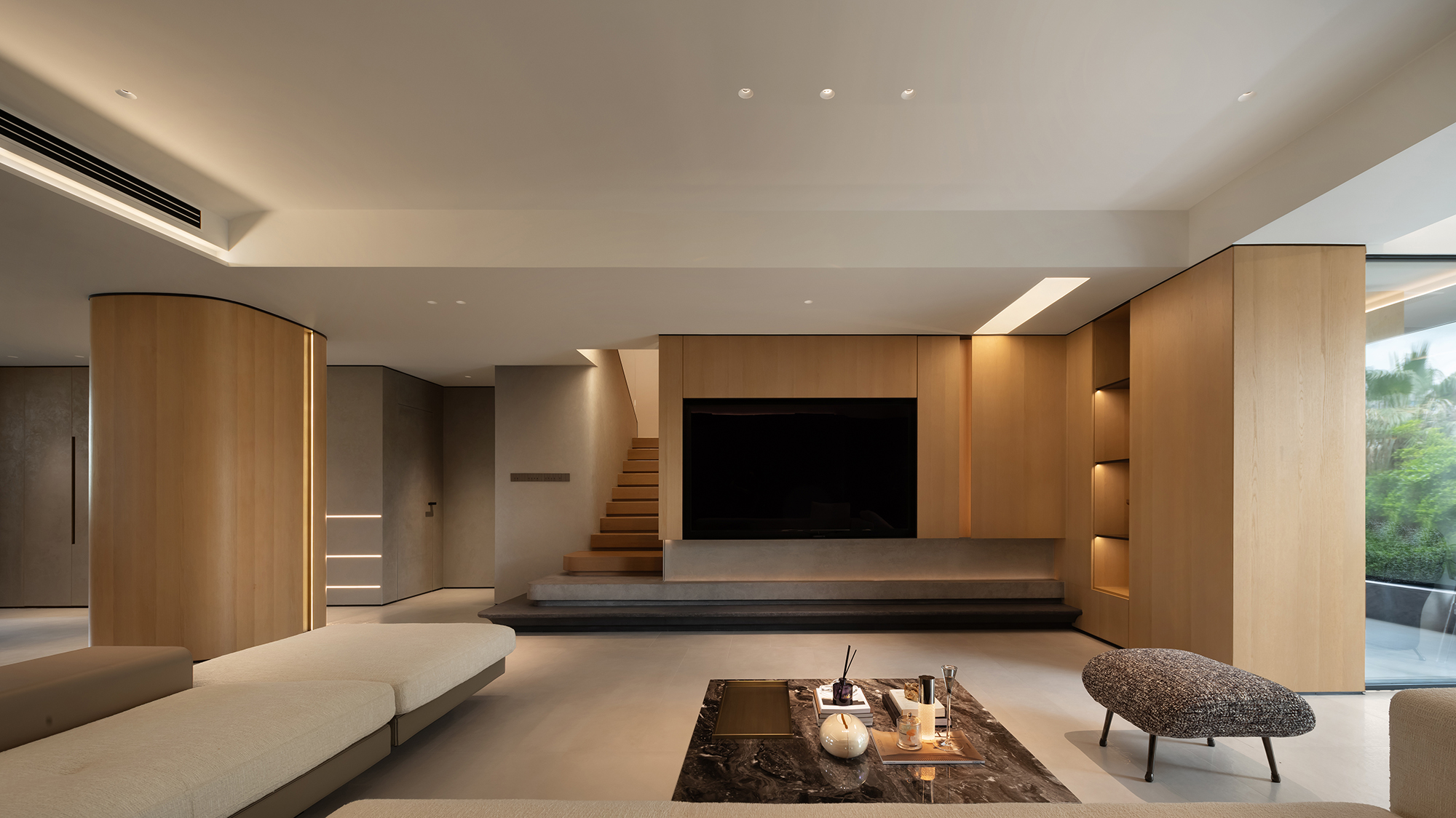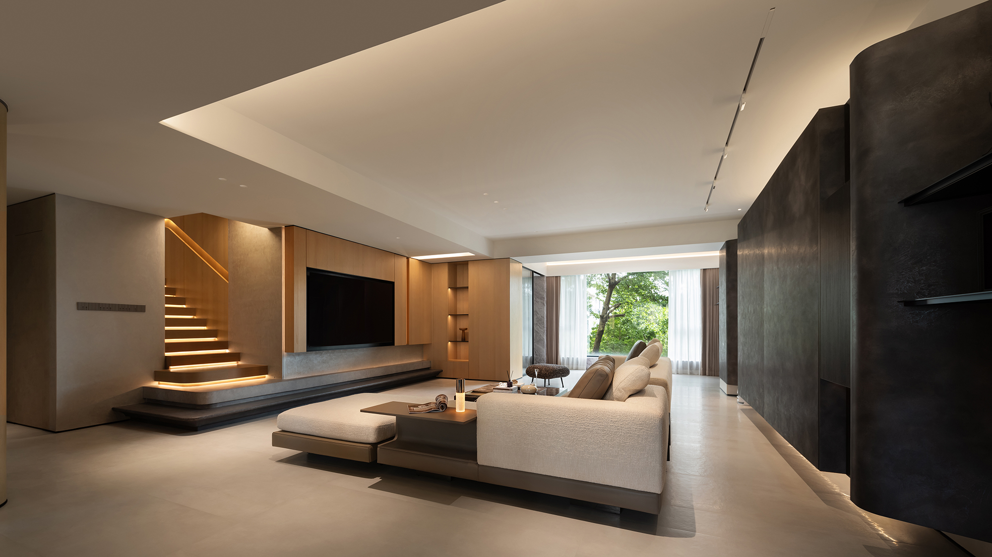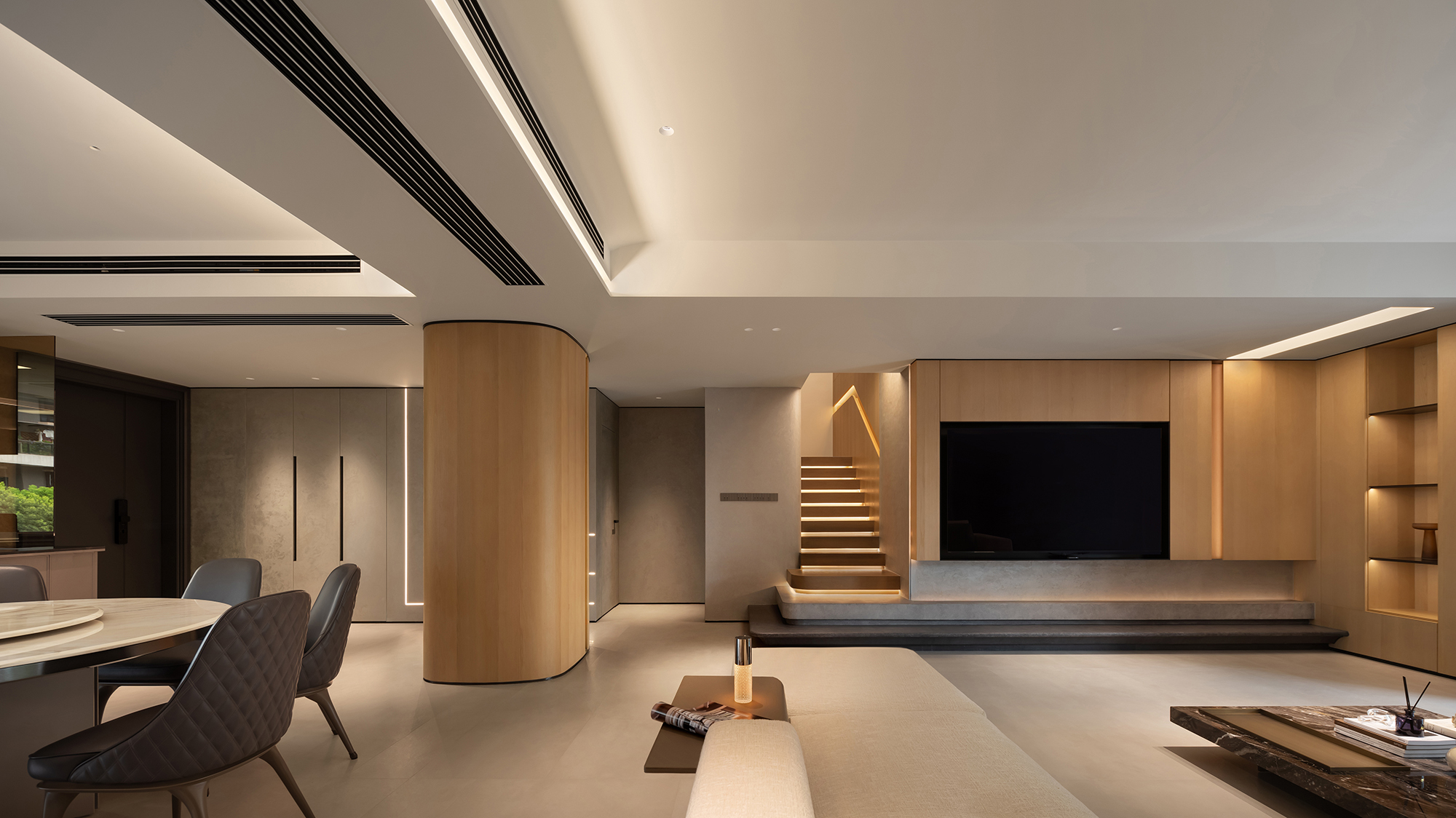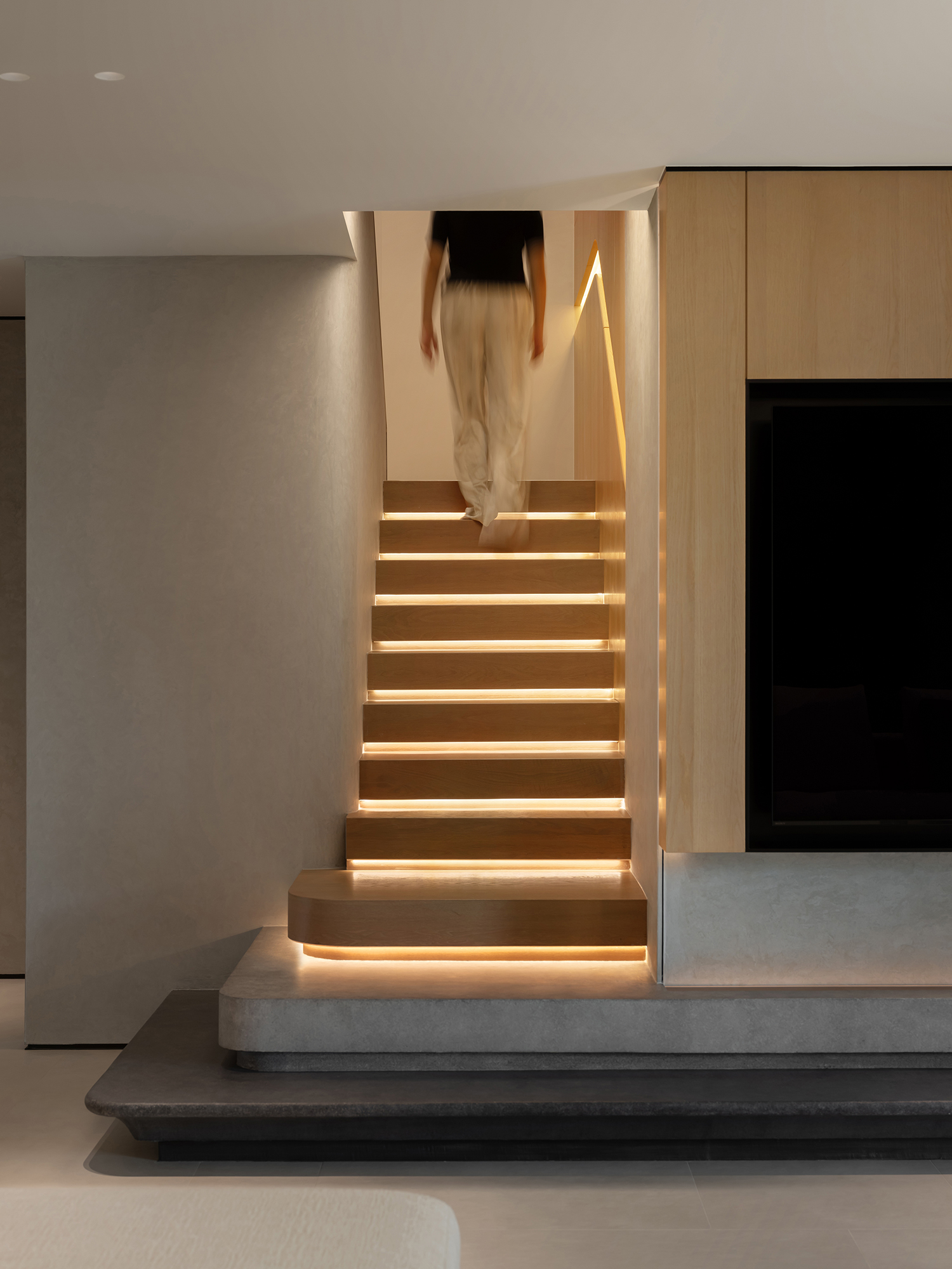 项目定位:本案为352㎡复式私宅,以「叠境」为设计主体,将楼梯这一被结构束缚的交通枢纽转化为空间的精神符号。原始楼梯深藏于角落,踏步狭窄、光线幽暗,在无法移位的前提下,我们将前几阶踏步外移拉伸,形成一道视觉引线。这一巧思不仅破解了局促感,更以建筑雕塑般的韵律重构了上下空间的对话关系,让居住者清晰感知层与层之间呼吸、渗透的动态关联。