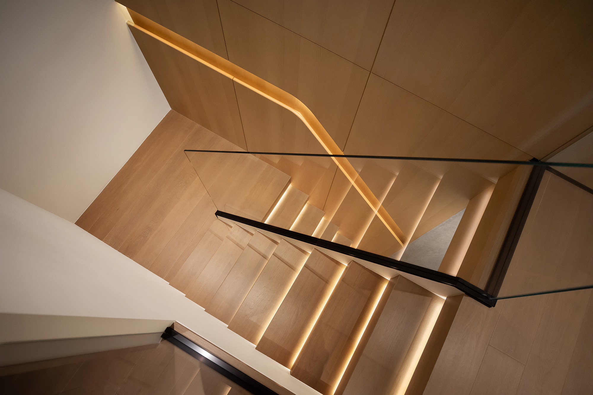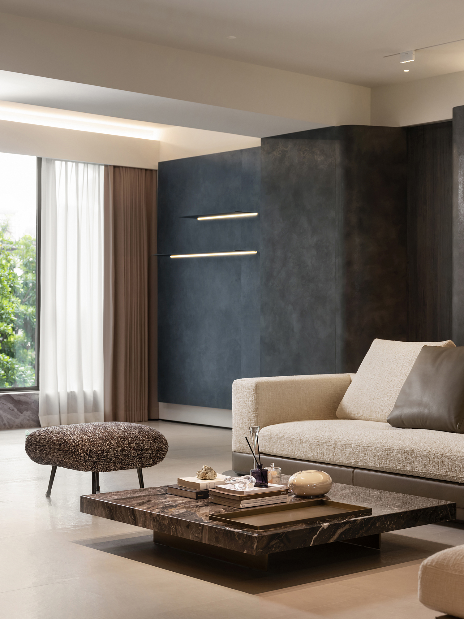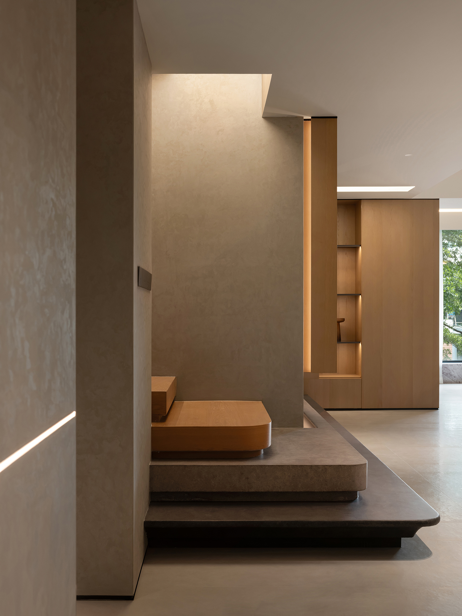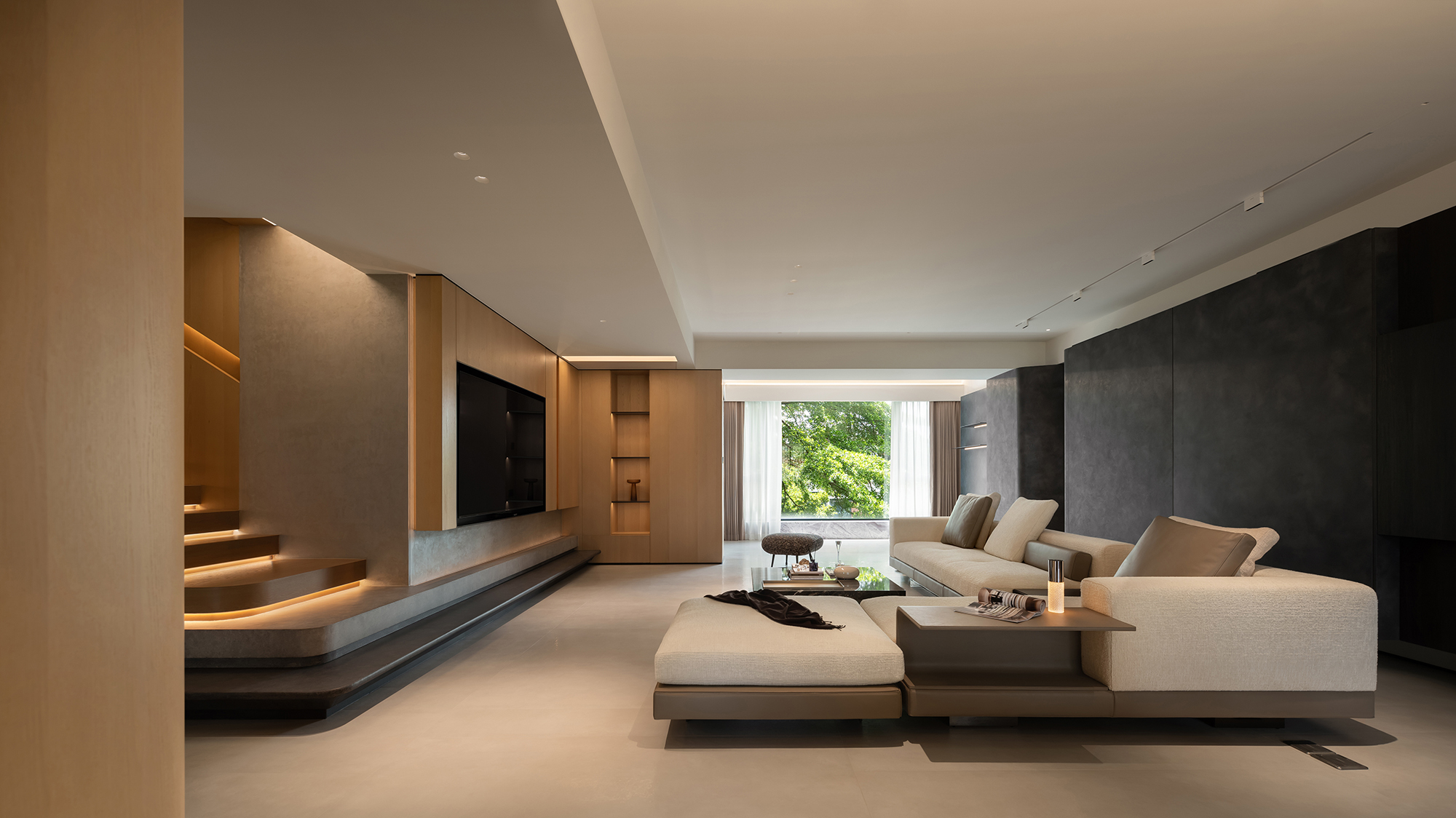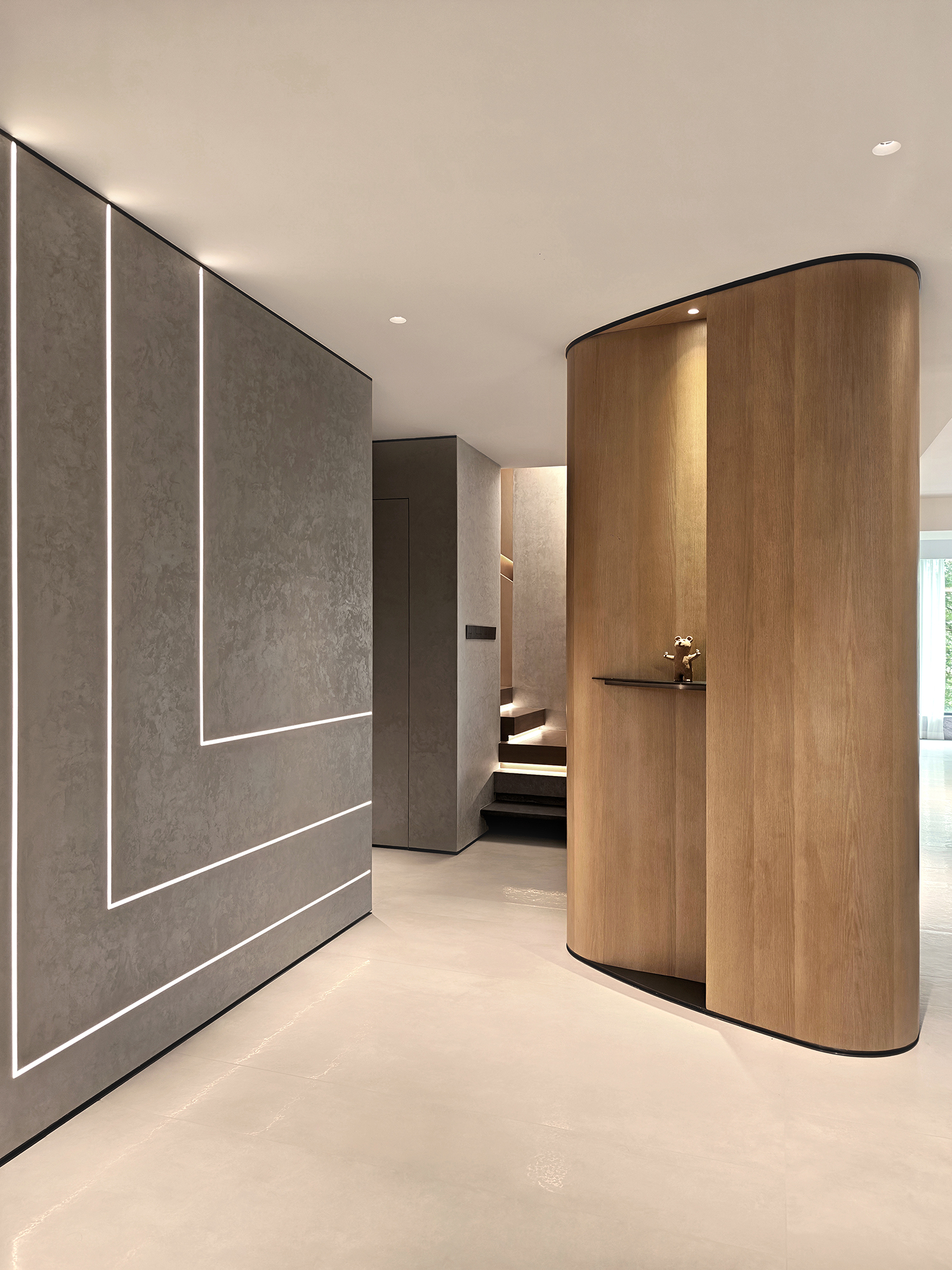 项目定位:本案为352㎡复式私宅,以「叠境」为设计主体,将楼梯这一被结构束缚的交通枢纽转化为空间的精神符号。原始楼梯深藏于角落,踏步狭窄、光线幽暗,在无法移位的前提下,我们将前几阶踏步外移拉伸,形成一道视觉引线。这一巧思不仅破解了局促感,更以建筑雕塑般的韵律重构了上下空间的对话关系,让居住者清晰感知层与层之间呼吸、渗透的动态关联。