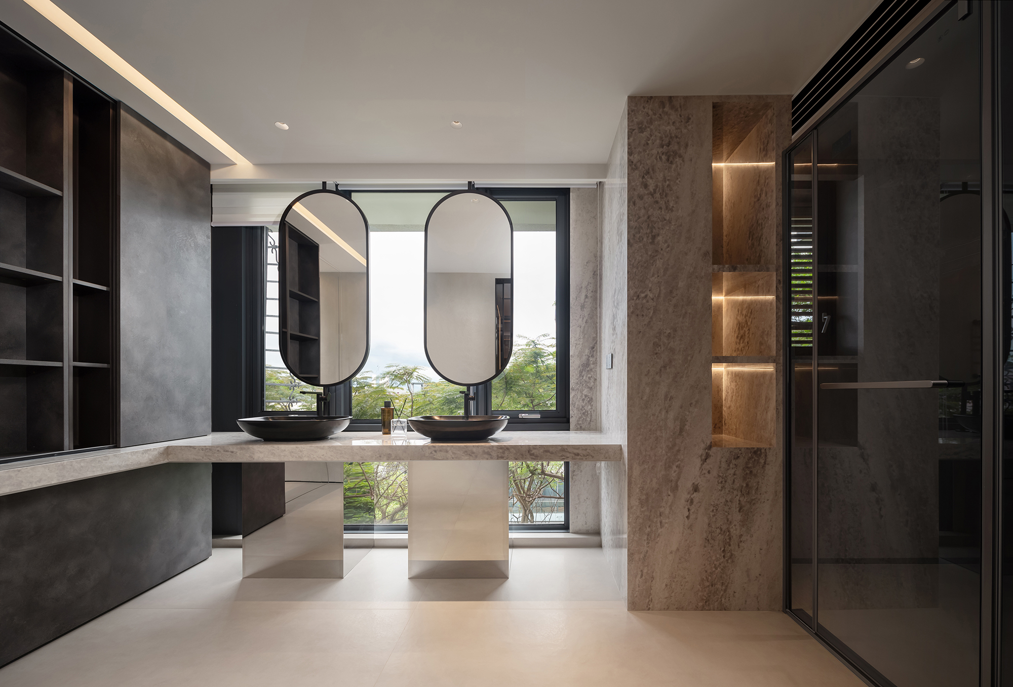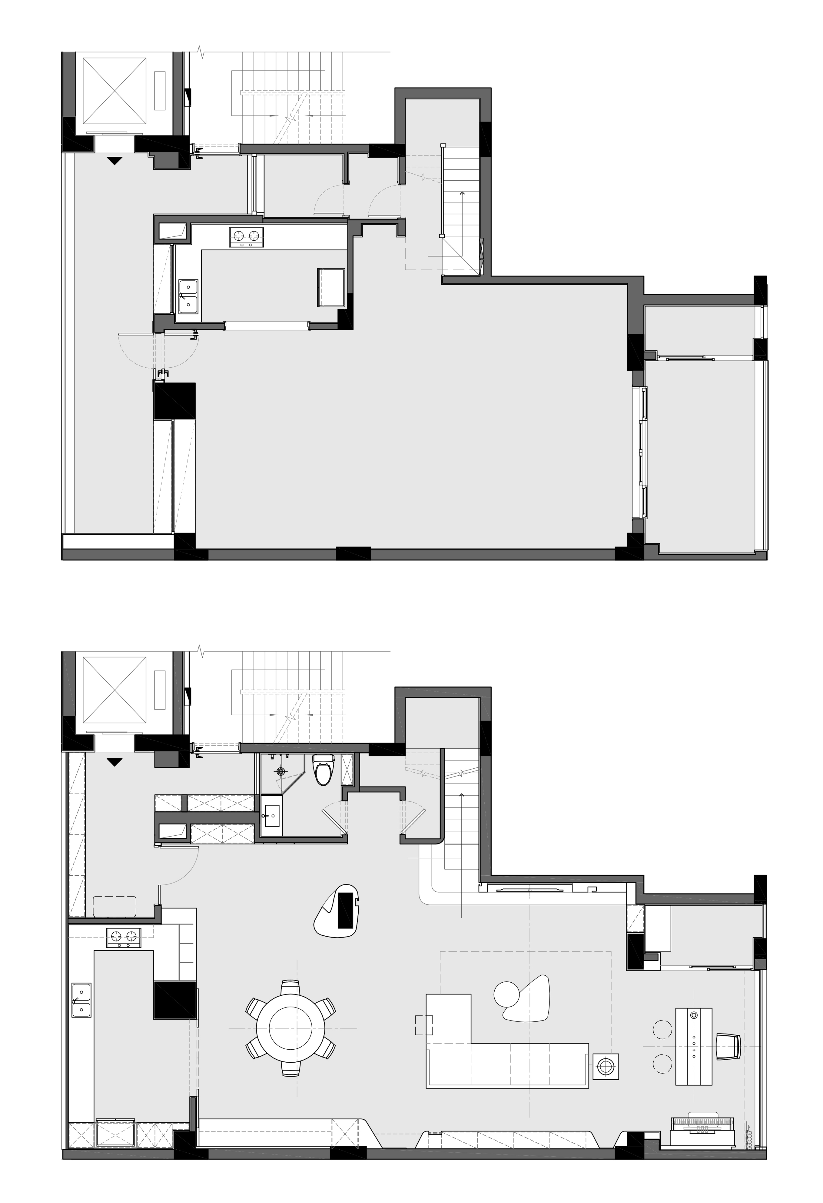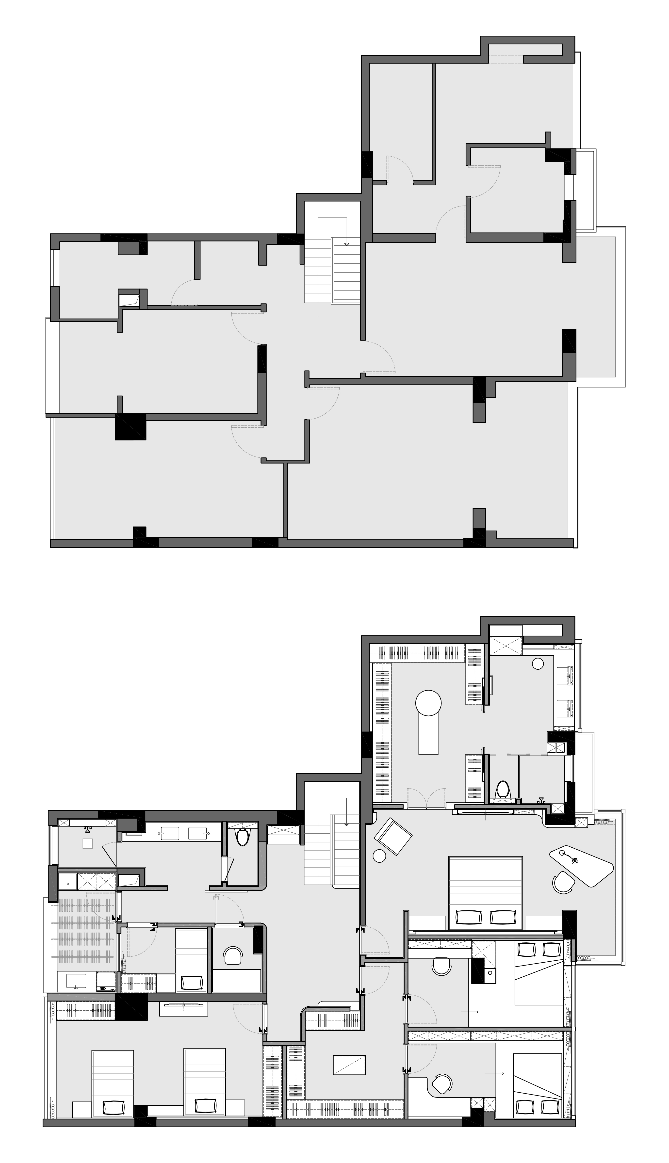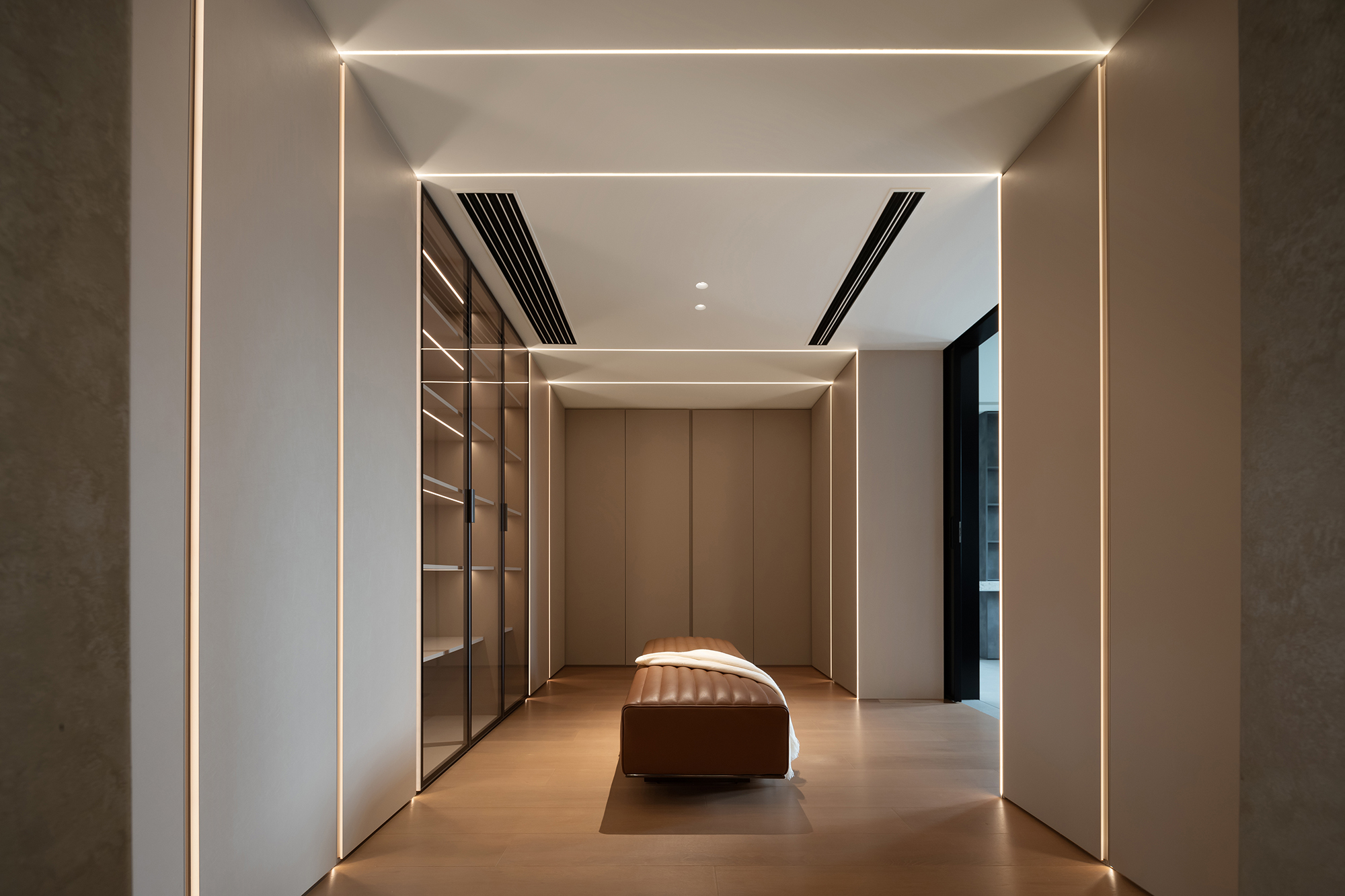 项目定位:本案为352㎡复式私宅,以「叠境」为设计主体,将楼梯这一被结构束缚的交通枢纽转化为空间的精神符号。原始楼梯深藏于角落,踏步狭窄、光线幽暗,在无法移位的前提下,我们将前几阶踏步外移拉伸,形成一道视觉引线。这一巧思不仅破解了局促感,更以建筑雕塑般的韵律重构了上下空间的对话关系,让居住者清晰感知层与层之间呼吸、渗透的动态关联。