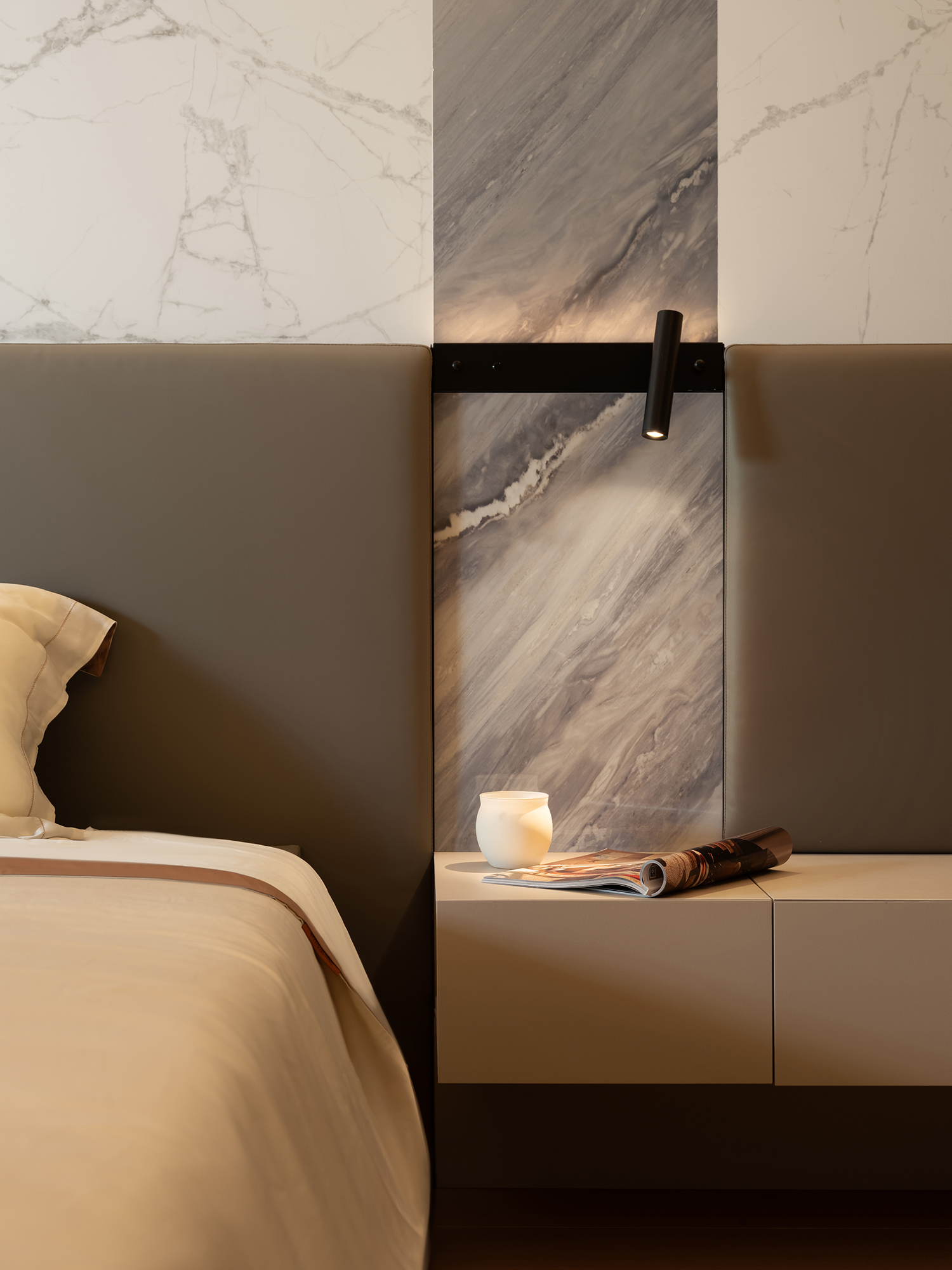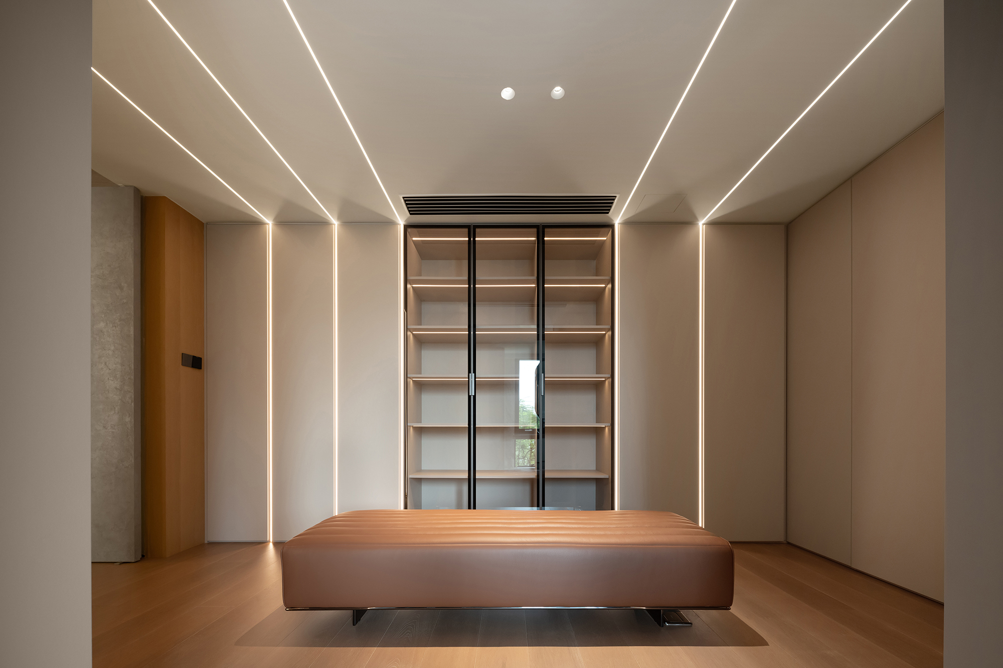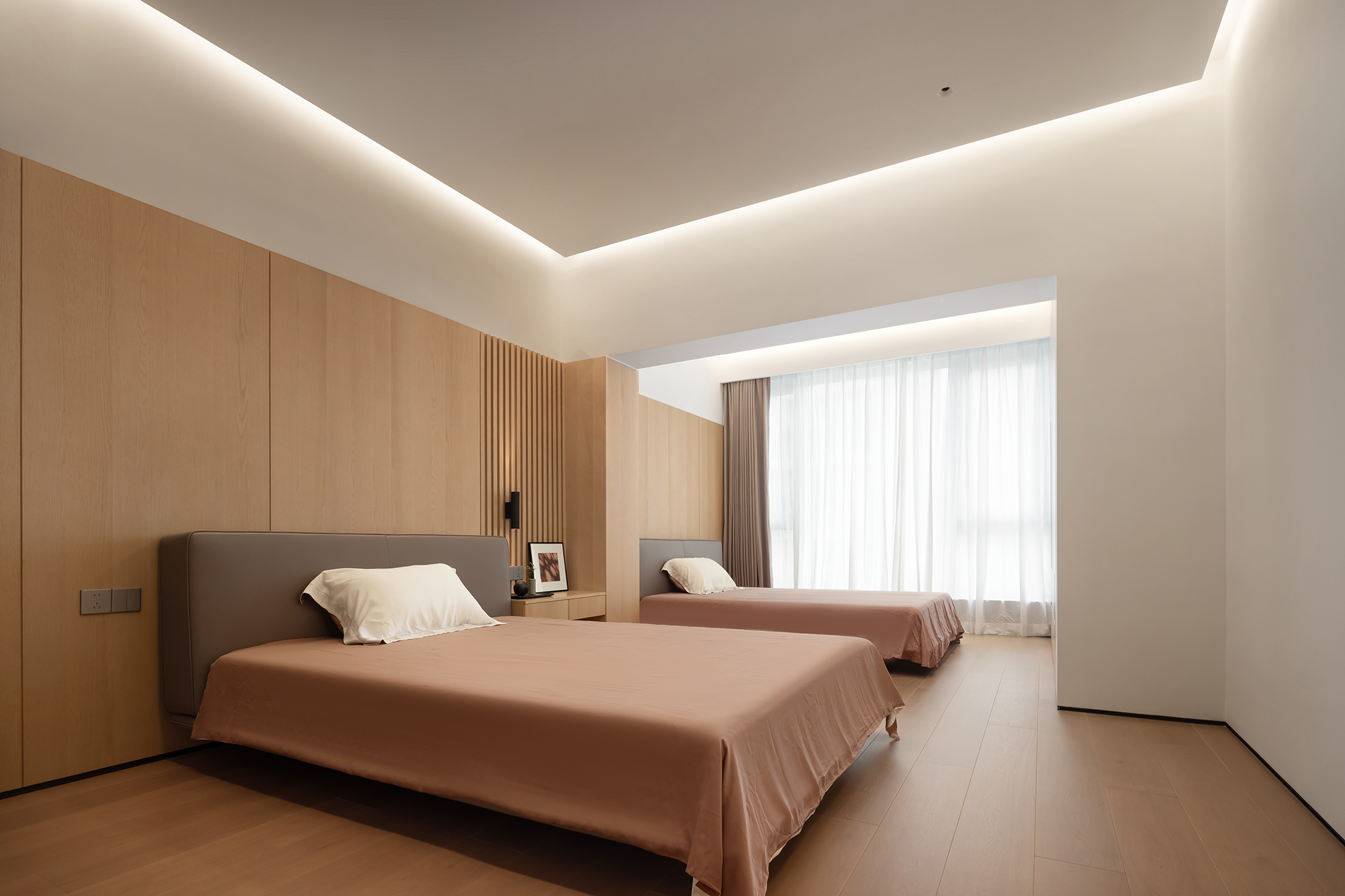 空间布局:一层空间为家庭公共生活区,我们刻意将卫生间和储物间等附属空间压缩在一侧,尽可能地释放出开阔的场域,形成南北通透的开放式格局。二层为家庭睡寝空间,集中布置所有卧室,确保休息的静谧与私密。主卧的不同需求的床头灯、长辈房的双床双柜设计、儿童房的私人卧室和共享中央衣帽间等,整个二层空间都在细致权衡“独立”与“共享”的命题。我们精心构筑的,是既能保护个人专属感,又能塑造家庭归属感的和谐场域。