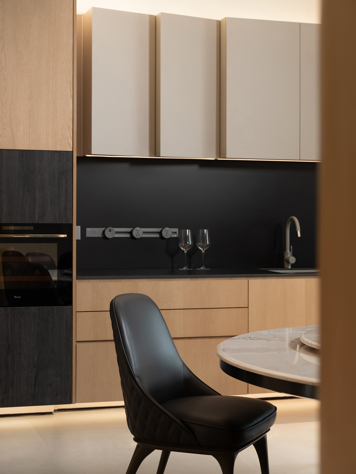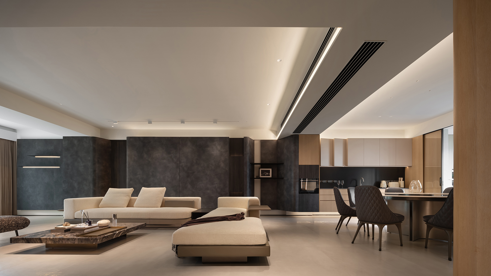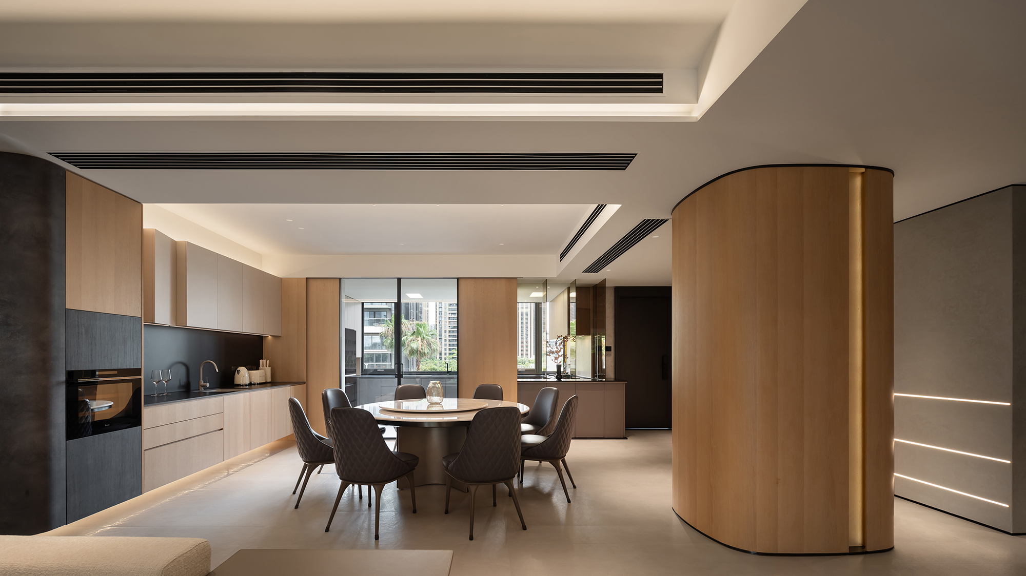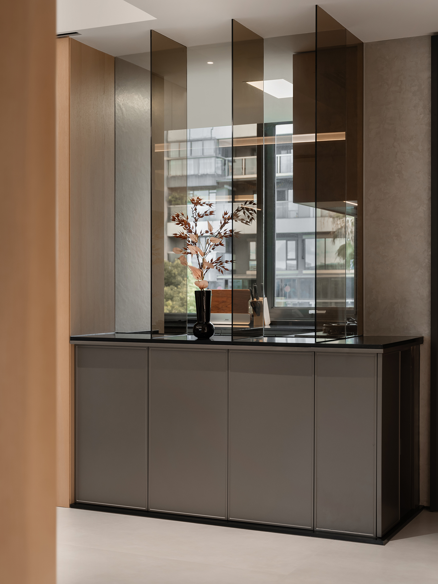 空间意境:沙发背景墙从阳台一直延伸至西厨边柜,流线型的设计打破了满墙柜体的沉闷感。呼应楼梯所带来的节奏感,空间中的部分节点亦融入了立体折叠与重复交映的设计韵律,如玻璃隔断的相互映衬、餐边吊柜的俏皮造型、线性灯的定向指引,都进一步强化了整体空间的建筑感和动态美感。整个空间由此展开一场「叠境」的叙事:灰色基调中浮动着木色肌理,柜体造型与玻璃隔断层叠呼应,在光影中交织出温暖与冷峻的平衡。最终实现现代简约语境下,对居住氛围与建筑美学的双重诠释。