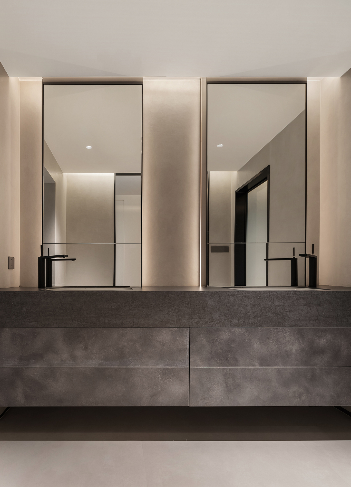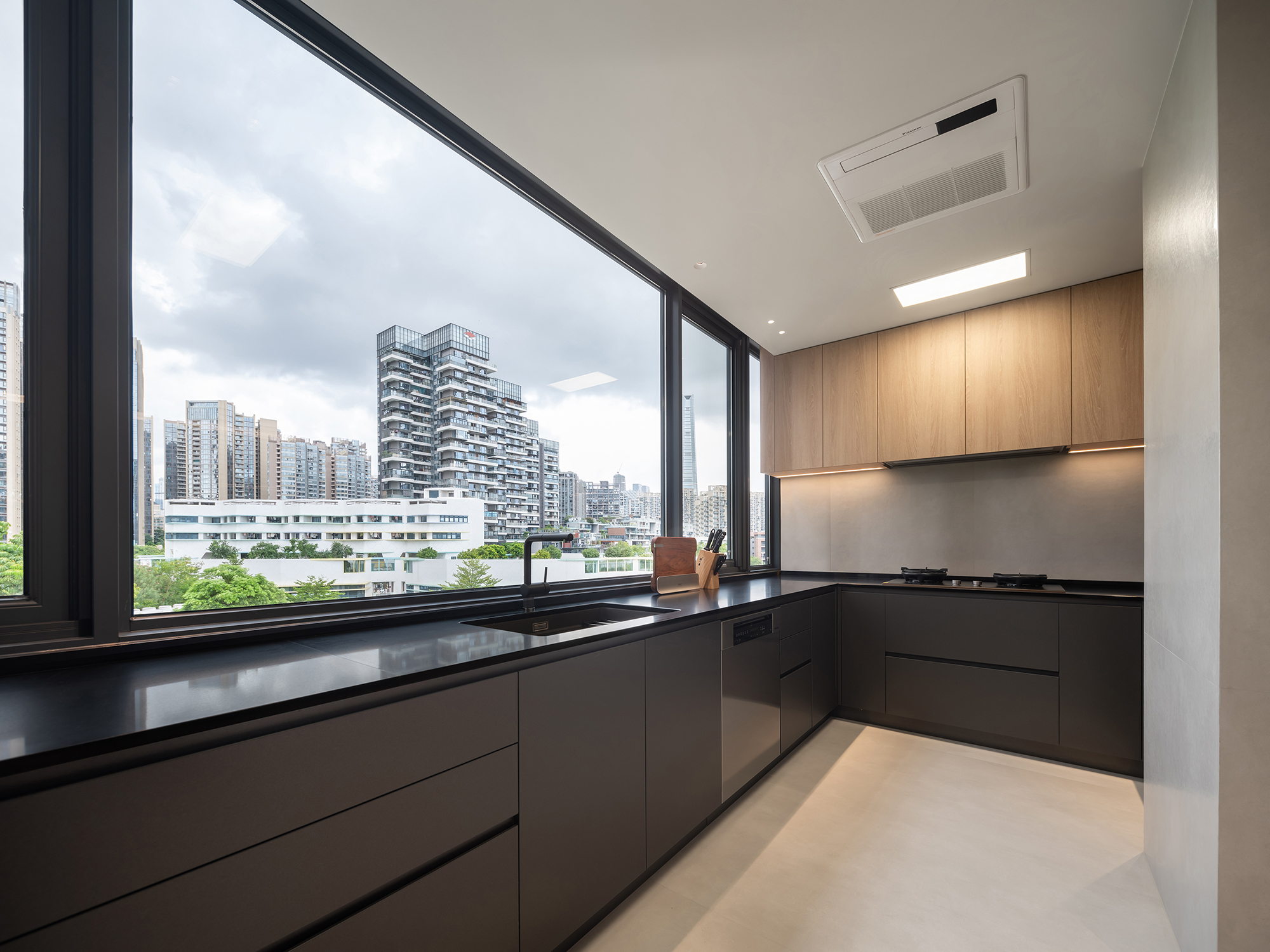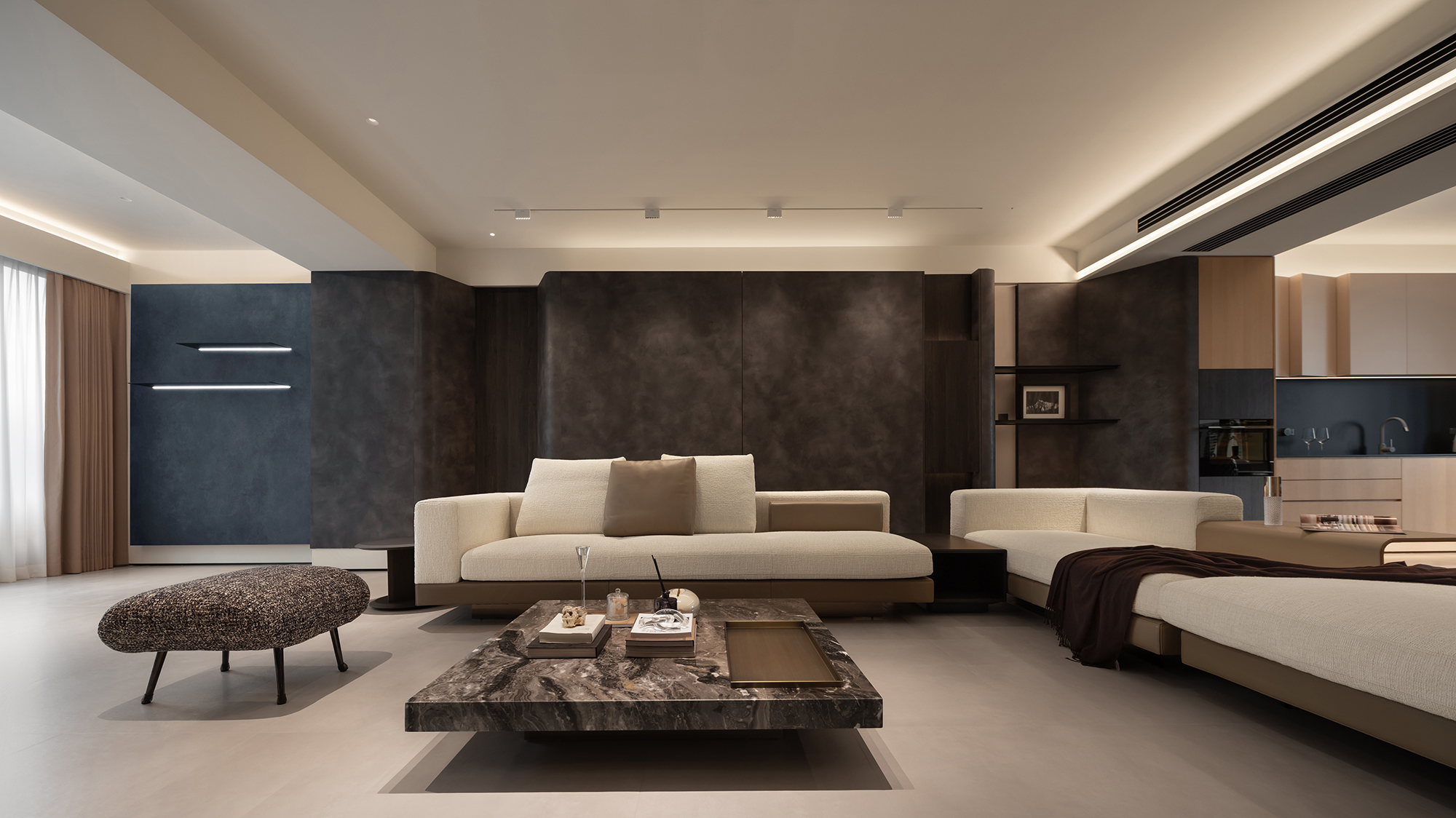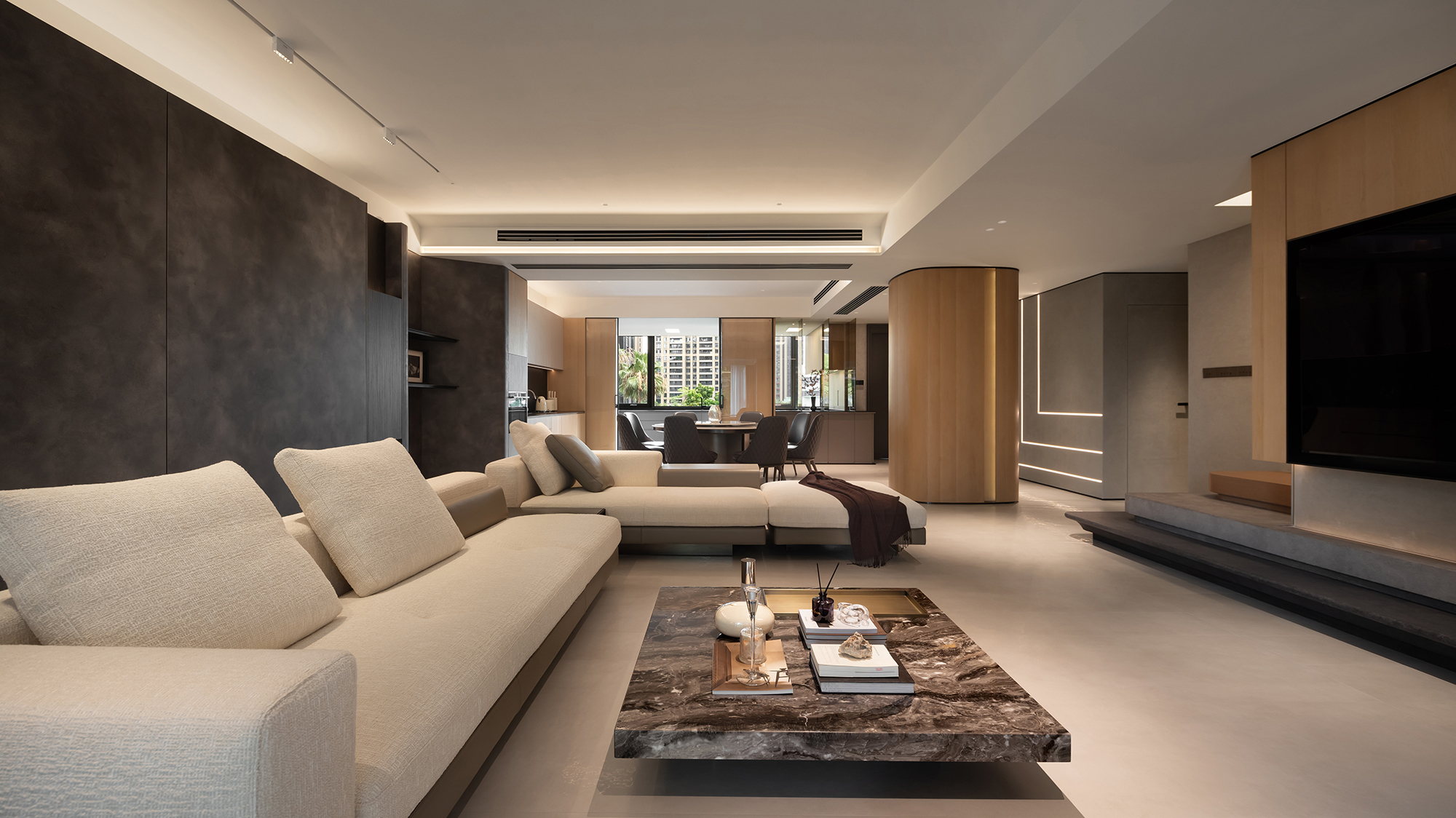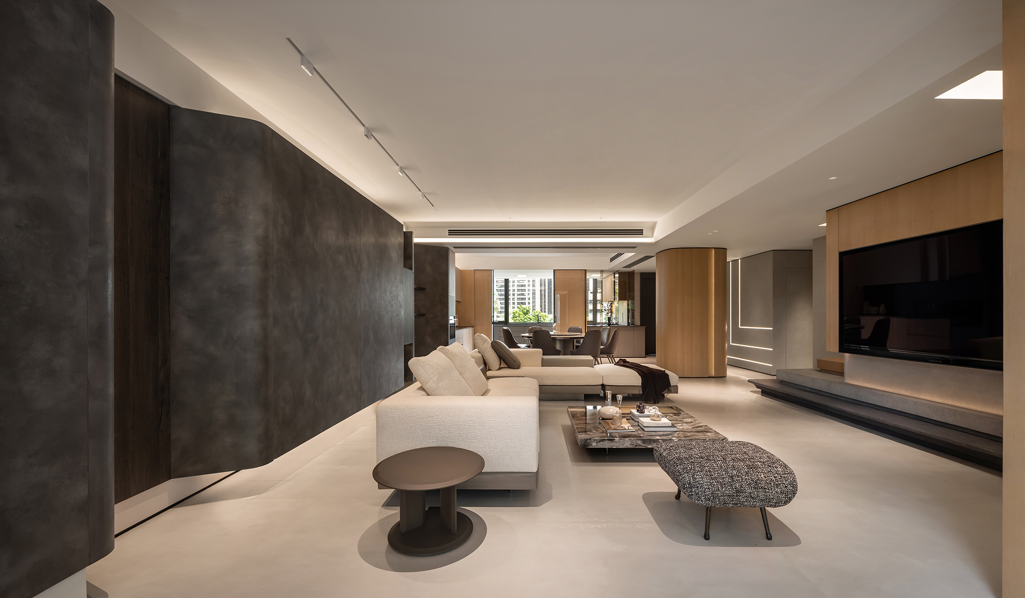 空间意境:沙发背景墙从阳台一直延伸至西厨边柜,流线型的设计打破了满墙柜体的沉闷感。呼应楼梯所带来的节奏感,空间中的部分节点亦融入了立体折叠与重复交映的设计韵律,如玻璃隔断的相互映衬、餐边吊柜的俏皮造型、线性灯的定向指引,都进一步强化了整体空间的建筑感和动态美感。整个空间由此展开一场「叠境」的叙事:灰色基调中浮动着木色肌理,柜体造型与玻璃隔断层叠呼应,在光影中交织出温暖与冷峻的平衡。最终实现现代简约语境下,对居住氛围与建筑美学的双重诠释。