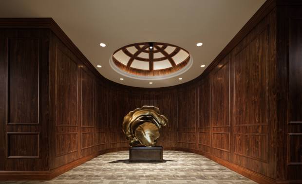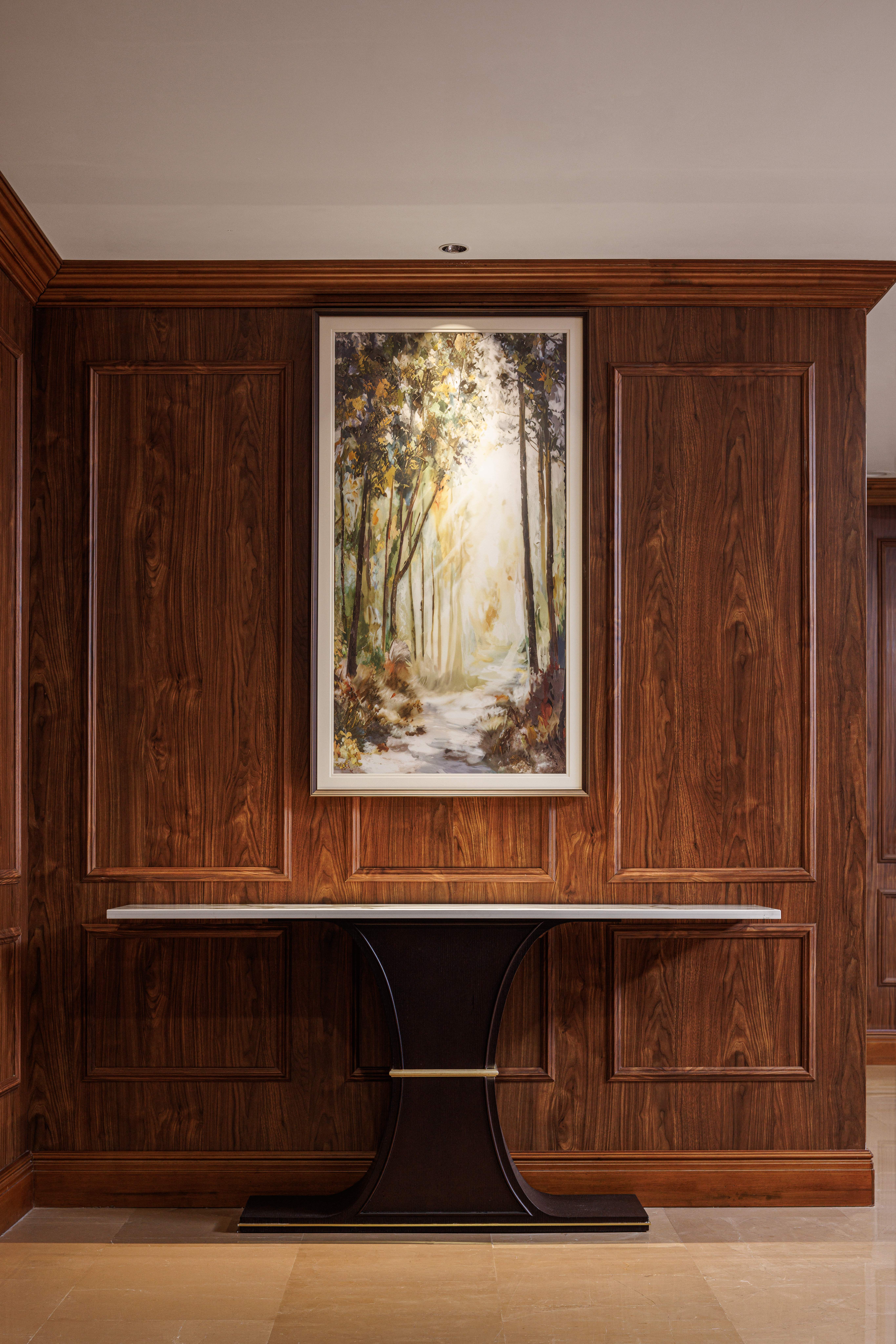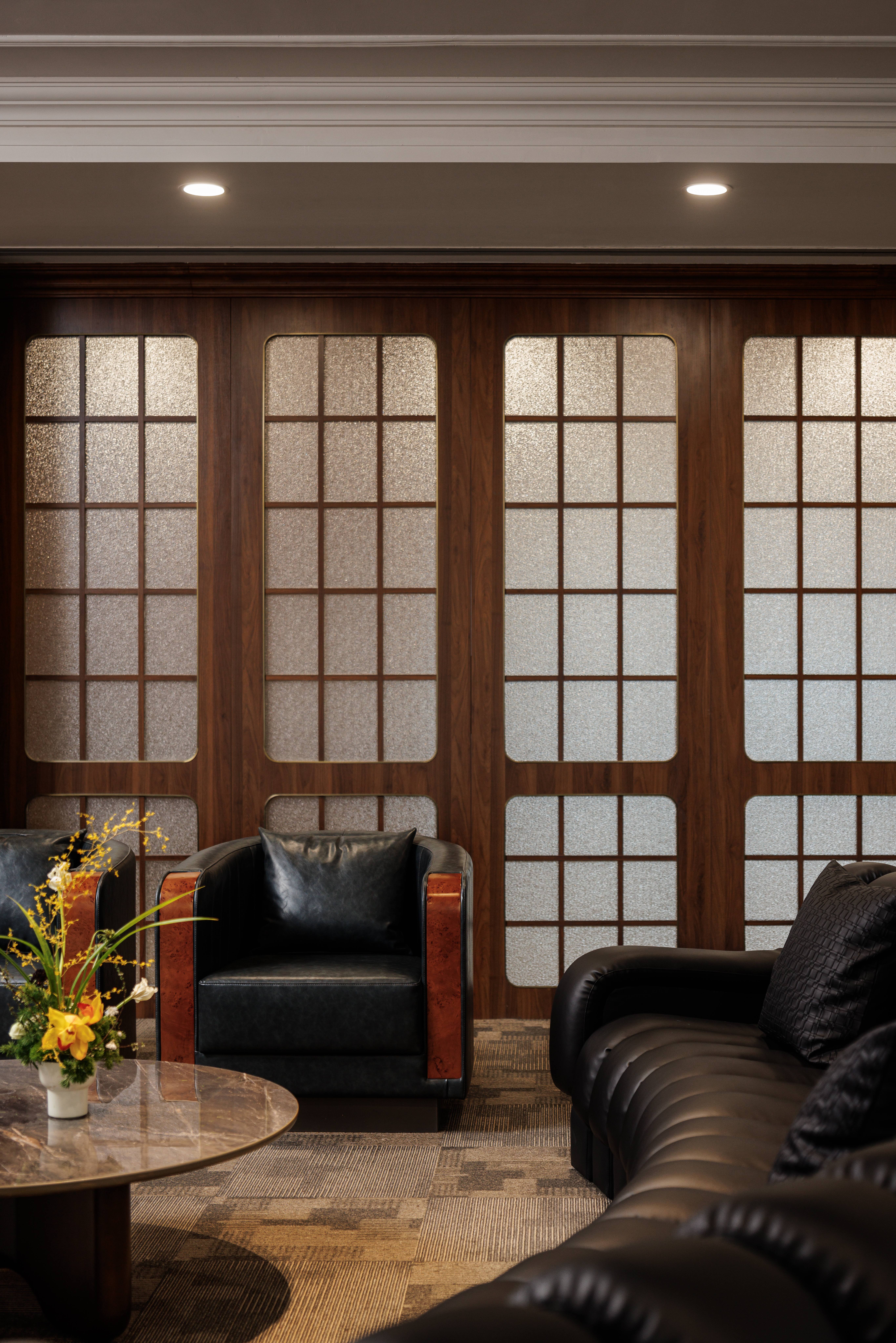 空间意境:此空间的设计灵感汲取上海的优雅姿态。精心规划的矩形吊顶结构和古铜色的应用,加之艺术玻璃隔断,逐步揭开了戏剧的故事演绎。木饰面与木制线条的相互叠加,层层阵列,是海派风格不可或缺的设计语言,既能体现东方文化的内敛雅致,又能展现西方古典的奢华与浪漫,设计师很好的运用秩序性带来空间的仪式感,充分展现银行的开放和包容。