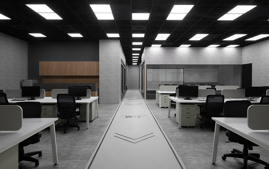 本案为医疗电子企业办公空间,纬纶室内装修设计有限公司 以极简美学为核心,透过深邃炭黑天花板与结构框架的沉稳基调,营造专注内敛的工作氛围;大面积玻璃隔间创造通透视觉界面,搭配灰阶地坪的素淨纹理,有效平衡深色调带来的厚重感受;中央廊道採线性导引与对称佈局强化动线秩序,配合上方的线性灯光营塑未来科技感,并结合开放与私密区域的灵活配置,为工作者打造一处兼具效率、秩序与精緻美学的专业办公场域,充分体现设计师对于空间的敏锐掌控与深厚艺术修养。