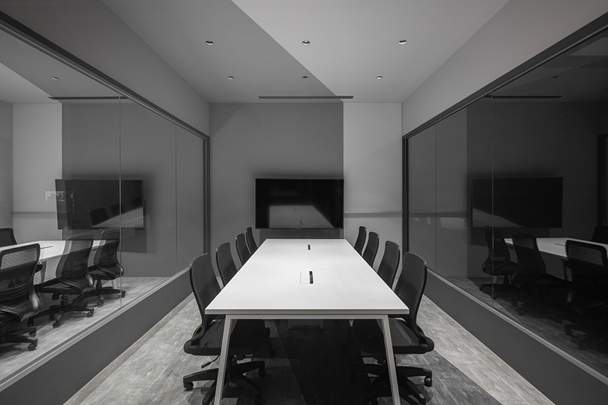 会议室的设计延续整体空间的极简美学理念,大面积的玻璃隔间保证空间的通透性。中央纯白长桌以简约造型为基调,平滑质感创造洁淨视觉,其俐落造型亦与天花、地坪的灰白色几何分割美学相互呼应;黑色会议椅整齐环绕,与白色桌面形成经典对比,营造专业而纯淨的会议氛围。
