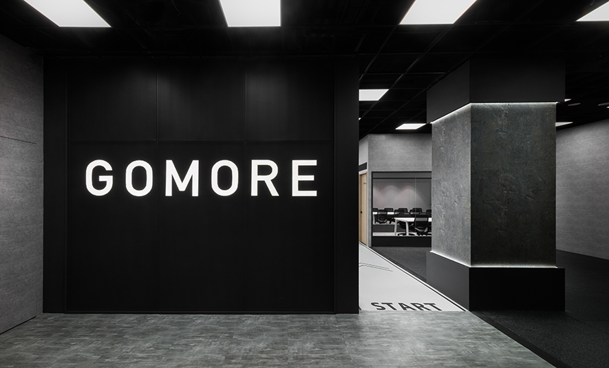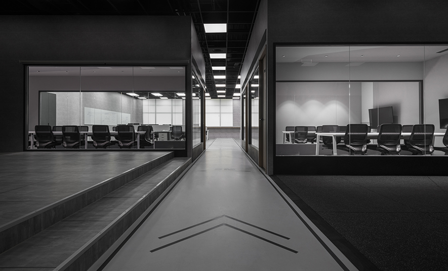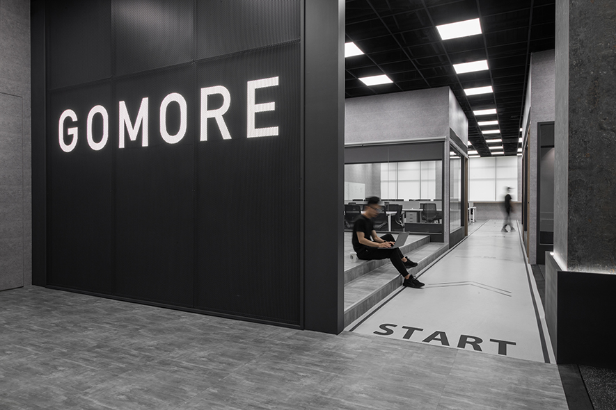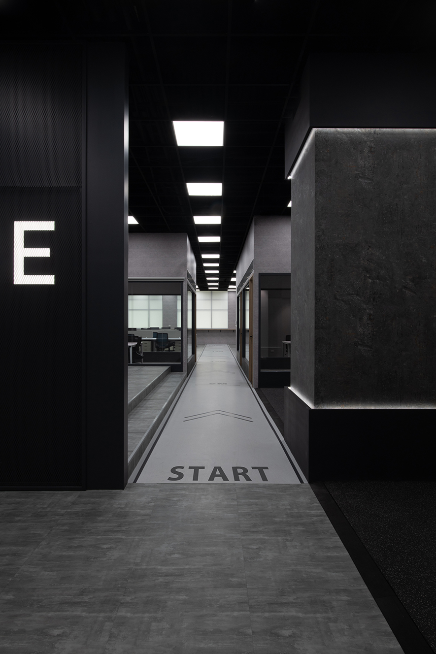 推开玻璃门扉,「GOMORE」品牌标识以简洁有力的白色字体嵌入深色背景,在冲孔板的规律纹理衬托下格外醒目,传达出强烈的品牌辨识度与专业形象。空间的引导系统贯穿上下层次——主通道地面标示着「START」字样,为每次踏入创造仪式感的同时,对应企业致力于运动科学新起点的核心理念;上方LED灯具呈序列分布与之呼应,双重动线系统共同营造强烈透视感,引导视线向前延伸,塑造富有科技感的未来主义氛围。