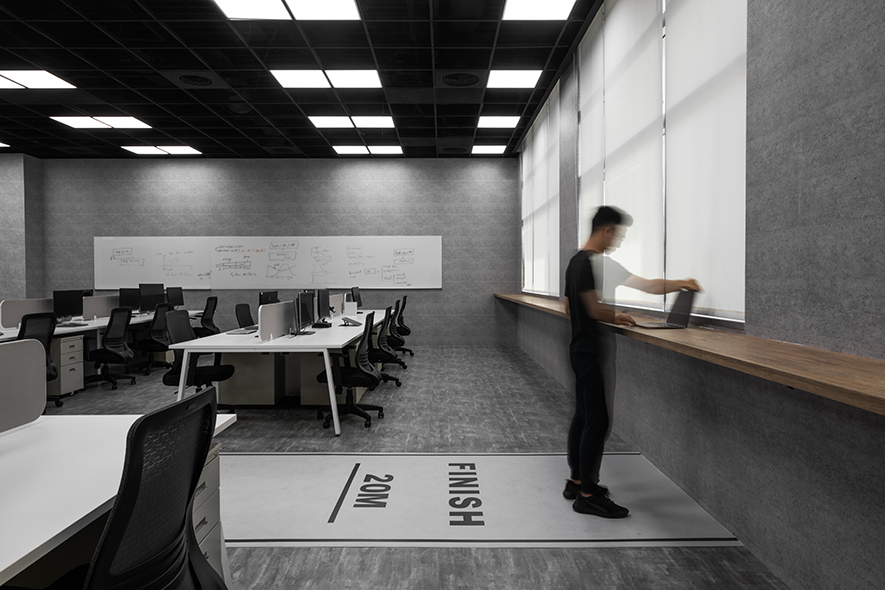 开放式工作区以深灰色牆面与地坪铺陈沉稳基调,洁淨白色桌面搭配黑色座椅构成经典对比配置,在灰调背景中呈现俐落有序的视觉感受,奠定专注而安定的工作氛围。因应多样化工作情境需求,设计整合丰富协作机能:牆面大型白板成为团队交流的核心载体,临窗的木质檯面则提供站立讨论的便利平台。地面「FINISH」标识与入口「START」遥相呼应,透过简洁的符号定义空间的起讫,强化动线的明确性,也为严谨的工作环境增添一丝轻鬆的设计巧思。