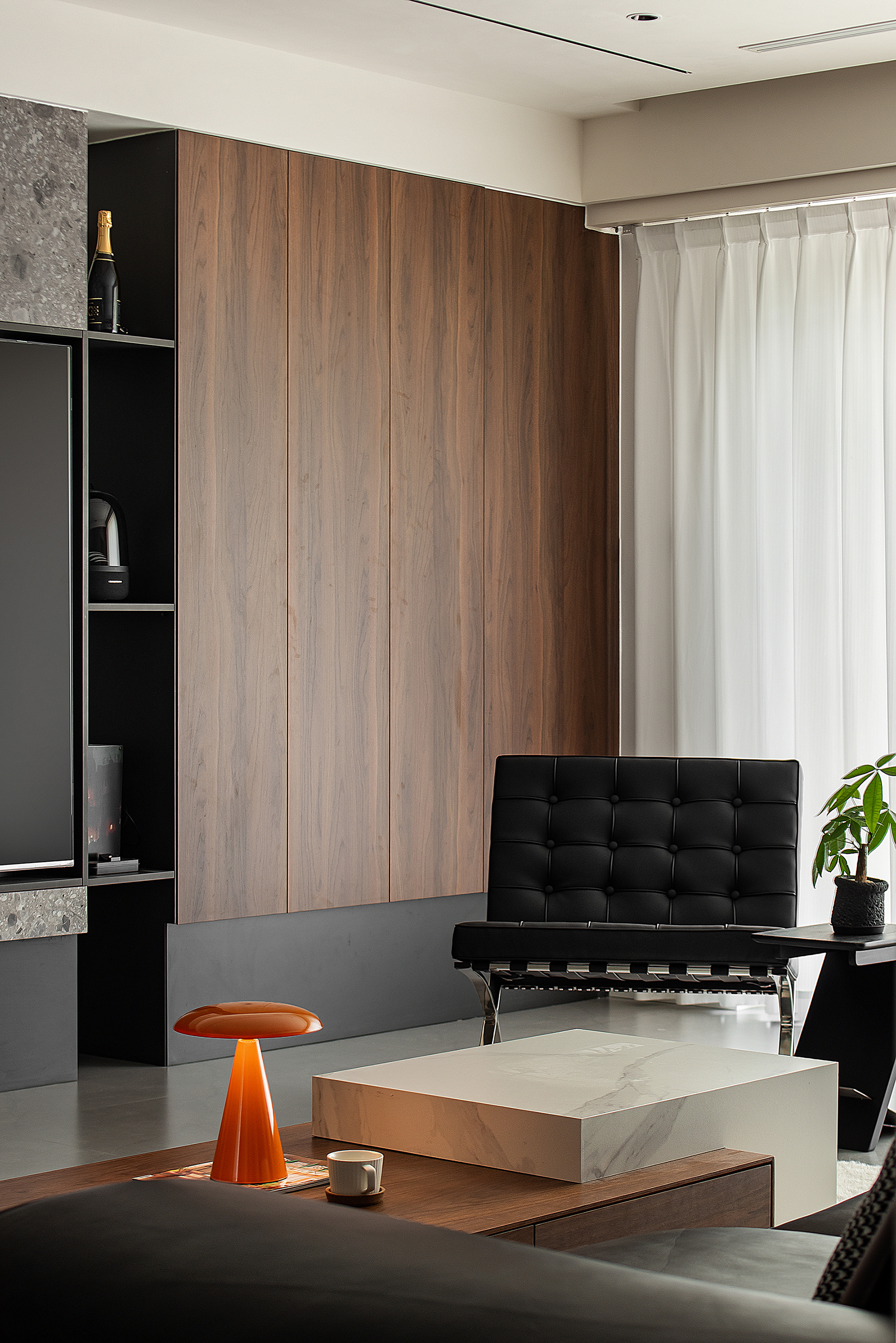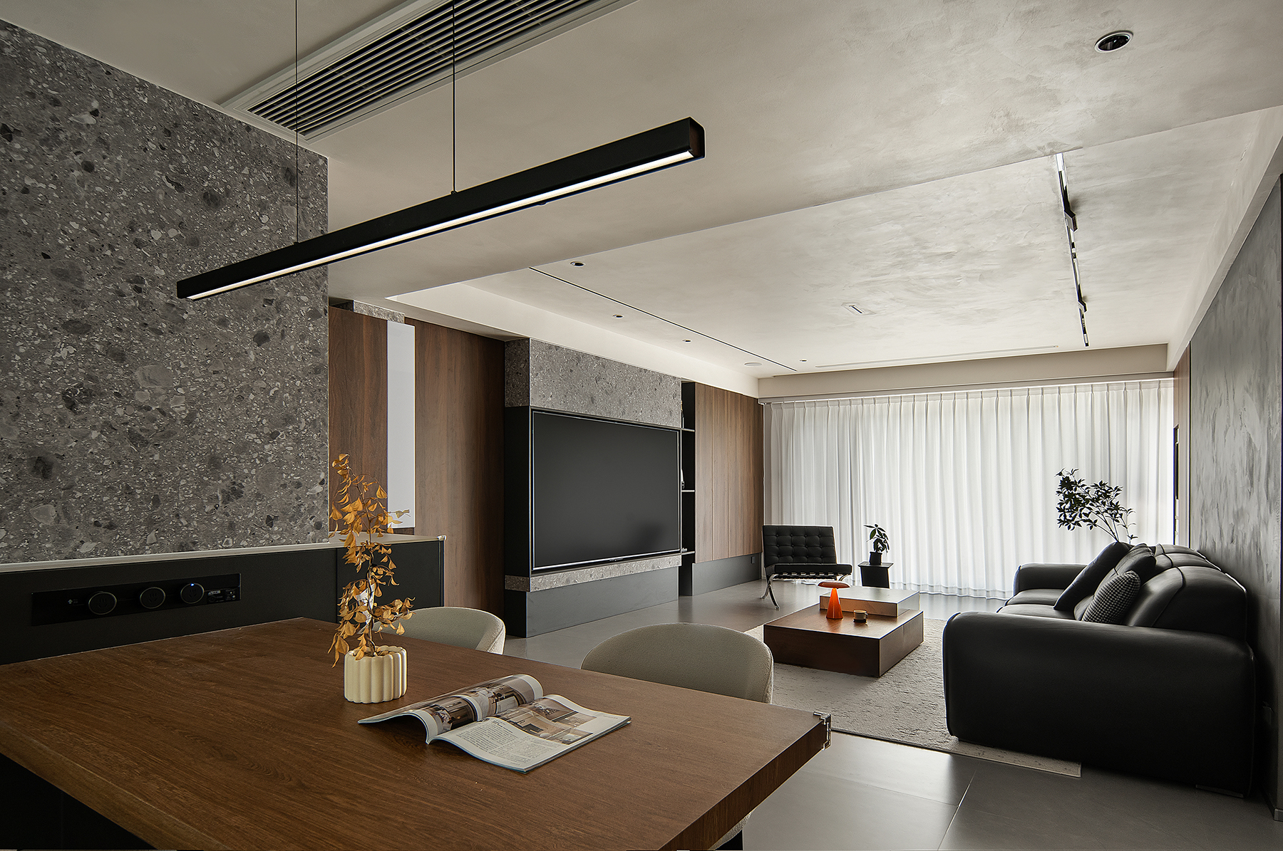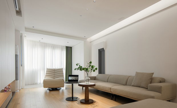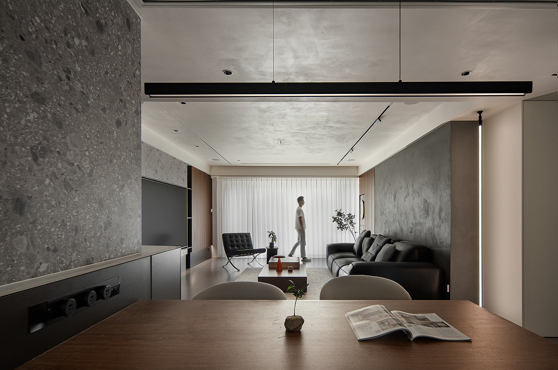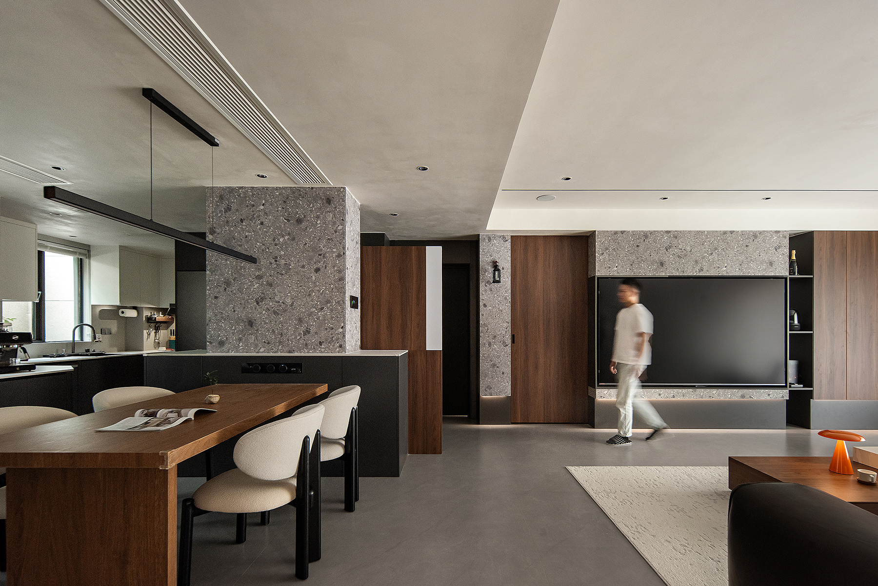 空间意境:以意式形式呈现空间美感,大面积木饰面及水磨石板,