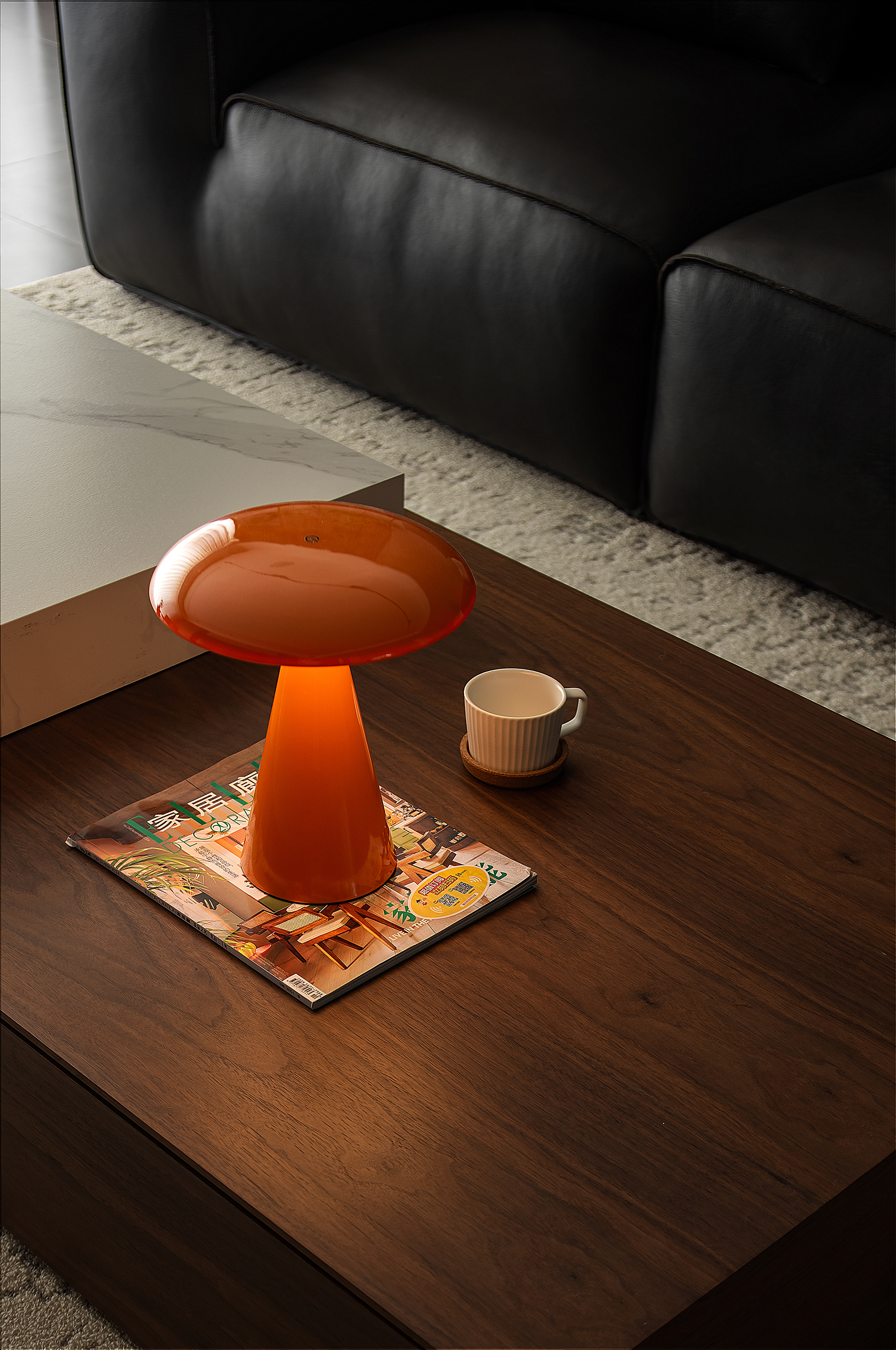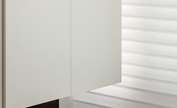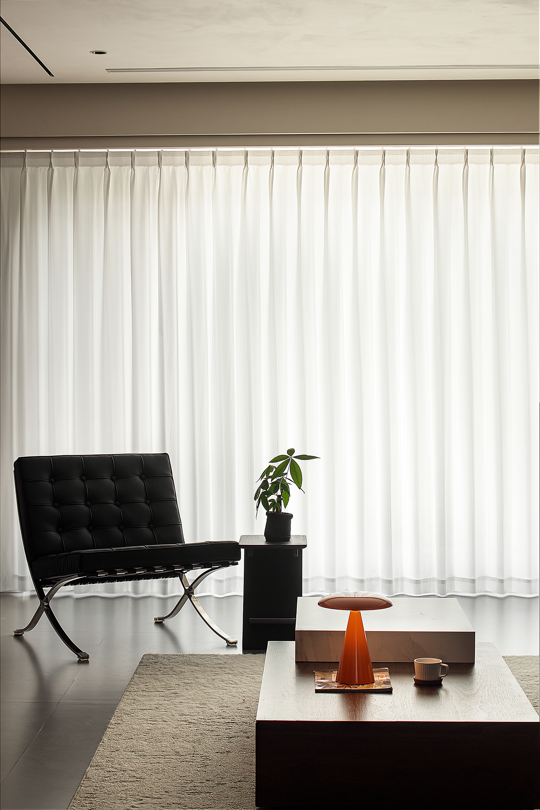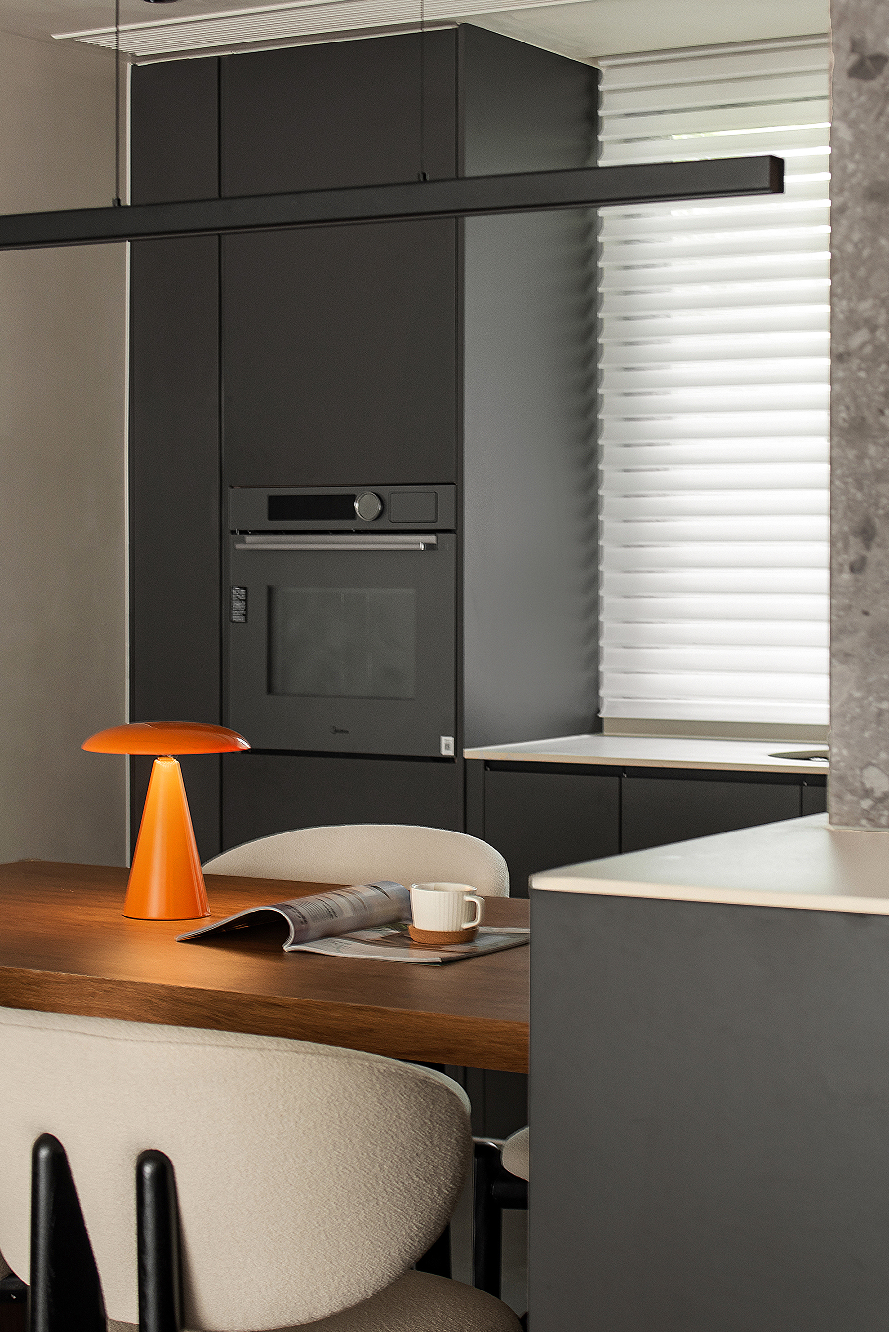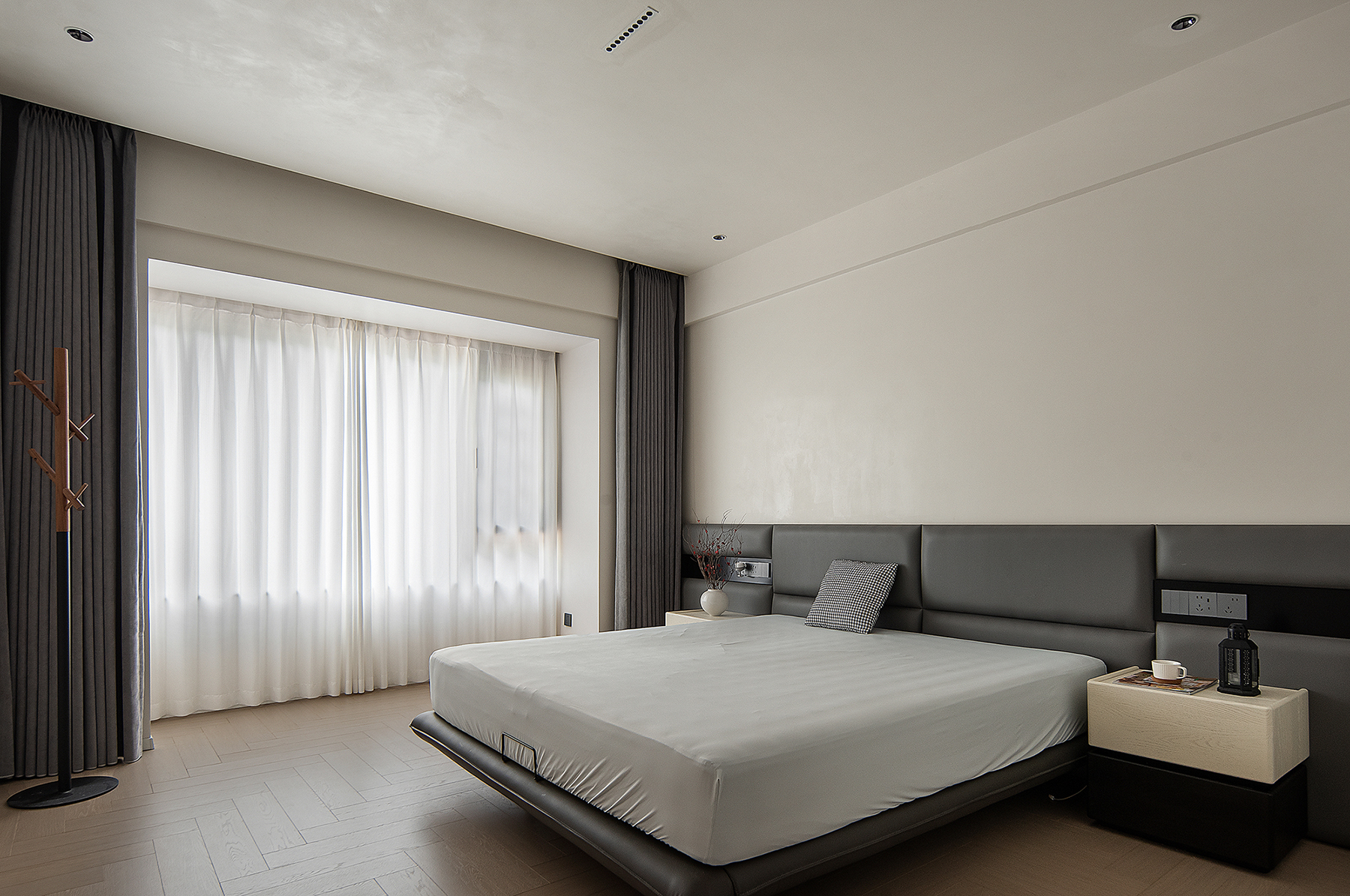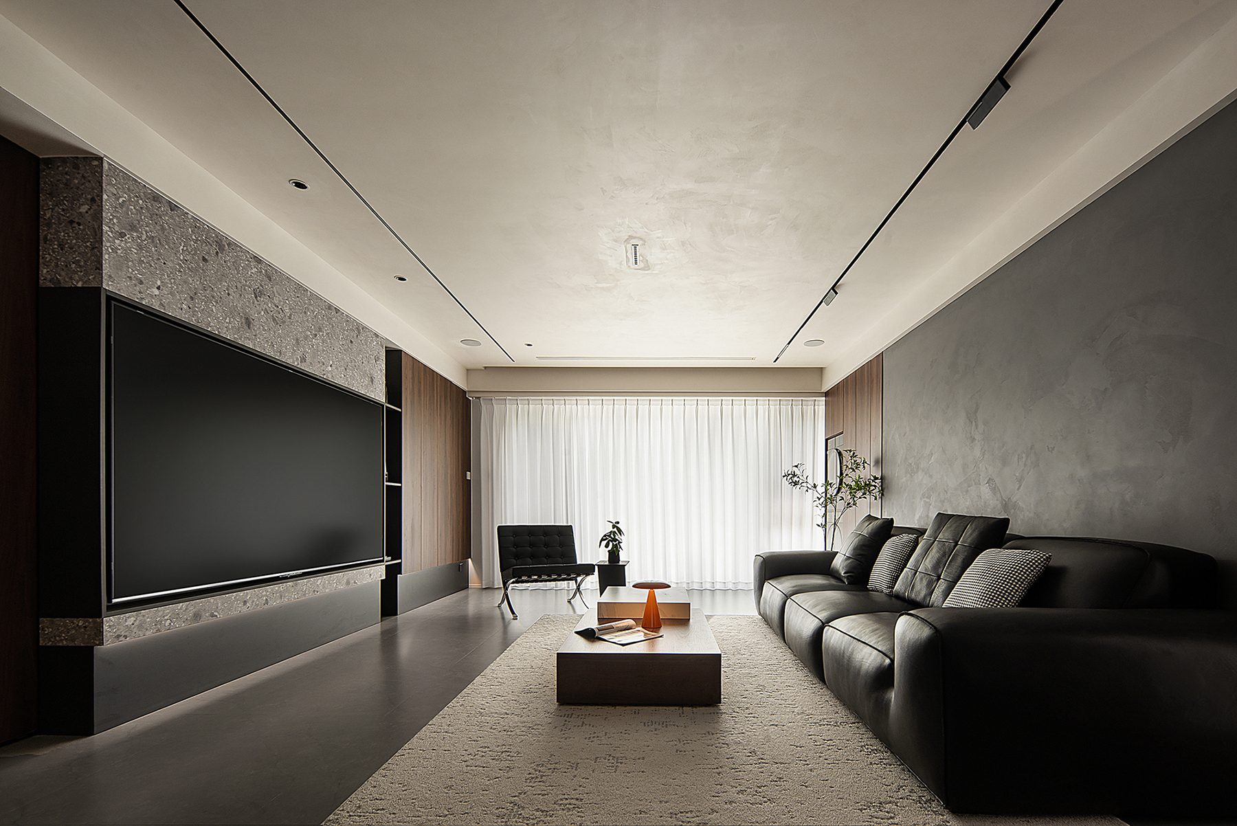 空间意境:以意式形式呈现空间美感,大面积木饰面及水磨石板,
