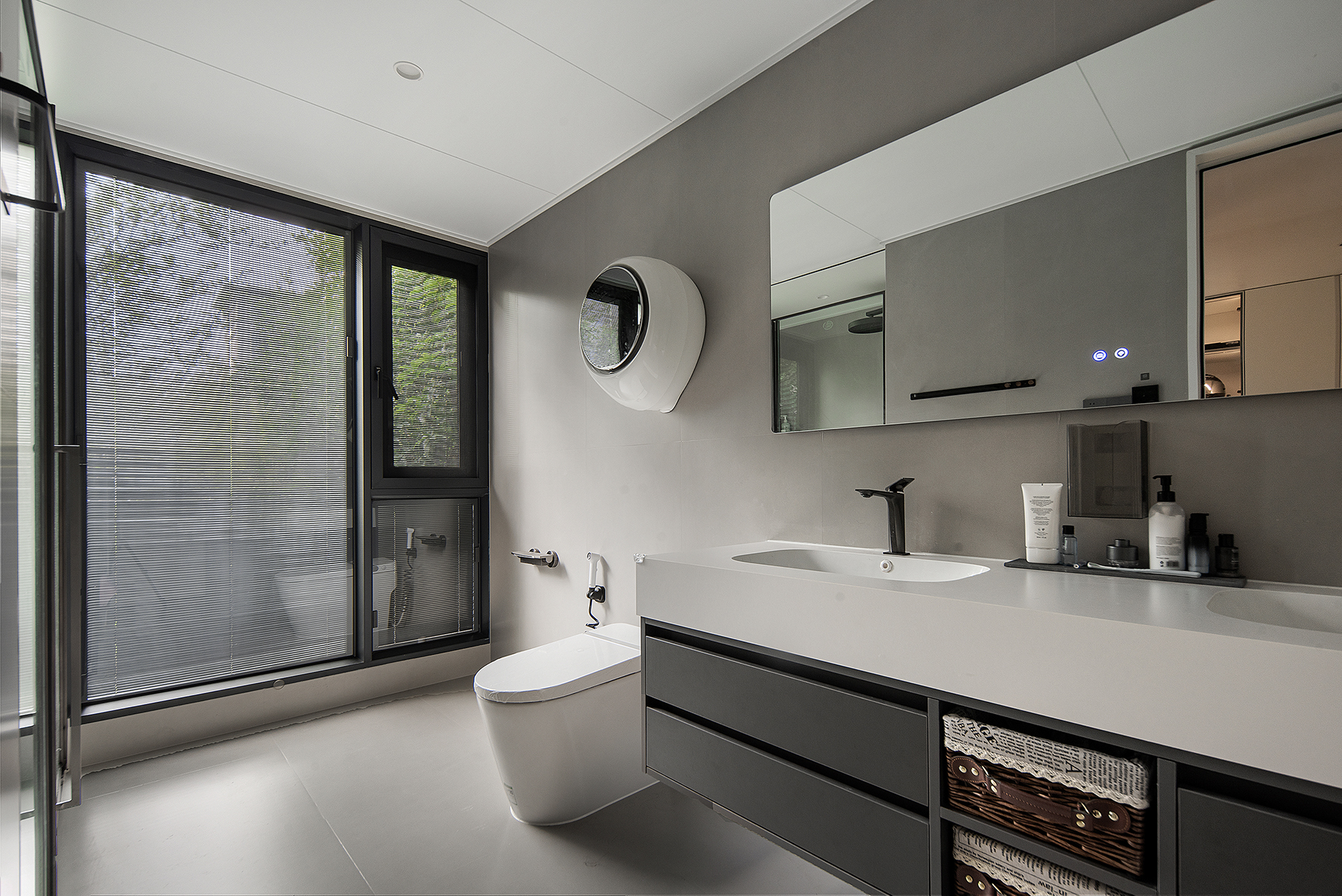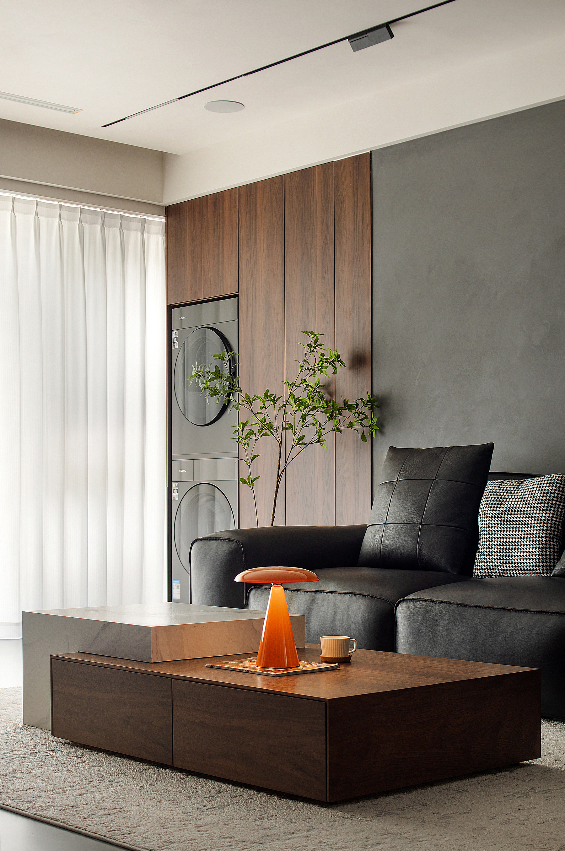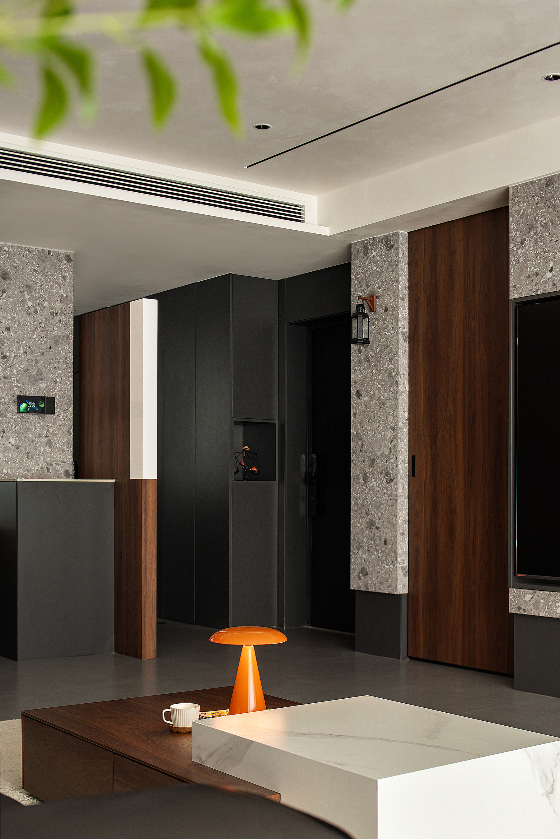 设计选材:大面积以木饰面做主体色调,水磨石做了辅助配色,