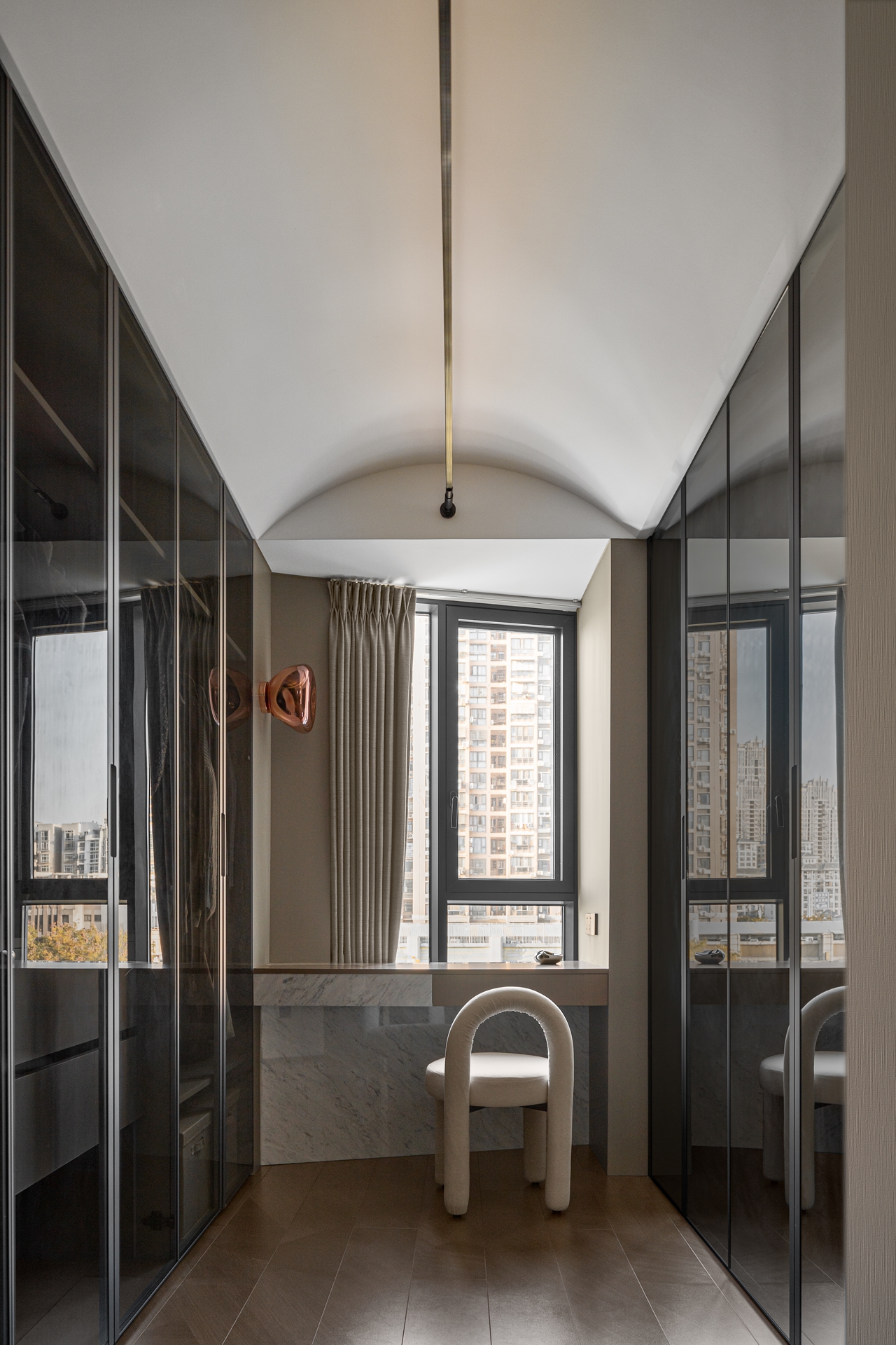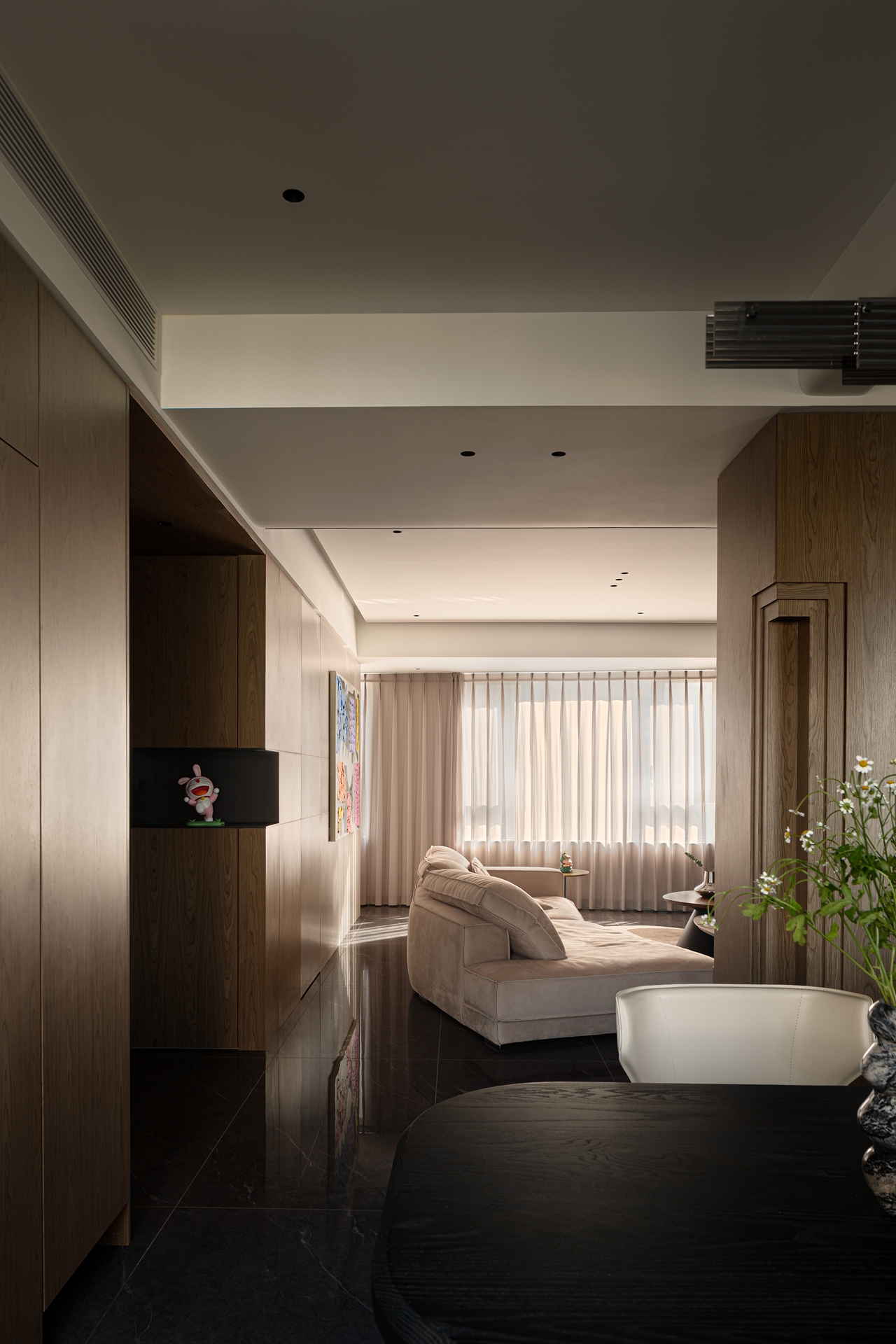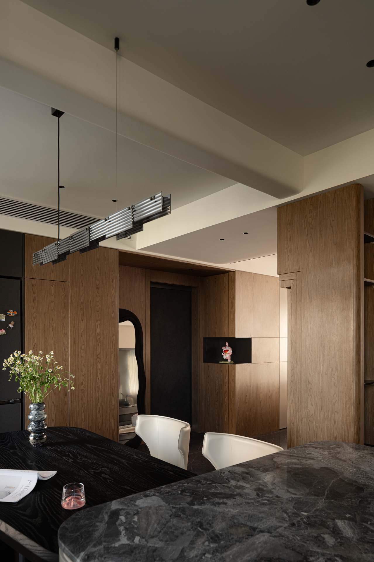 空间意境:当然这个家的初始面貌就足够独特,不像常规弧形以方正为主,本案屋主选择了坐落于武汉商圈之上,具有极强改动性的限量版「潜水艇」住宅。你以为个性十足的他喜欢桀骜不驯的工业风?其实深色且质感强烈的简约之家才是他所追求的。