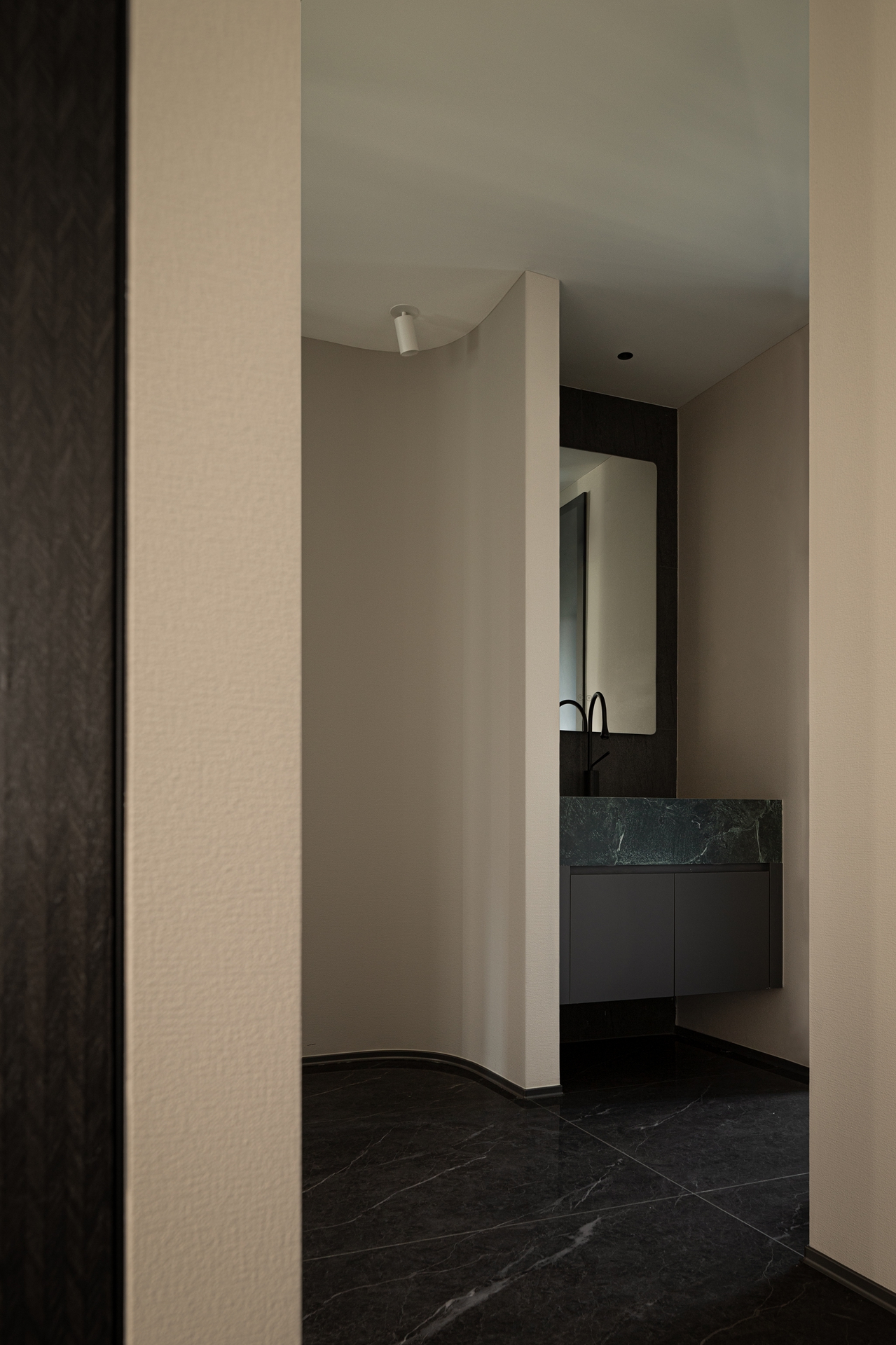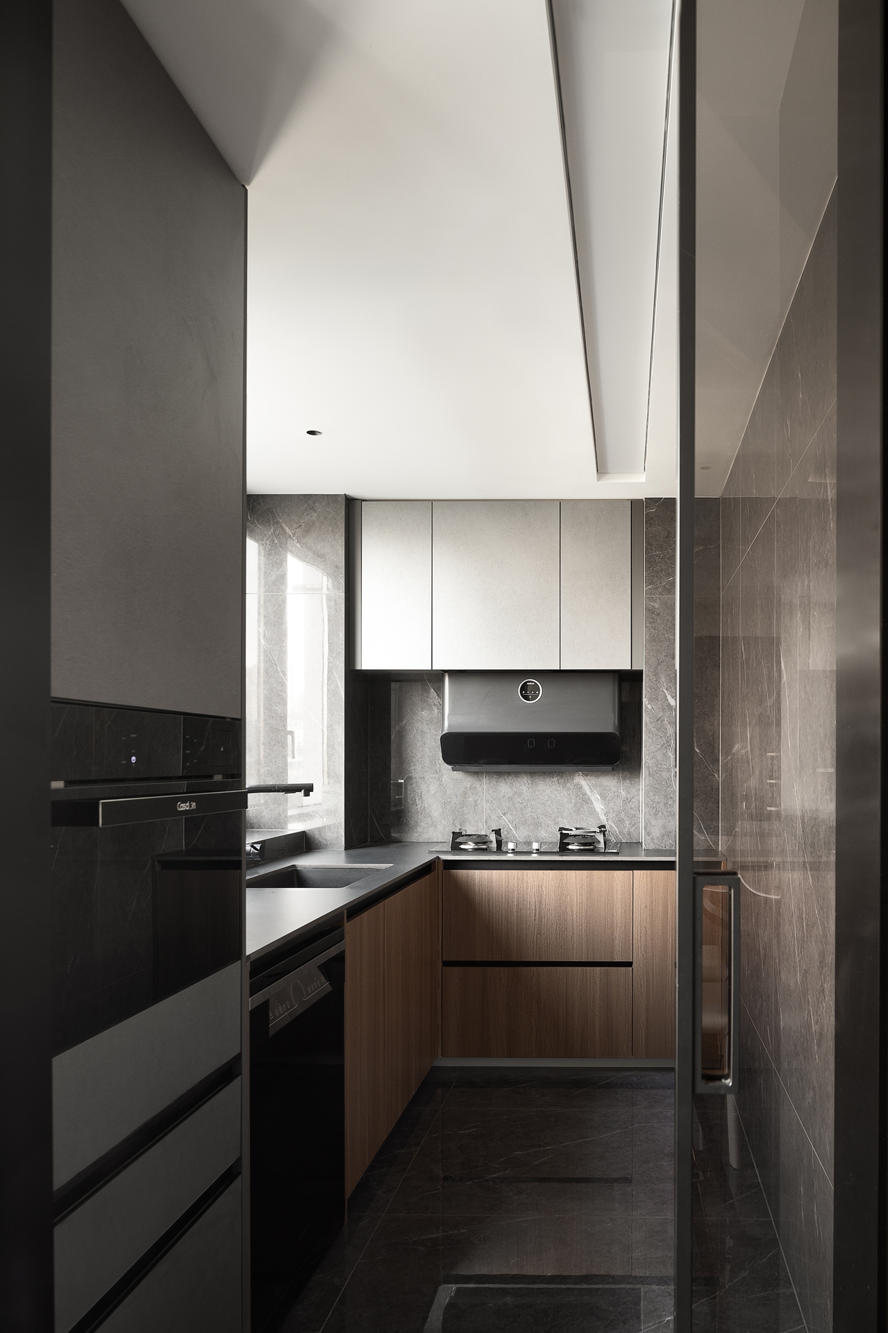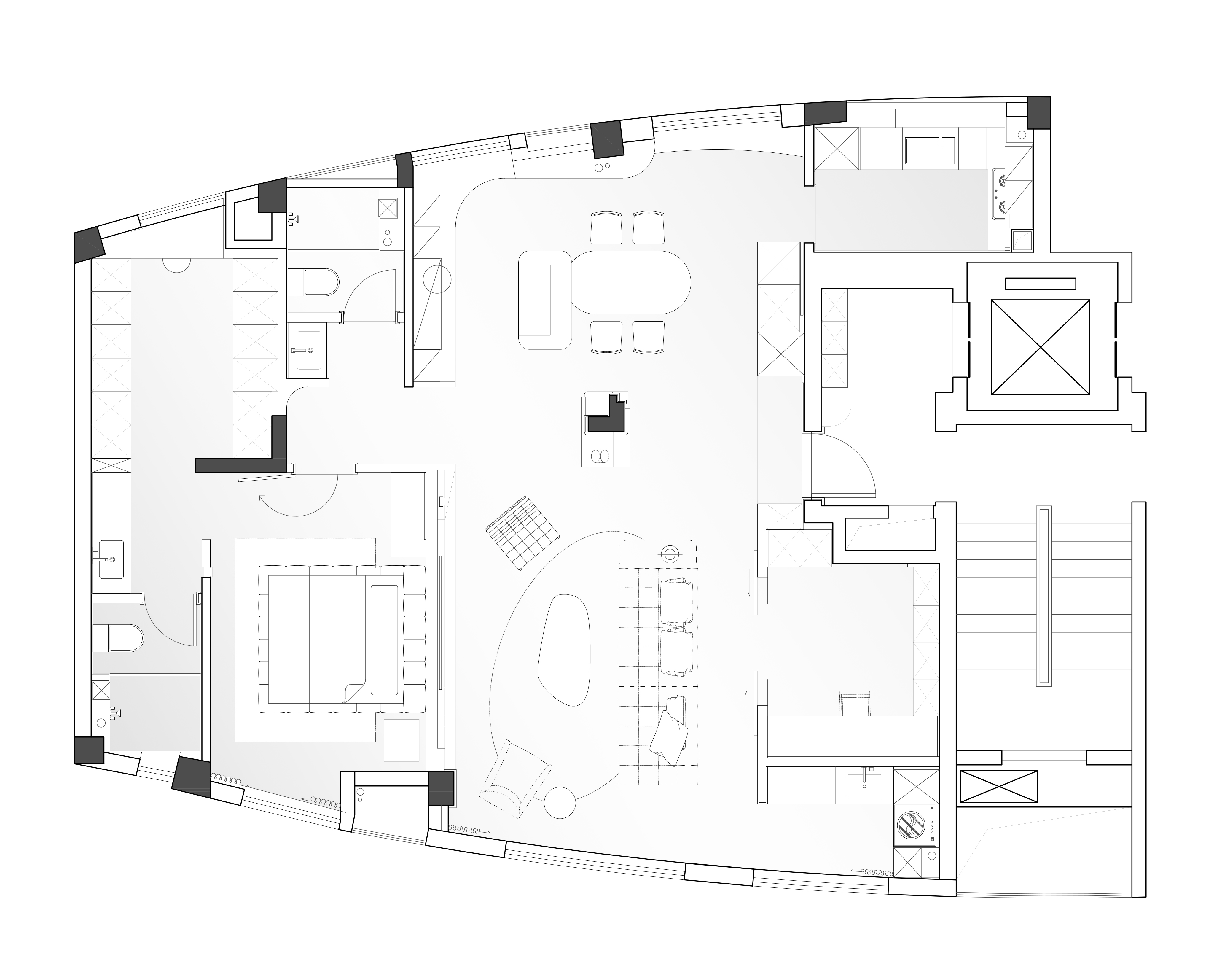空间意境:当然这个家的初始面貌就足够独特,不像常规弧形以方正为主,本案屋主选择了坐落于武汉商圈之上,具有极强改动性的限量版「潜水艇」住宅。你以为个性十足的他喜欢桀骜不驯的工业风?其实深色且质感强烈的简约之家才是他所追求的。