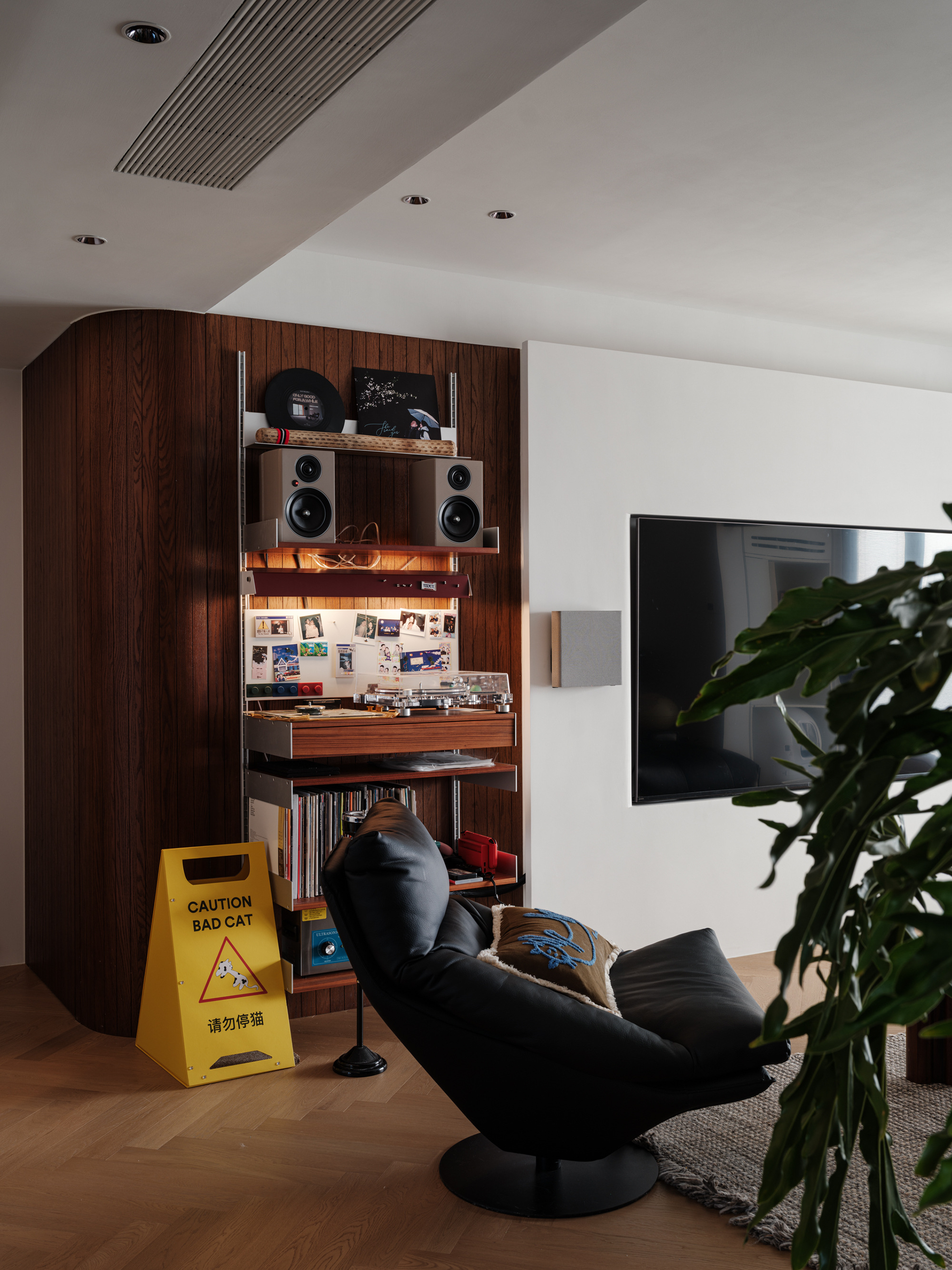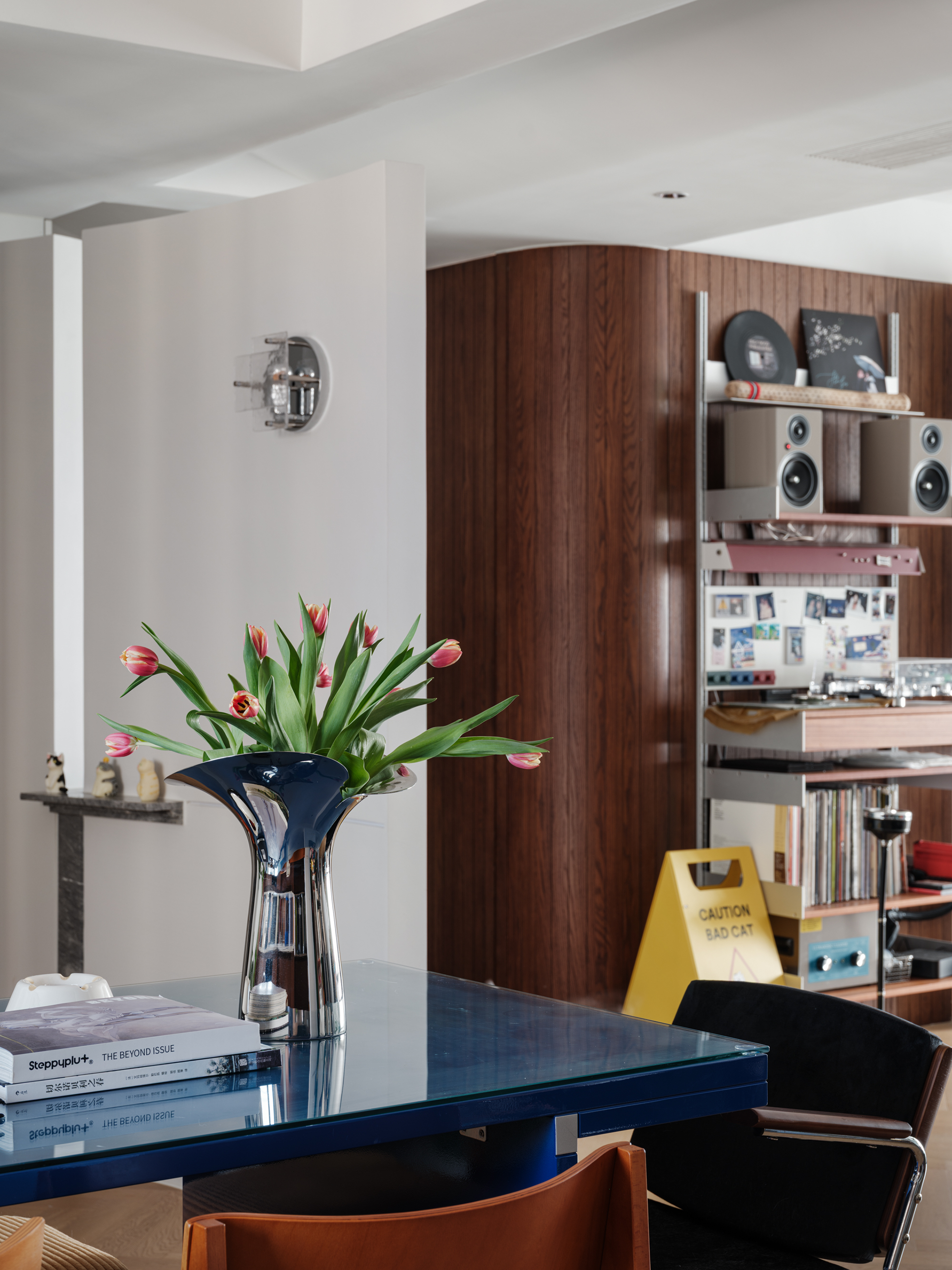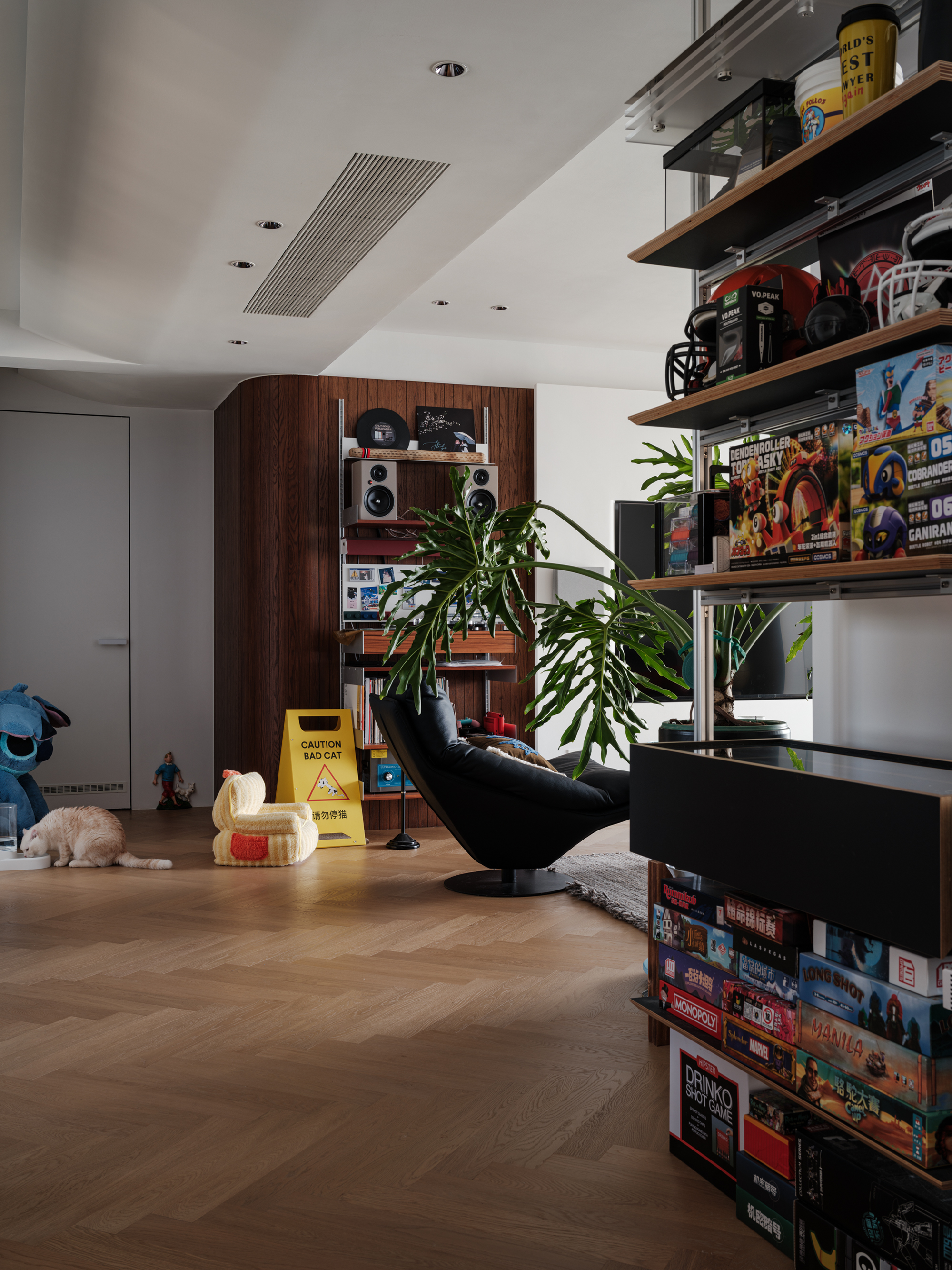 设计选材:用了几组金属展架,将屋主热爱的事物生动呈现在空间之中