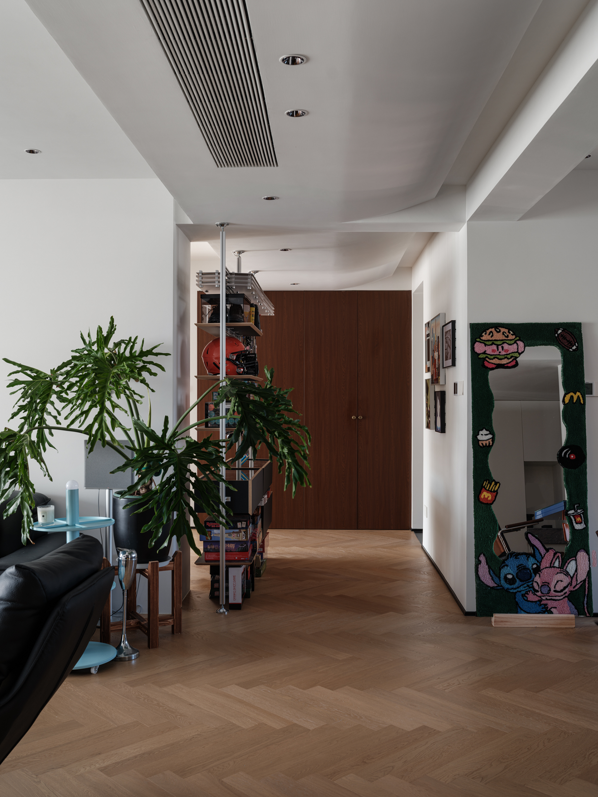 整排柜体延伸至过道,杂物间暗藏其后,收纳力满分。