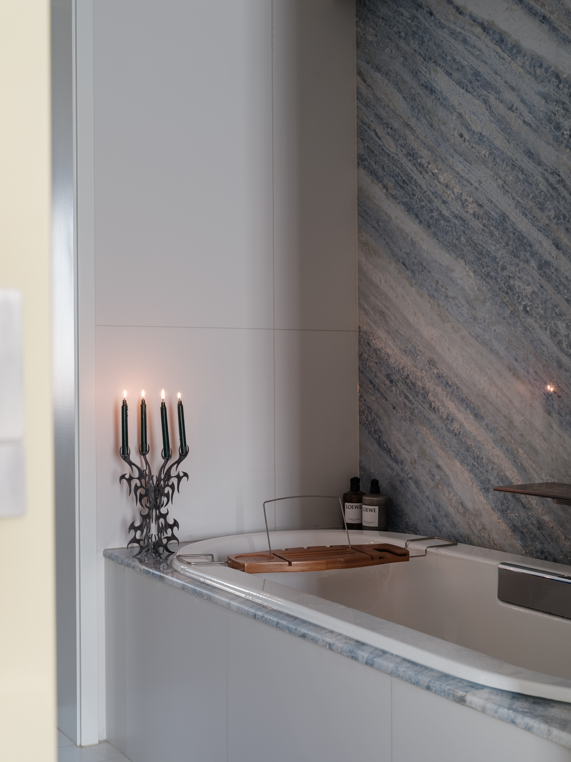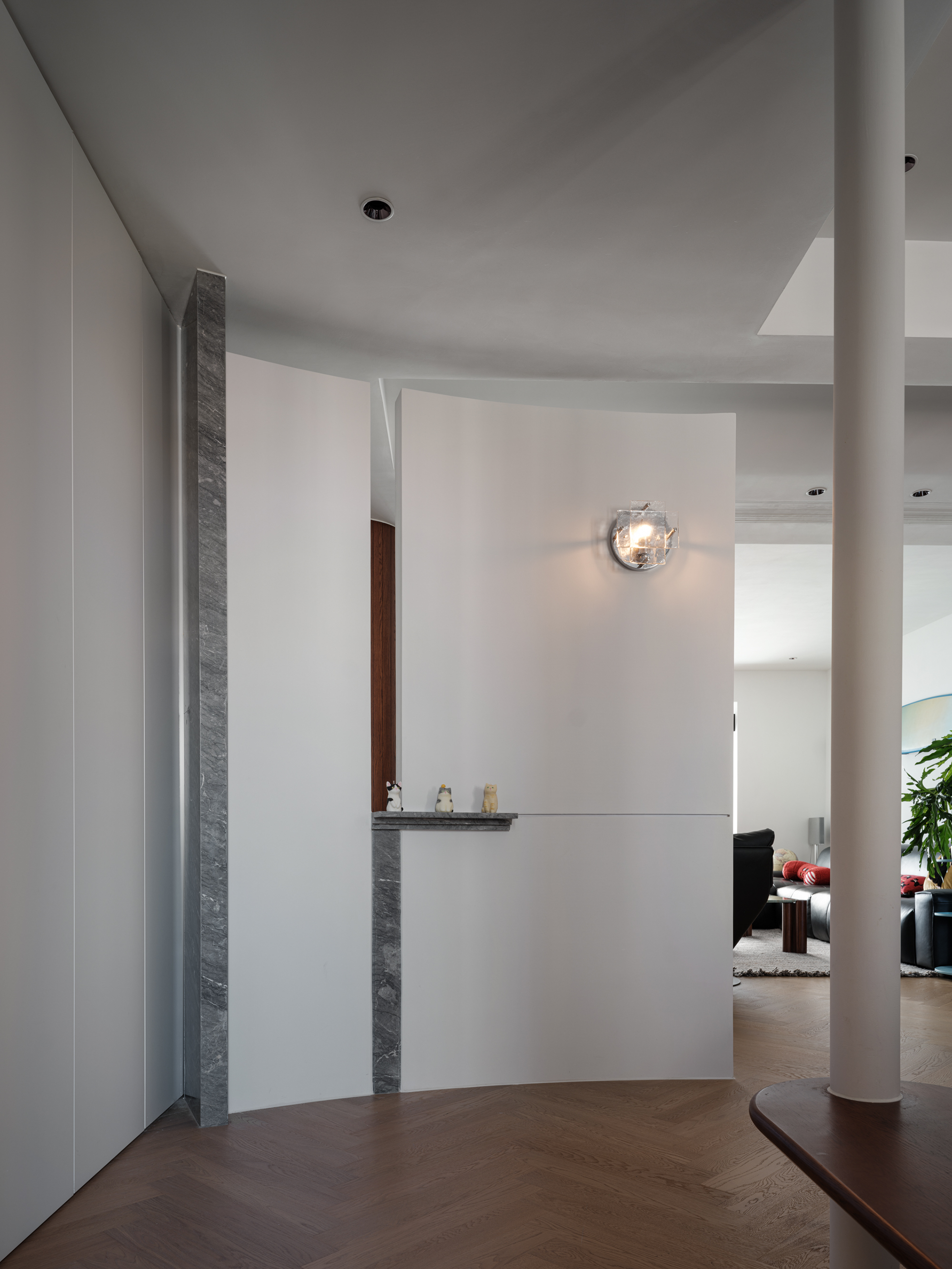 一面弧形隔断 + 悬浮换鞋凳,轻巧界定落尘区,