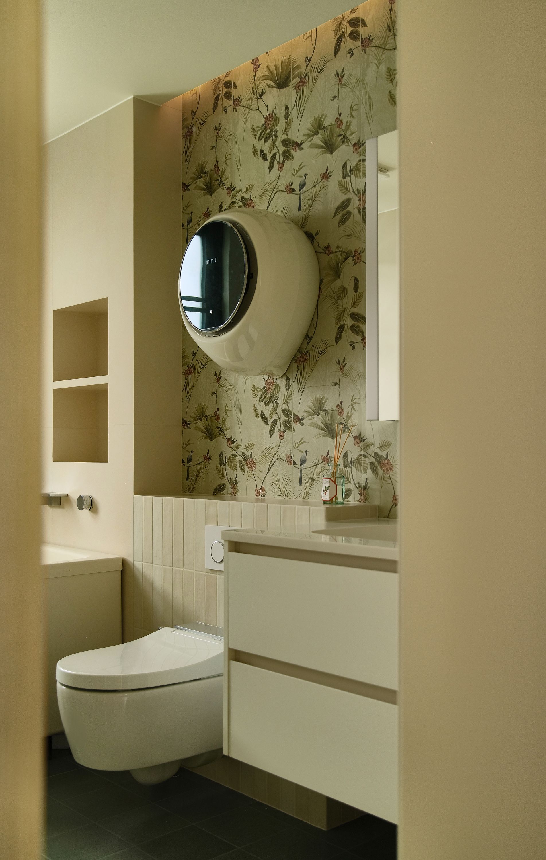 这个卫浴间,把复古浪漫和自然野趣酿成了生活的惊喜。花鸟背景是空间的自然画布,复古色调的植物与鸟雀图案,仿佛把一片小森林搬进了卫浴间,让洗漱时刻都有与自然对话的野趣。搭配圆形壁挂洗衣机的可爱造型,复古与现代的碰撞,让功能区也成了视觉焦点。米色小方砖与白色柜体的搭配清新干净,墙面上的开放格收纳着洗漱小物,既实用又为空间增添了层次。深绿色地砖则是质感锚点,与墙面的柔和色调形成对比,让整个卫浴间的复古感更显饱满。