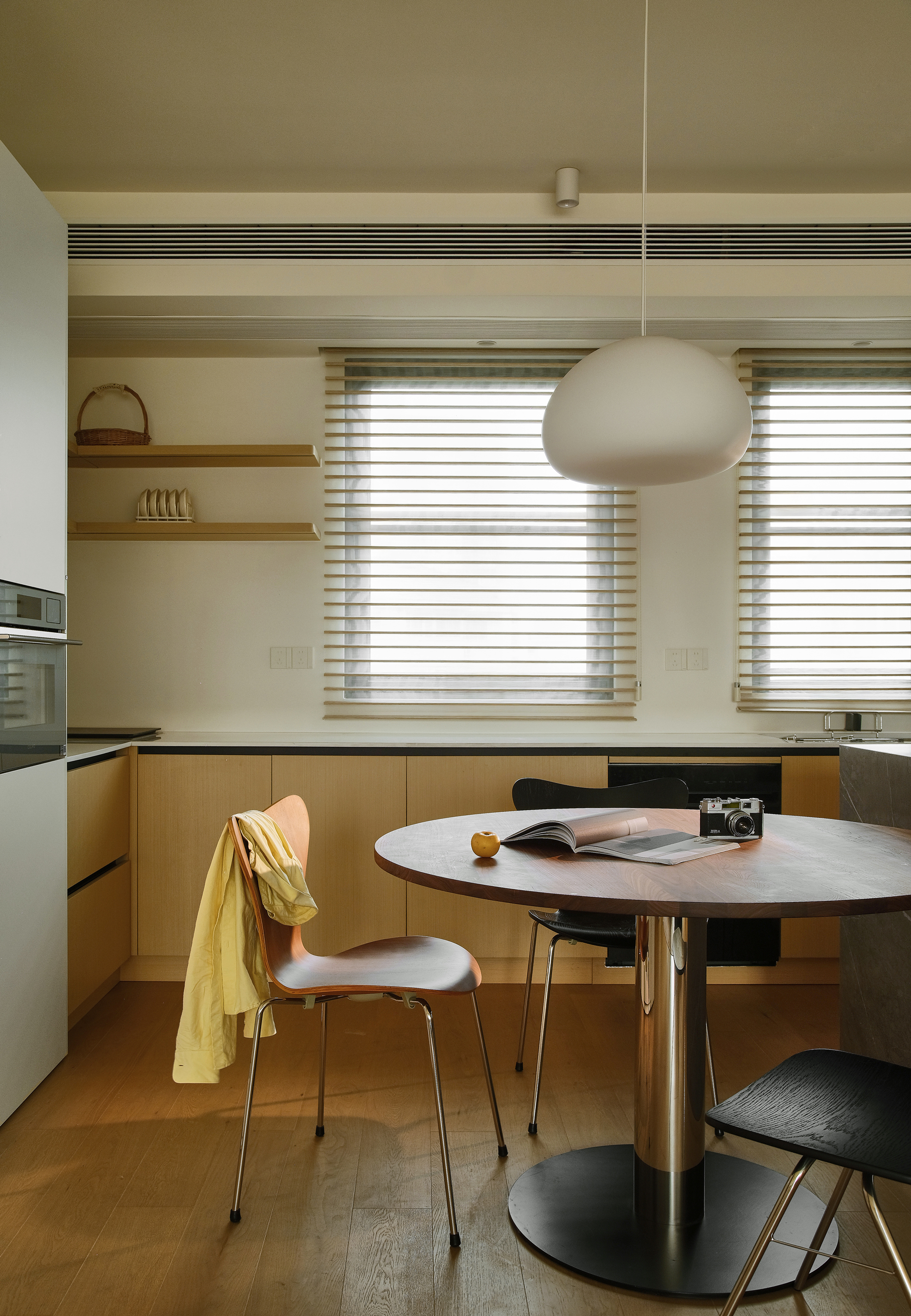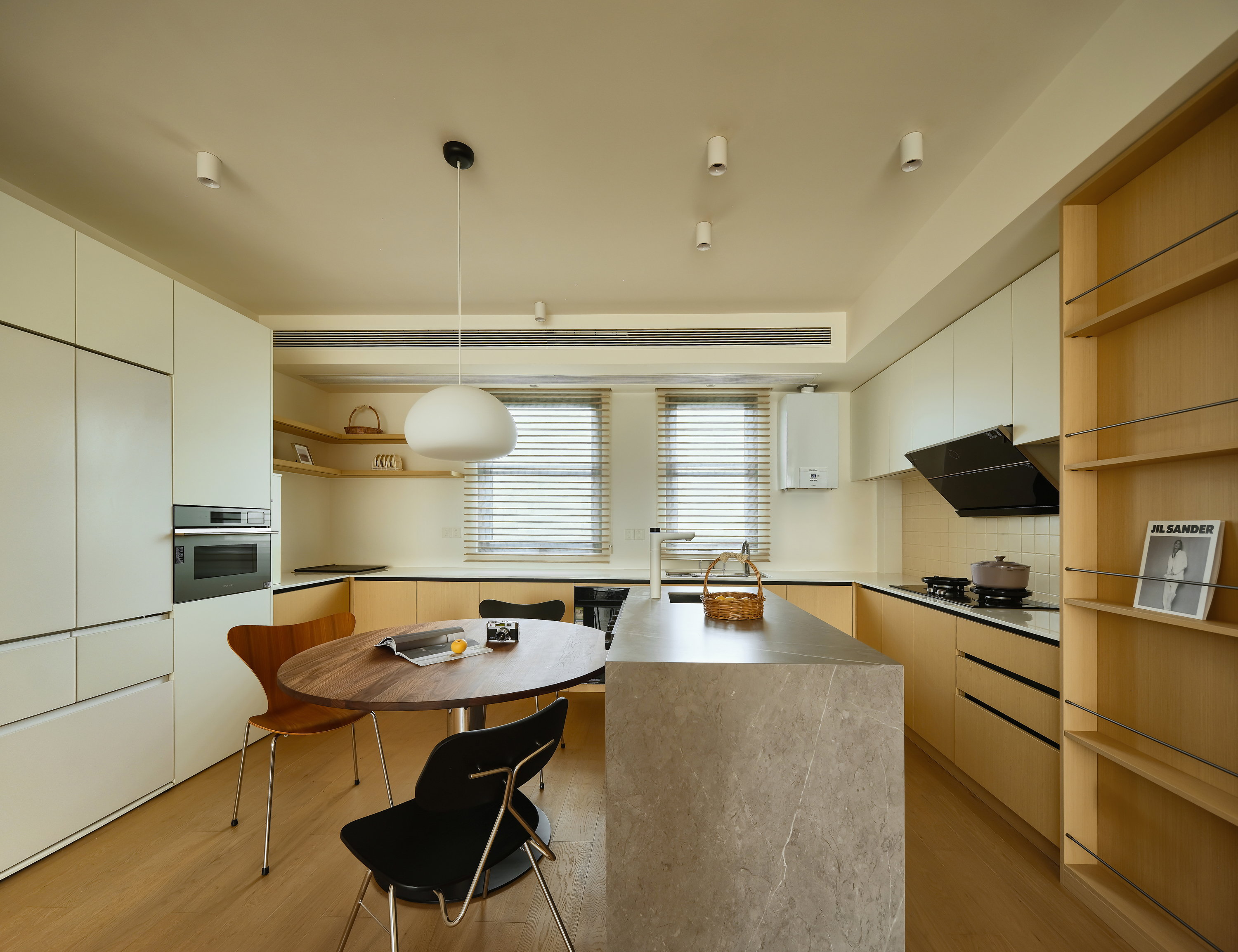 这个餐厨区,把实用和审美炖成了一碗生活的浓汤。大理石中岛是空间的 “C 位担当”,冷冽的石面质感高级,既是料理的操作台,又因为嵌入式水槽的设计,成了洗切备餐的核心动线枢纽,让餐厨互动的效率与仪式感双双拉满。白色柜体与木色的搭配清新又治愈,百叶窗把光线筛成温柔的碎片,洒在厨具与餐品上。