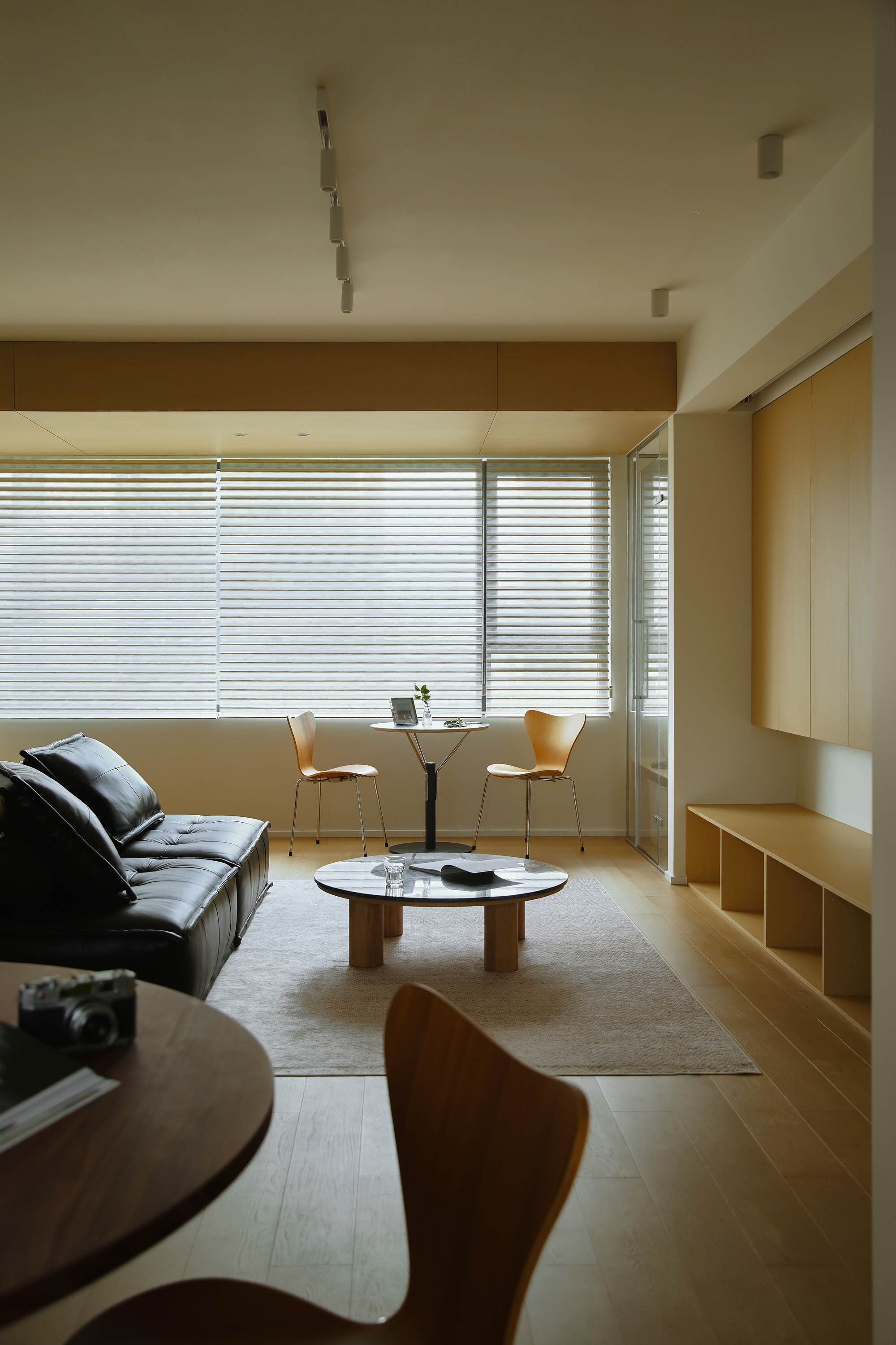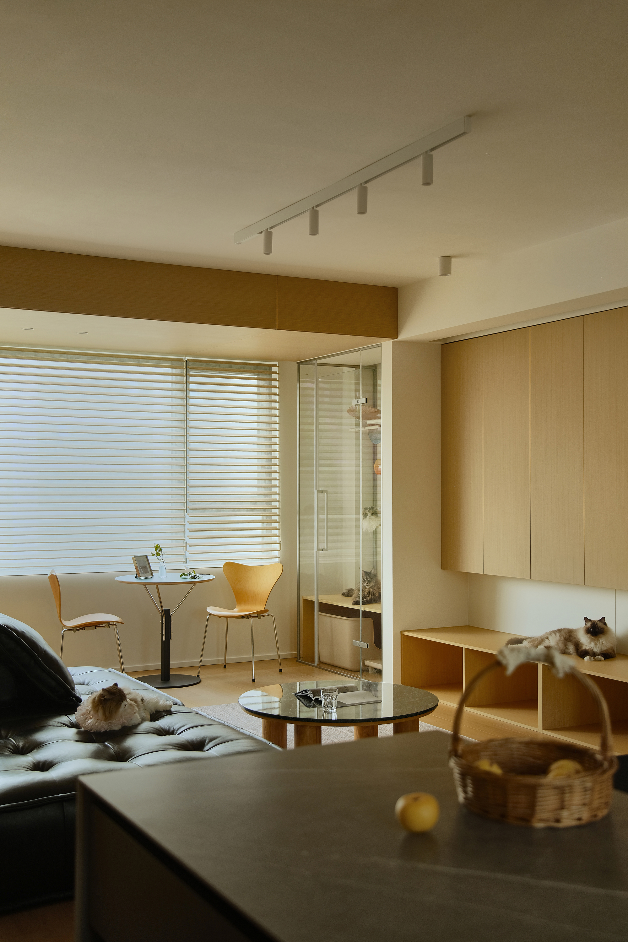 窗边的小巧桌椅组合是空间的 “诗意留白”,圆桌搭配两把造型简约的浅木色椅子,阳光透过百叶帘洒在桌面,在此处喝杯咖啡、读本书,生活的慢节奏就被牢牢攥在手里。旁边的透明玻璃猫爬架更是 “铲屎官友好设计” 的点睛之笔,通透的材质让猫咪的活动轨迹清晰可见,既满足了宠物的玩乐需求,又与整体空间的简约风格完美融合,人与宠物的互动在这个角落变得自然又温馨。