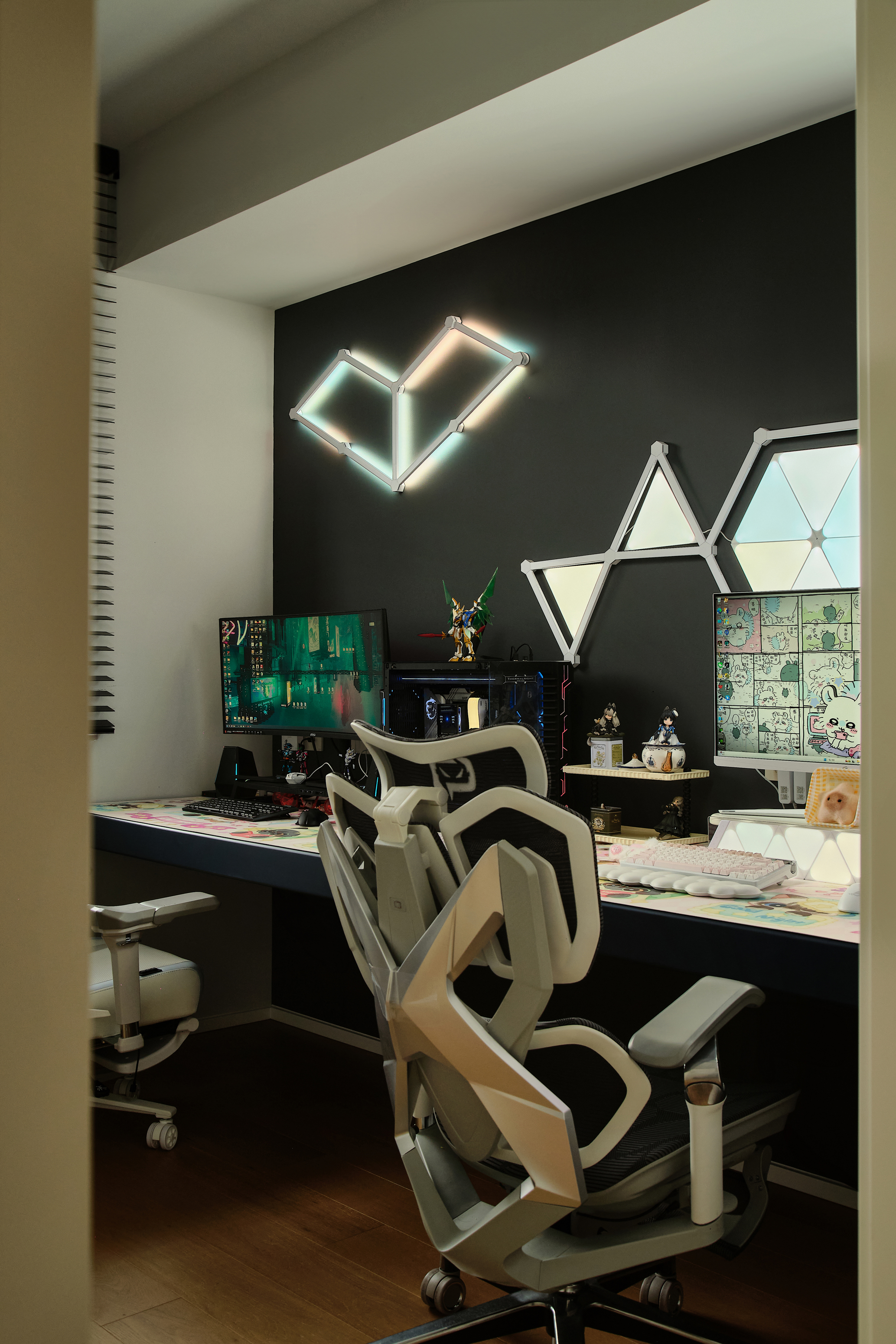 这个电竞房,是硬核装备与潮流设计的狂欢现场。深灰墙面是空间的电竞底色,搭配几何霓虹灯的赛博朋克感,瞬间拉满沉浸式对战的氛围。墙上的模块化灯光装置既是氛围担当,又像未来科技的缩影,让每一次操作都有置身游戏世界的代入感。双工位的设计把竞技与休闲一网打尽:一侧是硬核电竞装备,炫酷主机、专业显示器点燃热血;另一侧是萌系桌面,二次元元素与可爱外设碰撞,让游戏热爱有了多元表达。机能风电竞椅的未来感造型,既是身体的舒适座舱,又是空间的潮酷摆件。