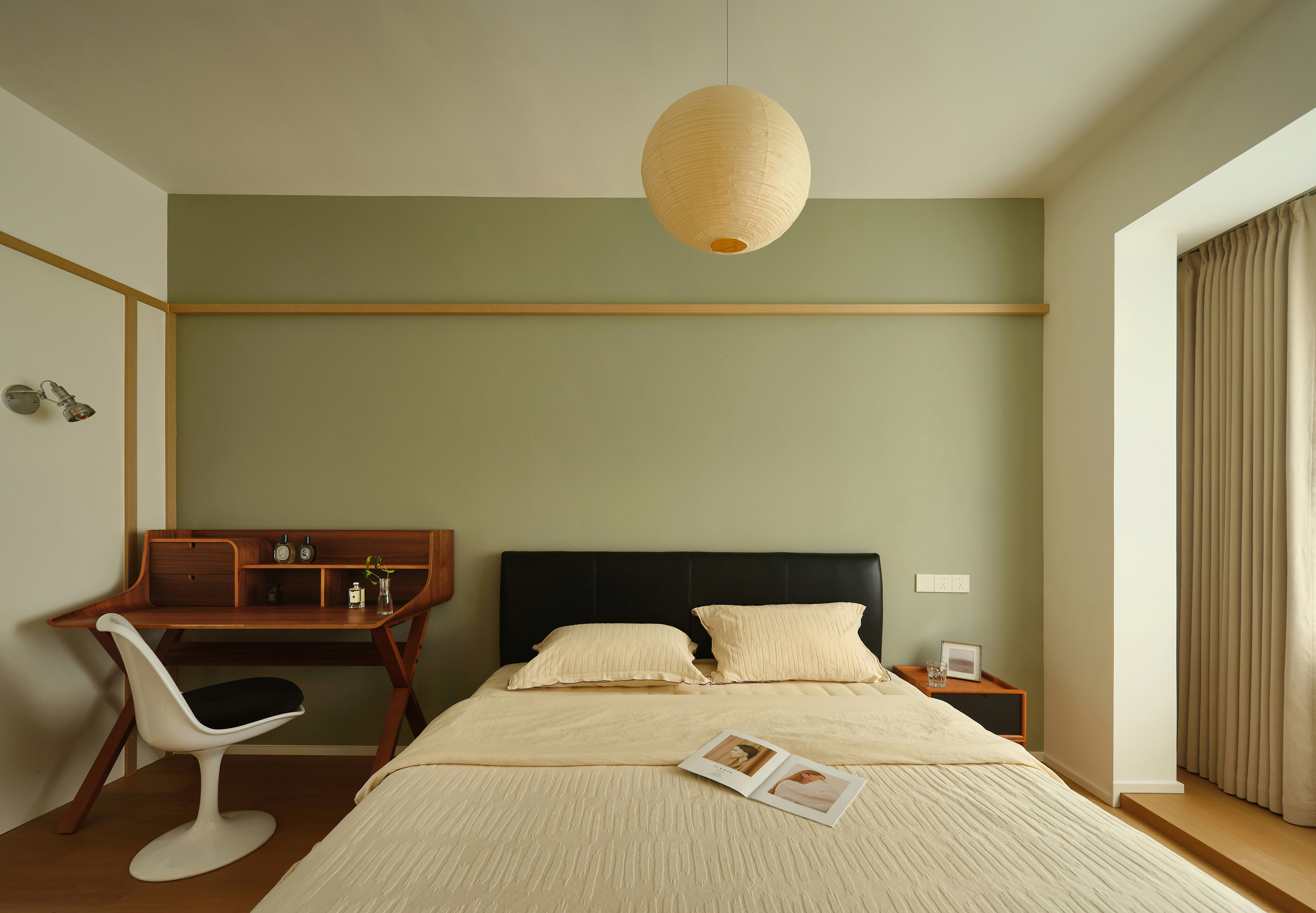 灰绿色墙面搭配木质线条,是空间的层次魔法。木线如一条温柔的分割线,既丰富了墙面的视觉层次,又与木质地板、梳妆台形成材质呼应,让整个卧室的温润感贯穿始终。搭配黑色皮质床头的复古腔调,一柔一刚间,把睡眠的松弛与设计的质感平衡得刚刚好。米色床品的细腻纹理、木质地板的温润触感,再加上窗帘的轻柔垂坠…… 这个卧室没有冗余的装饰,却把好好休憩的每一个细节,都打磨得让人想立刻躺平。