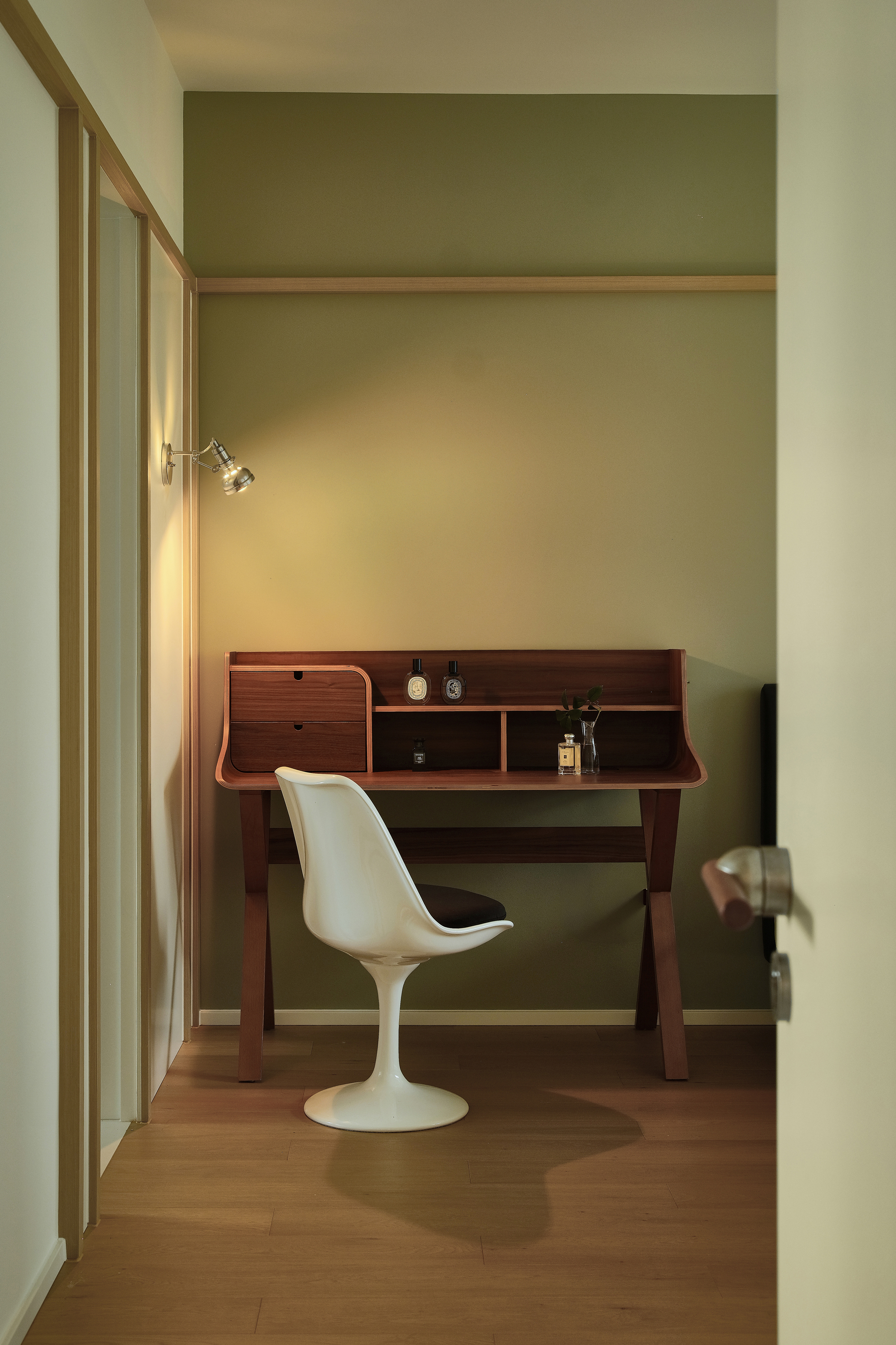 空间意境:整体以 “柔和治愈” 为基调:木色的温润纹理作为空间底色,铺陈出自然质朴的氛围;墙面选取低饱和度的浅米色、灰绿色等莫兰迪色调,像一层轻柔的滤镜,让整个空间在光影里晕染出宁静松弛的质感;局部点缀的黑色、棕色等中性色,又为这份柔和增添了几分沉稳与雅致,恰如两人性格与情感的交融。