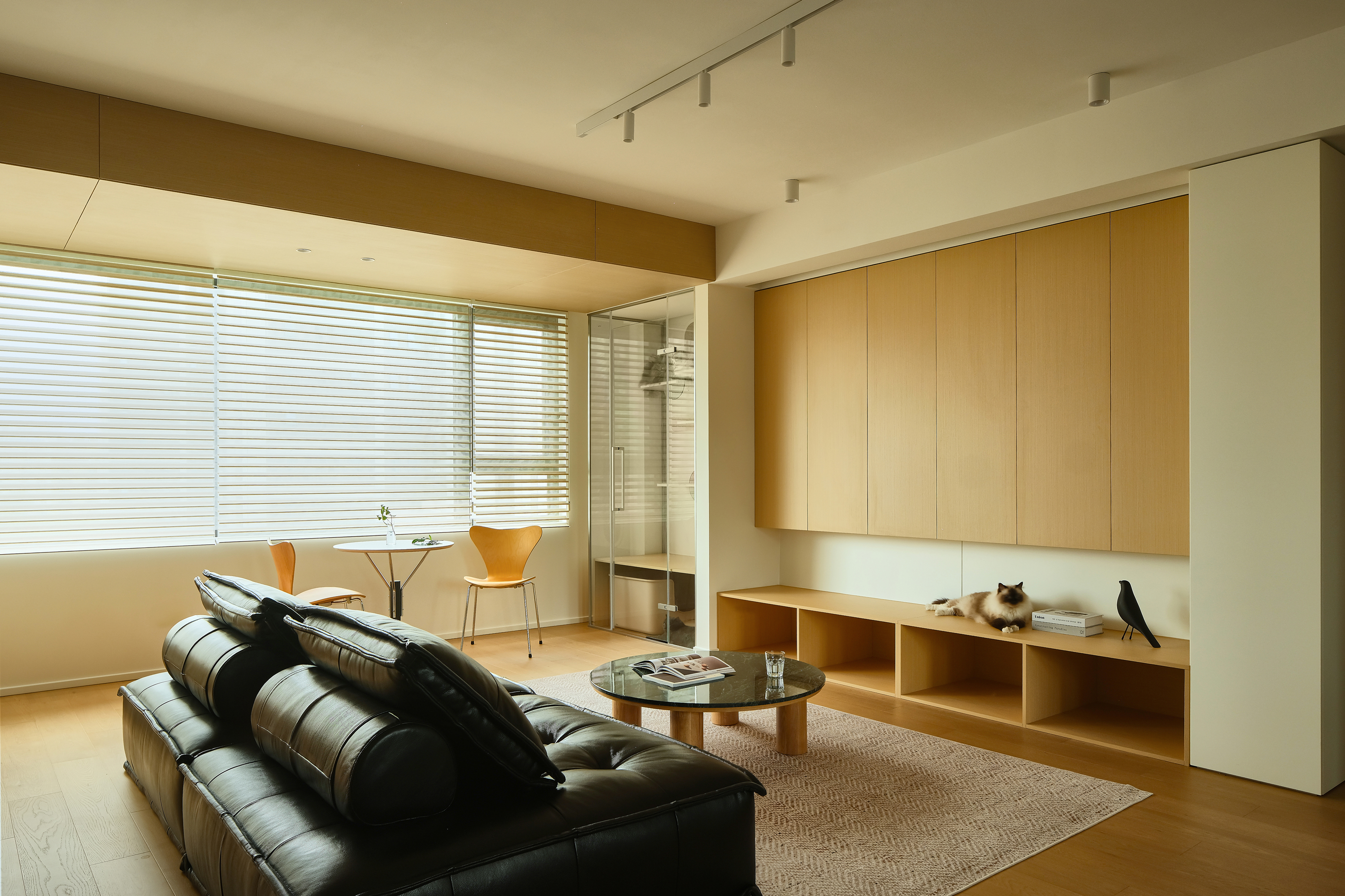 走廊处的小灯芯玻璃柜体,通透材质让收纳 “隐而不藏”,与木色区域形成材质对话,既保证了空间的呼吸感,又默默承担了收纳的功能。