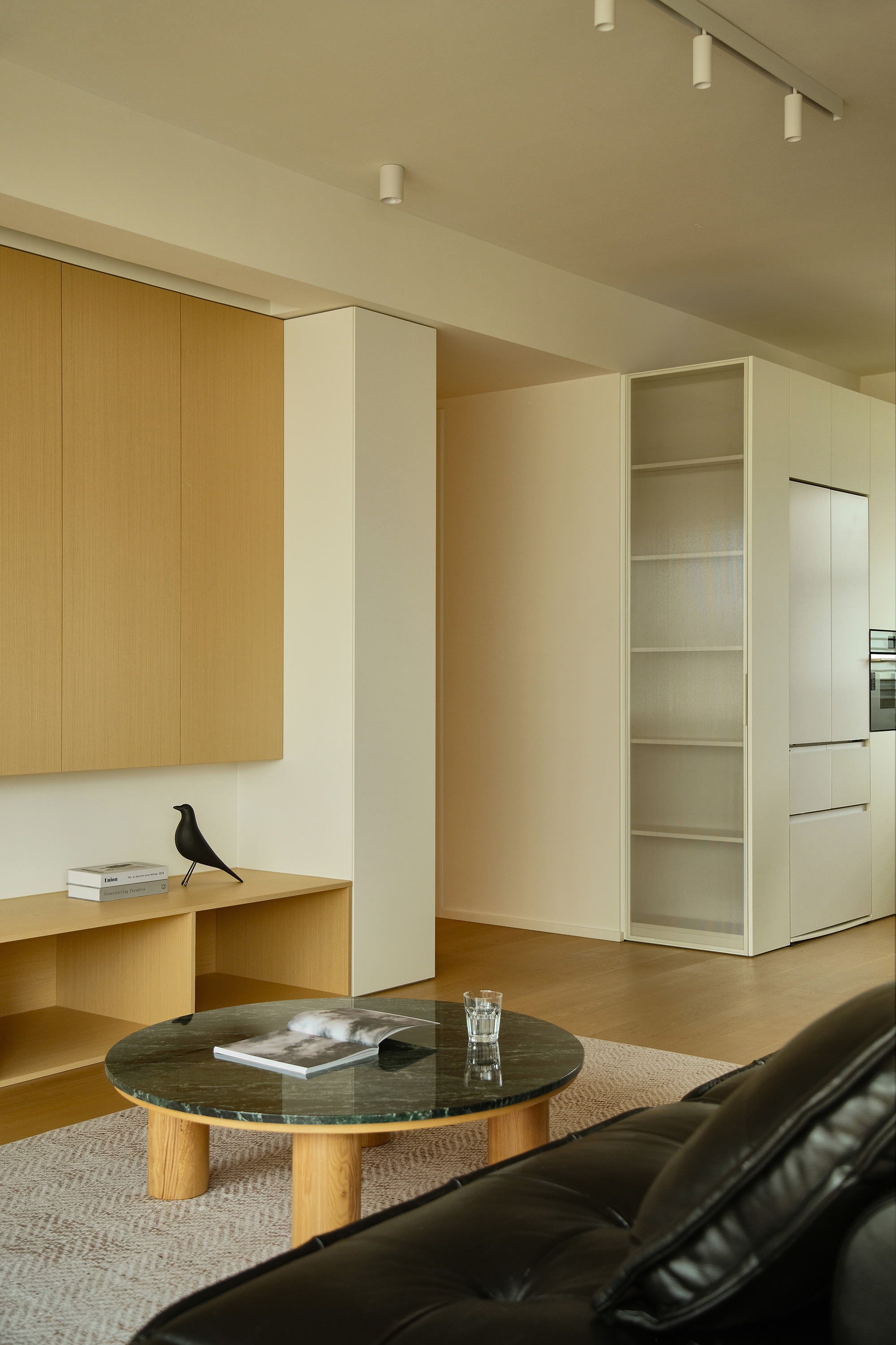 窗边的木饰面吊顶是空间的温柔结界,与墙面、柜体的木色一脉相承,既弱化了空间的生硬边界,又为靠窗区域营造出包裹感十足的小天地。当墨绿大理石的冷冽遇上原木的温润,这张圆形茶几便成了空间的质感枢纽 —— 桌面的天然纹理自带艺术张力,木质桌腿又柔化了视觉冲击,随手摆上杂志与水杯,高级感就落在了生活的日常里。脚下的浅咖色地毯则是舒适的延伸,柔软的质感承托着每一步行走,也让空间的色调更显和谐。