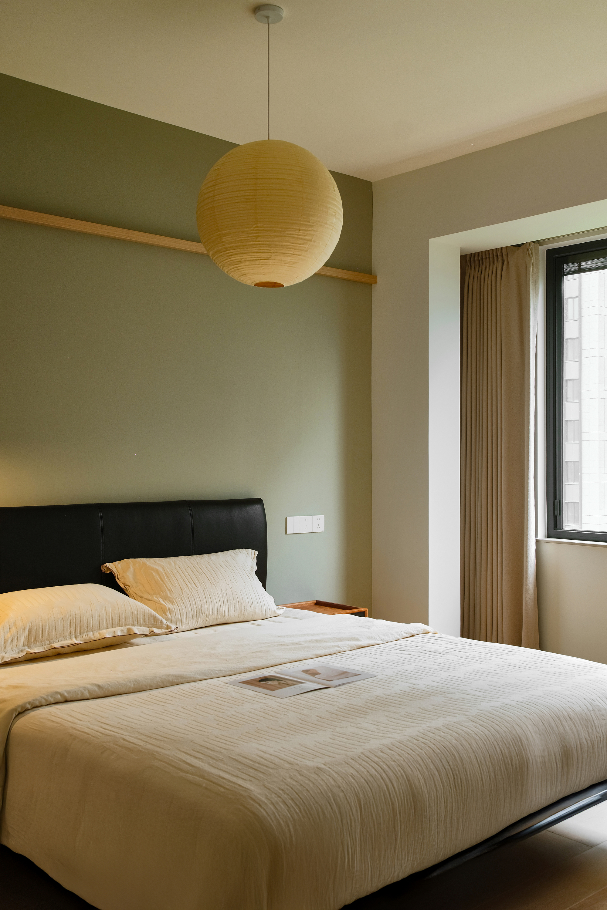这个卧室,把松弛感揉进了每一处色彩与细节里。顶上的纸艺球形吊灯是温馨的点睛之笔,柔和的光线透过纸艺肌理,在夜晚为卧室晕染出暖黄的氛围,让每一次入眠都像一场温柔的仪式。