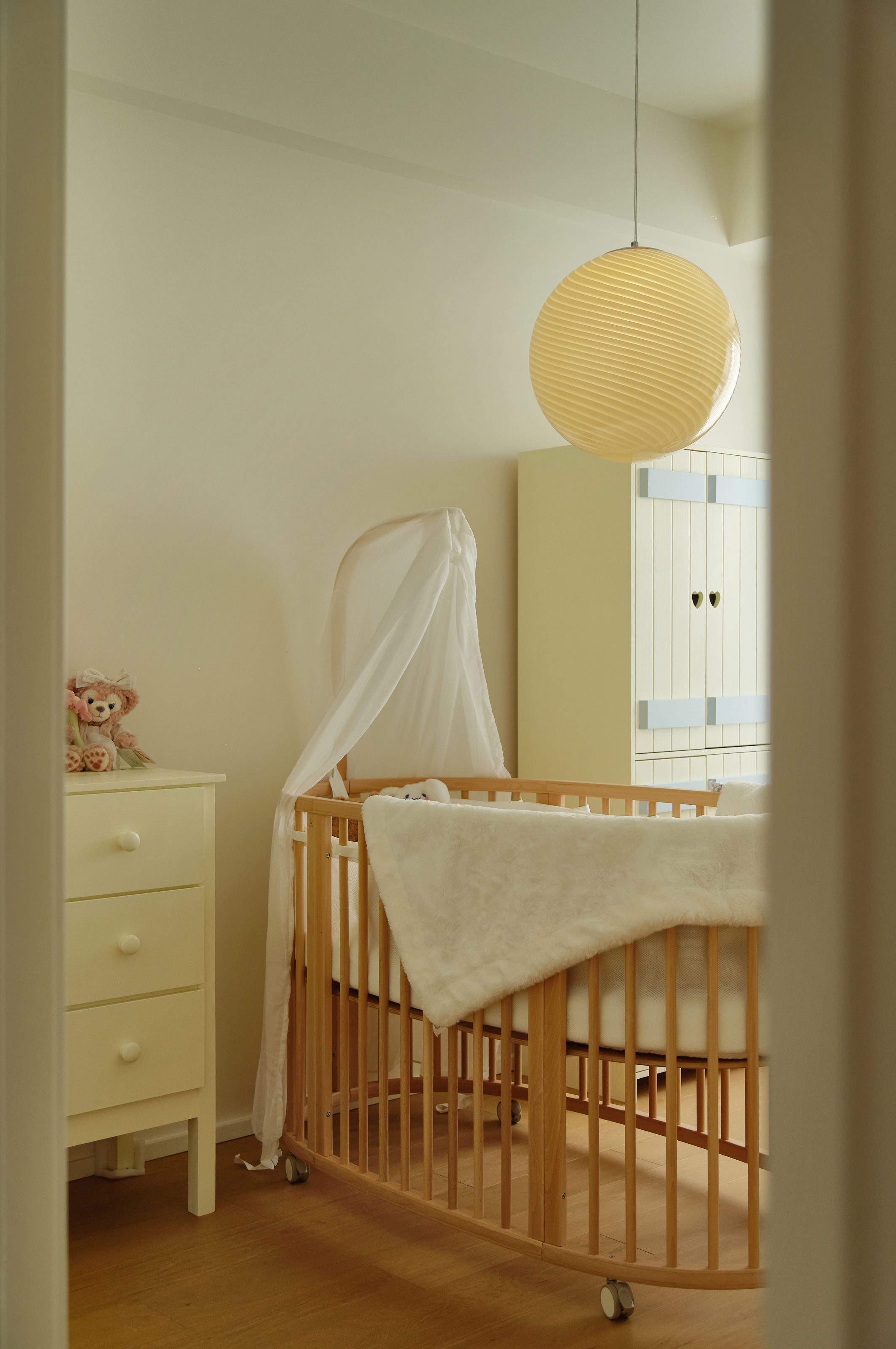 为未来宝宝准备的儿童房,原木婴儿床是空间的温柔核心,天然木色自带温暖质感,搭配白色纱帐与毛绒盖毯,把安全感与童话感揉进了睡眠角落,让宝宝的每一次入眠都像被云朵包裹。米色斗柜的圆润把手、浅木色地板的温润肌理,再加上纸艺球形吊灯的柔和光线,整个空间没有多余的色彩冲击,却用低饱和度的治愈色调,为孩子营造出安稳的成长氛围。带蓝灰细节的衣柜既满足收纳需求,又以简约造型适配孩子的成长周期,旁边的毛绒玩具则是童趣的点缀…… 这个儿童房没有刻意的幼稚设计,而是把长远陪伴的考量藏进每一处材质与布局里,让空间能随着孩子的成长,慢慢晕染出不同的生活故事。
