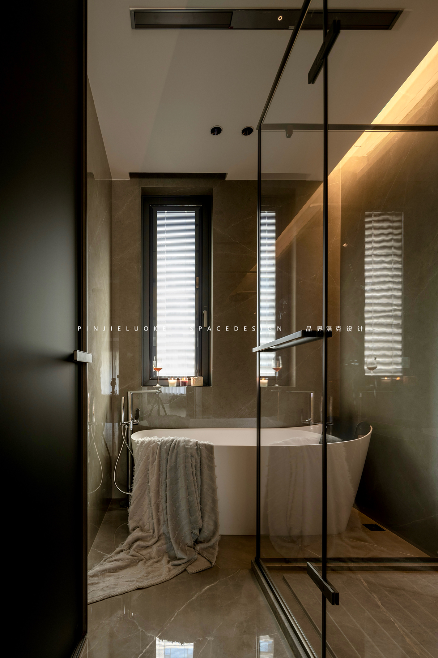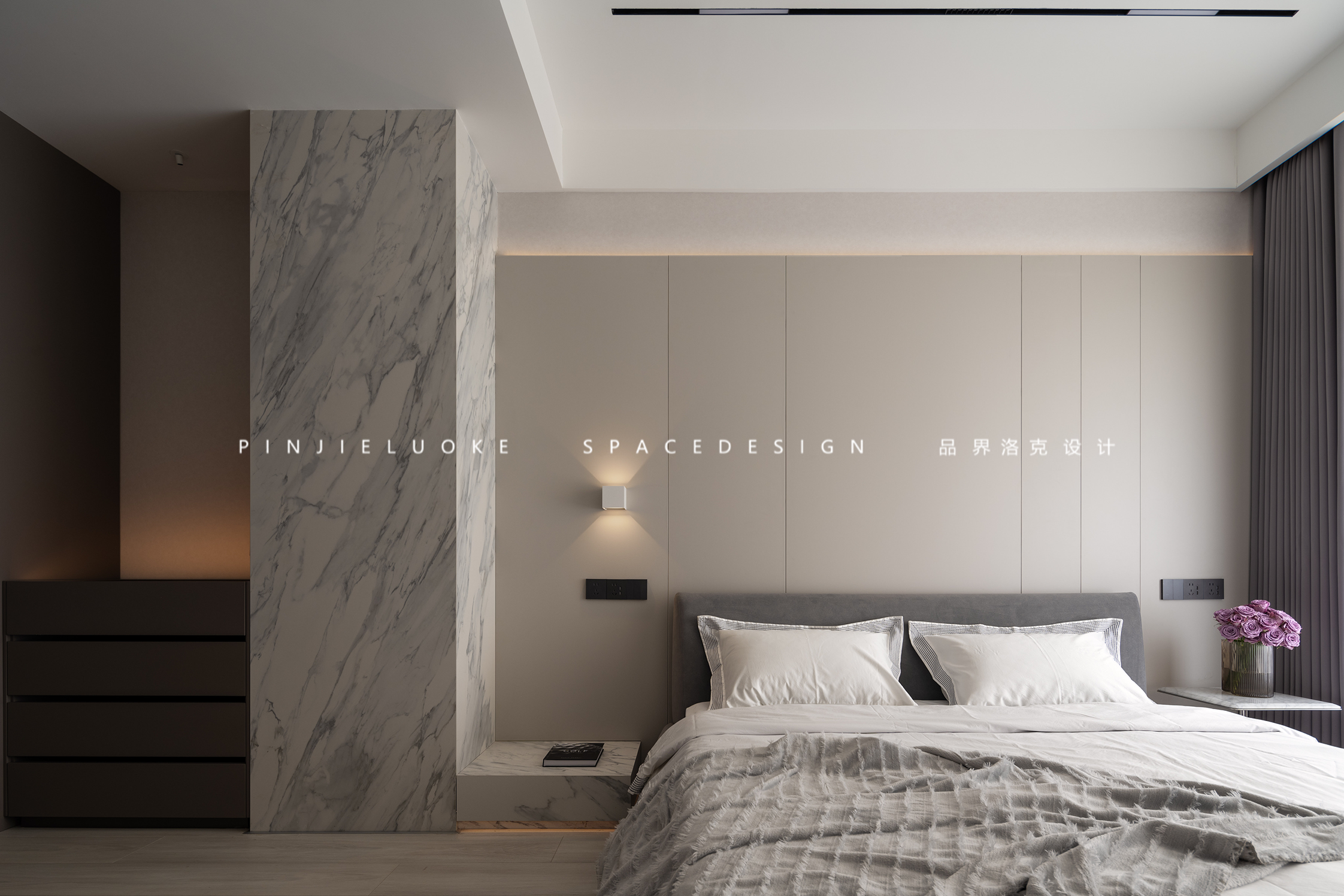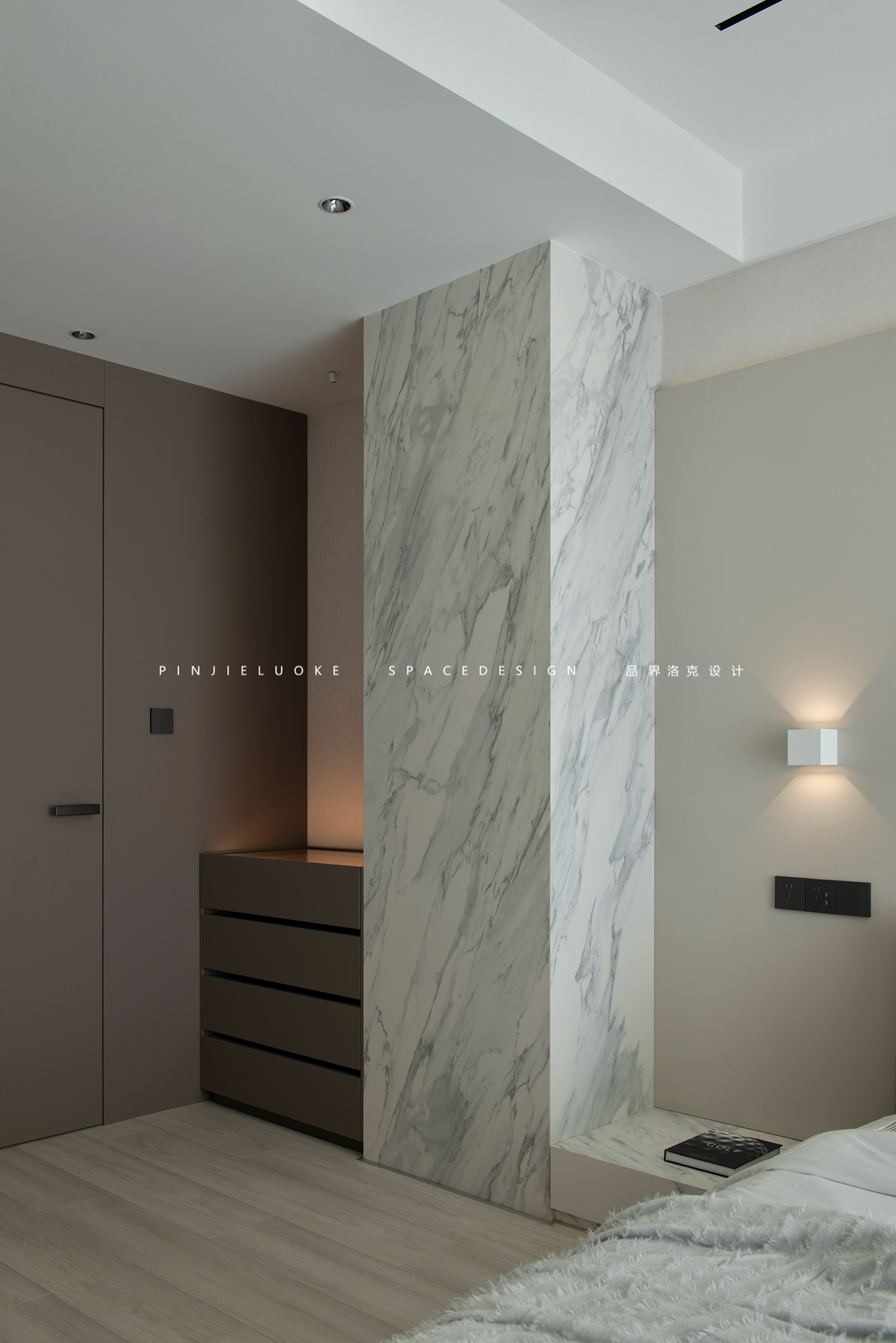 主卧双开门入户,整体温柔的色调,大理石包裹立柱,同时也成为整个空间的亮点,衣帽妆台、淋浴泡澡都融合在主卧大套房中,考虑到起夜的二次入睡,在临近床的区域设计马桶间,淋浴泡澡空间靠近窗边,整个主卧功能齐全,简约又浪漫。