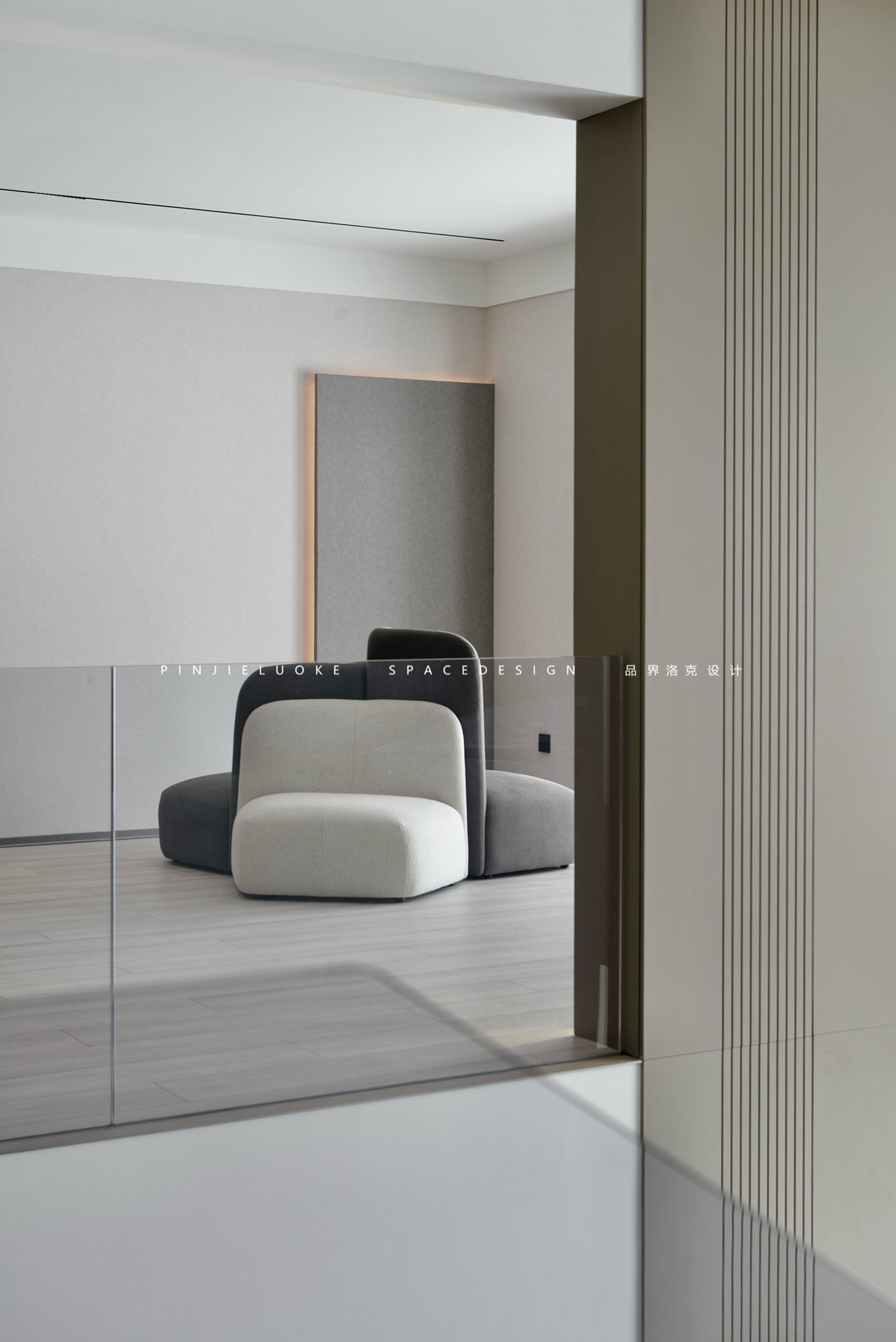 半搭的形式增加了整个屋子的空间感,同时也给二楼区域增加了一片多功能平台,灰玻镜面与整个家的色调非常和谐,业主可以在此舞蹈瑜伽,“三人行”的组合沙发可以随使用人数以及使用场景的变化随意组合挪动,开放式的多功能空间也给方便业主入住之后自由调整规划。
