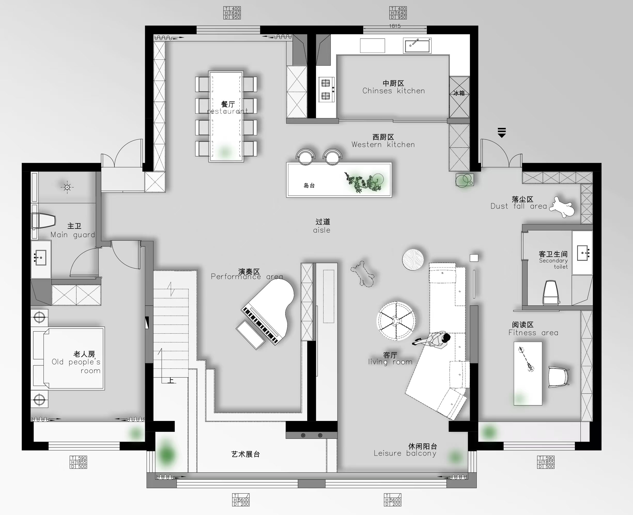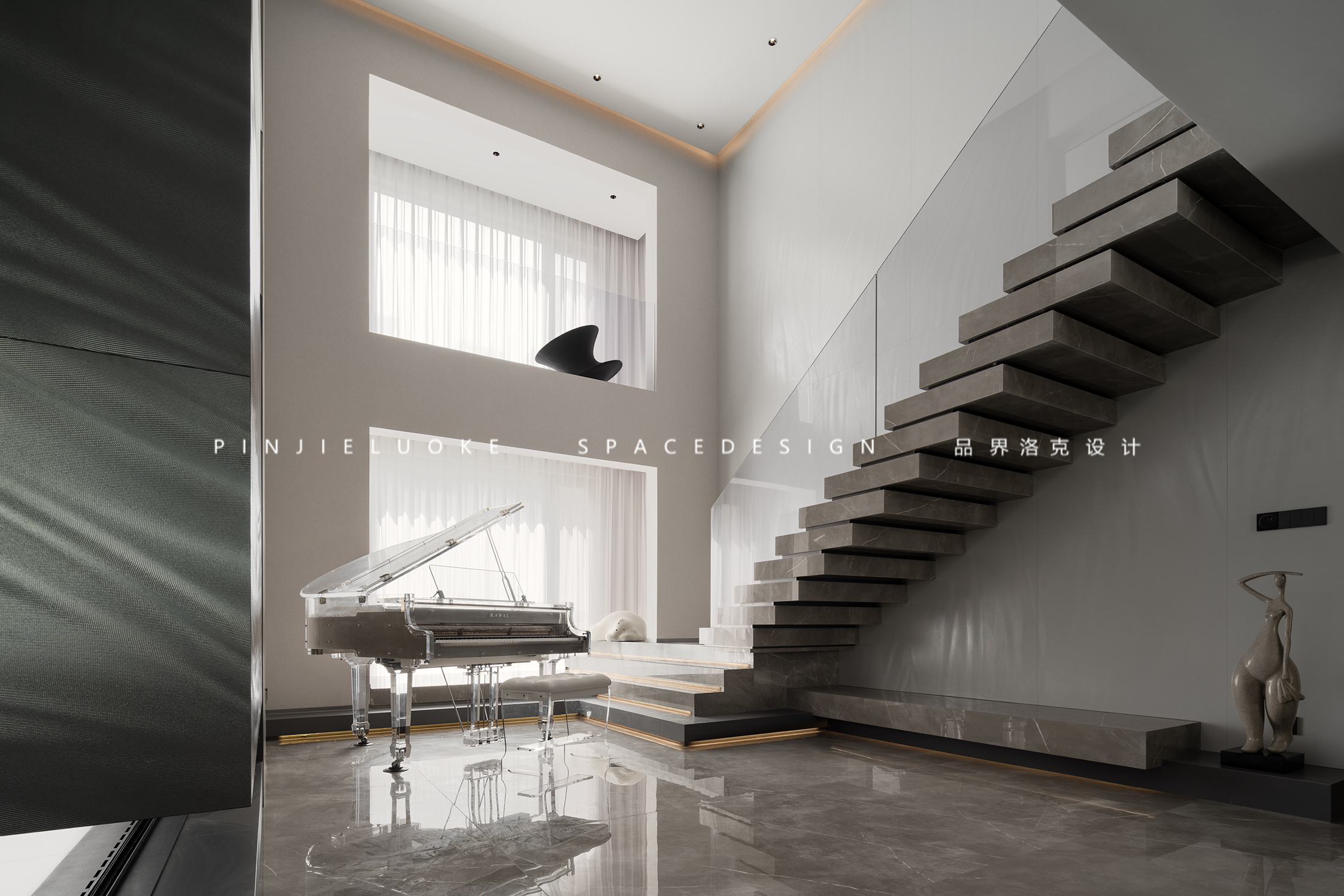空间布局:挑空部分一般会在主客厅区域,这个案子设计在钢琴演奏区,保证演奏区域空间感