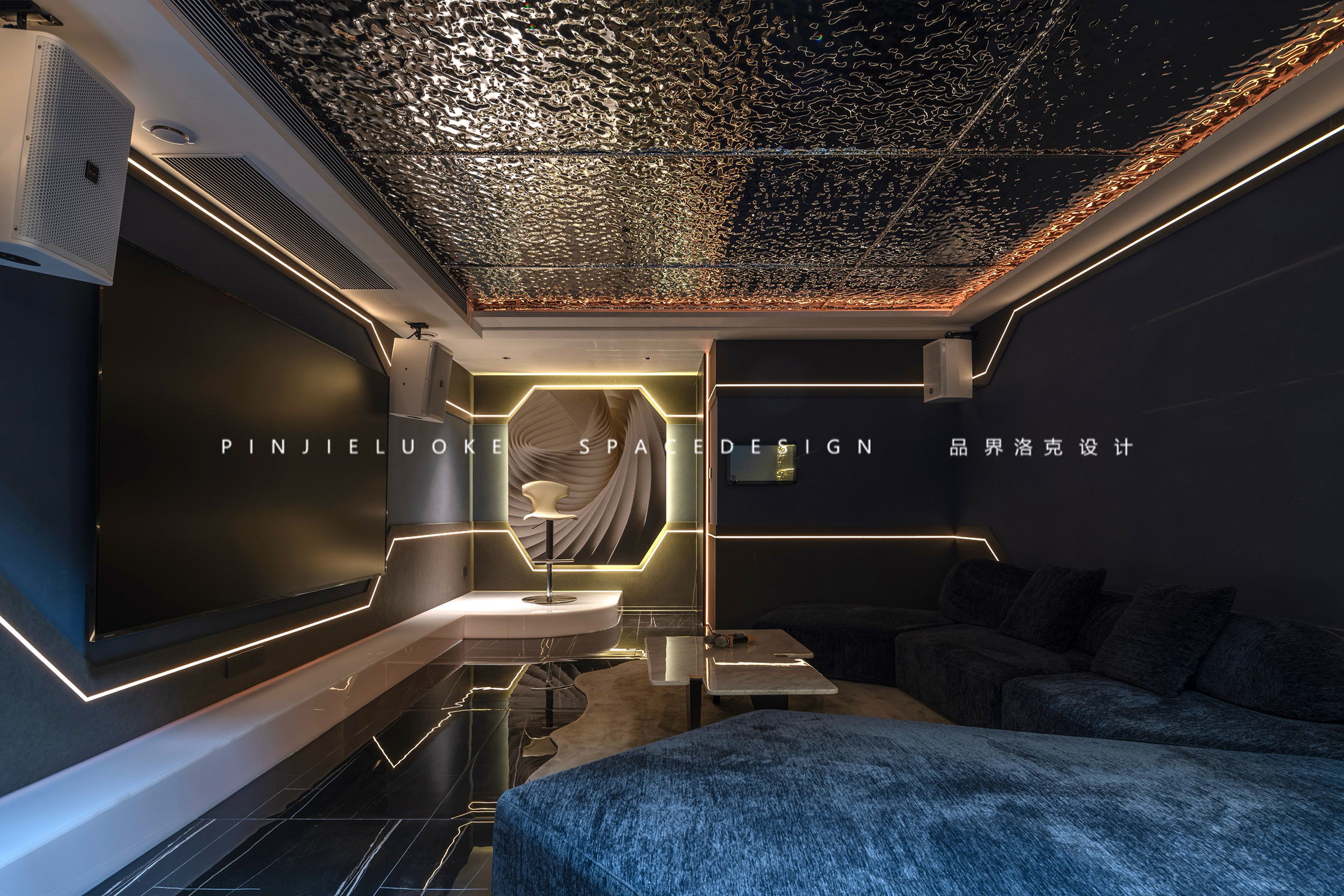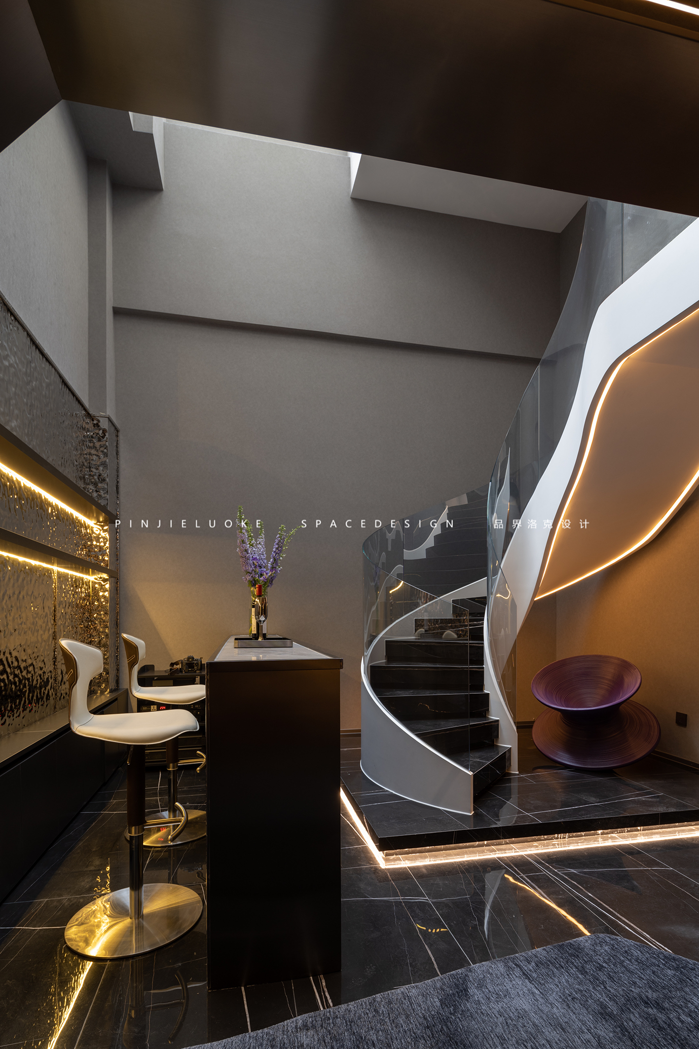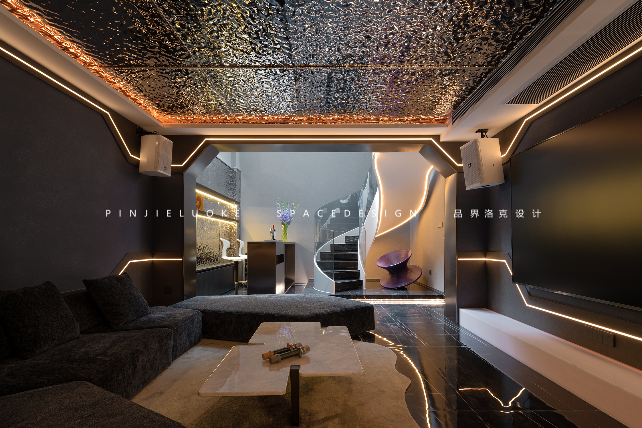 地下室按照功能划分为KTV、酒吧区、茶区以及休息区,KTV整体暗色为基调,顶面采用镜面水波纹板,加上一周的线性氛围灯光,充满科技感和梦幻氛围,酒吧区主体为互动式吧台,随着旋转楼梯走上夹层,自由灵活的设计感家具组合摆放,成为独属家中的“卡座”区;离开闹区转向静区,干净素雅的品茶氛围,跳高的空间感也让人更加放松惬意,二层也准备了休息区用来小憩。地下室空间动静划分、功能丰富。