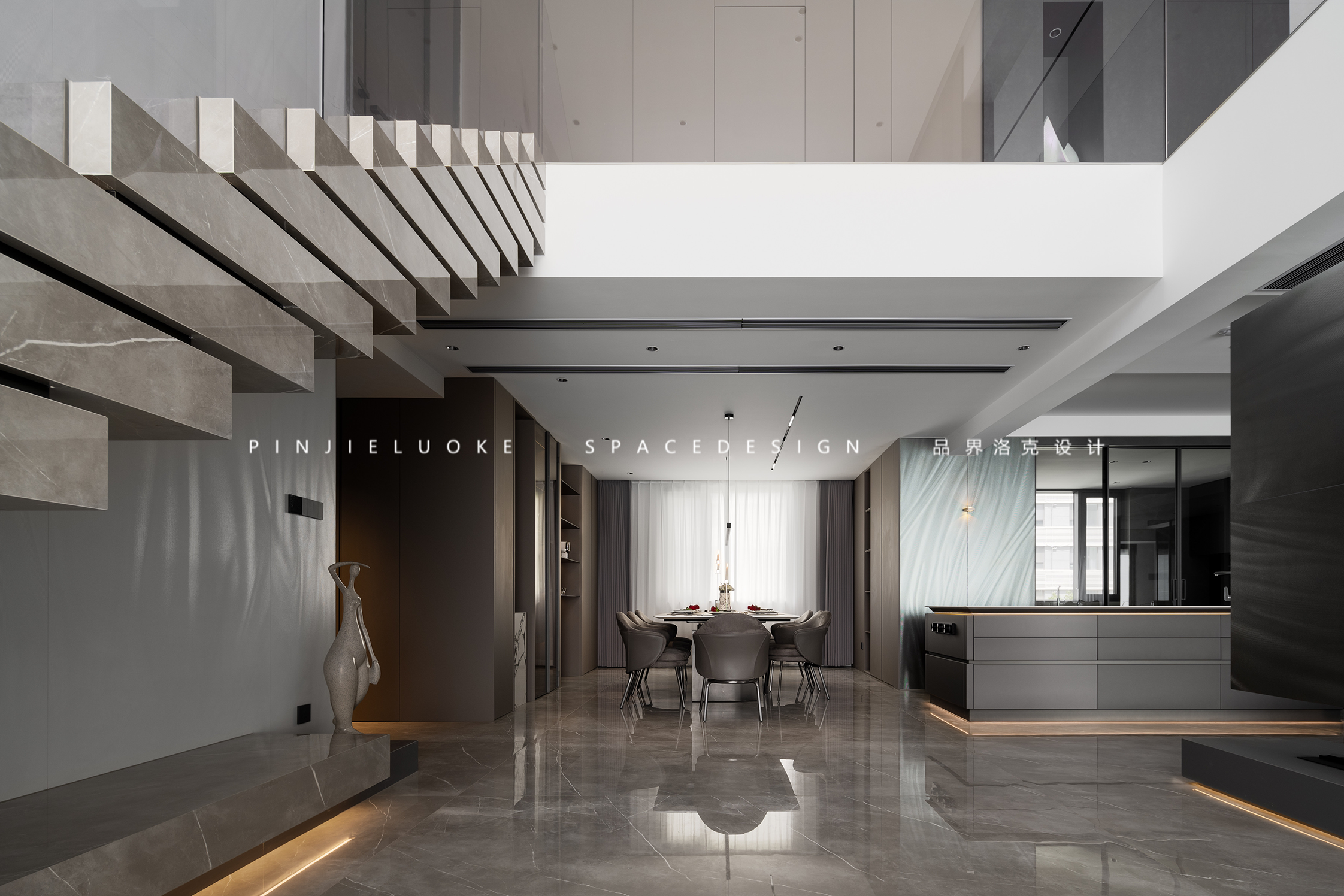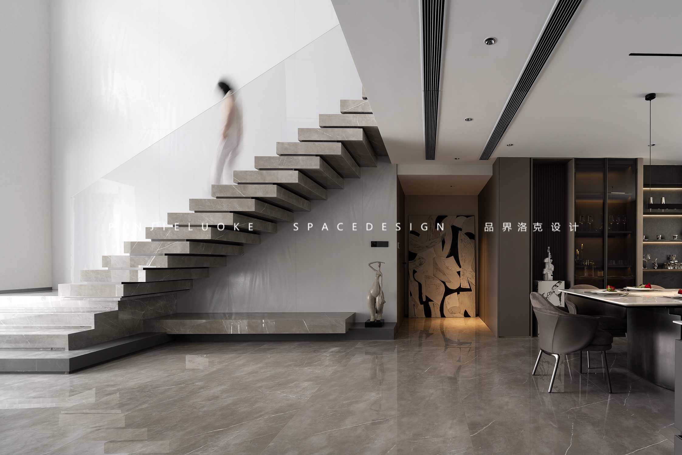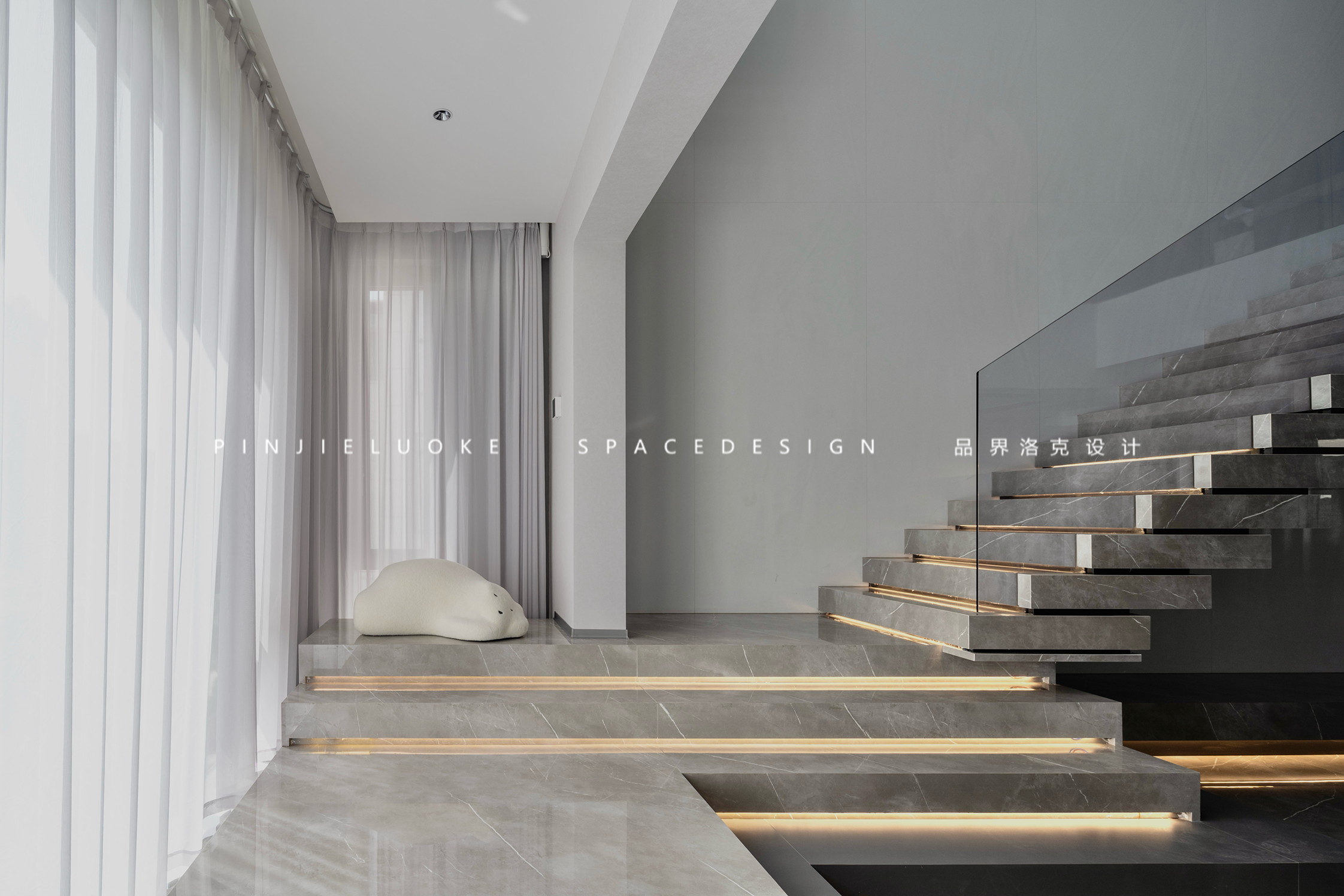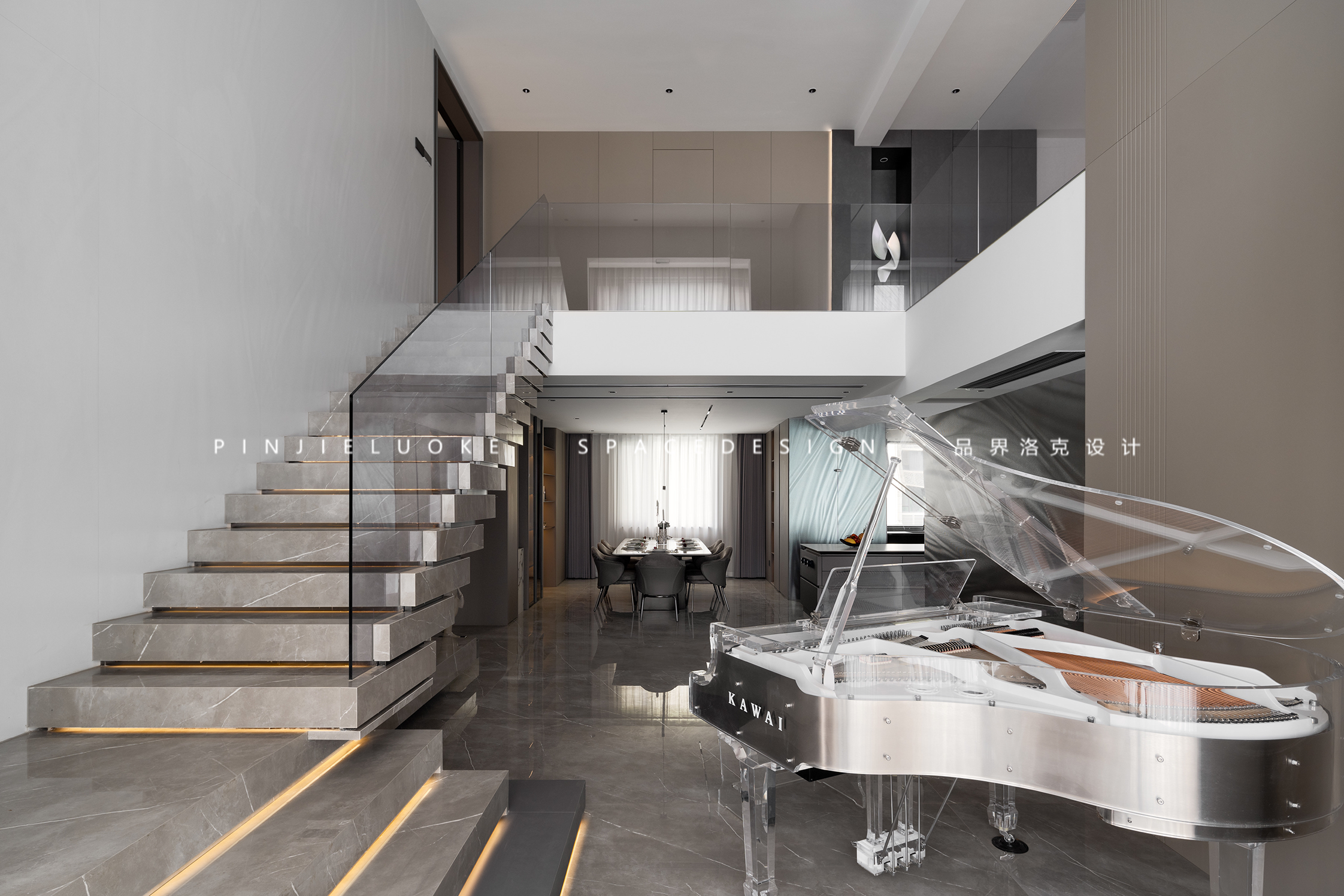 把挑空空间留给会客厅是很常见的做法,这个案子设计师考虑到业主的喜好,把整个挑空区域留给了业主的喜好,弹钢琴的周围环境是首要因素,另一个非常重要的因素就是听众,设计师将一侧的楼梯采用“钢琴键”式的设计,延伸地台结合了阶梯教室的灵感,亲朋好友可以在此落座聆听,放松休闲。