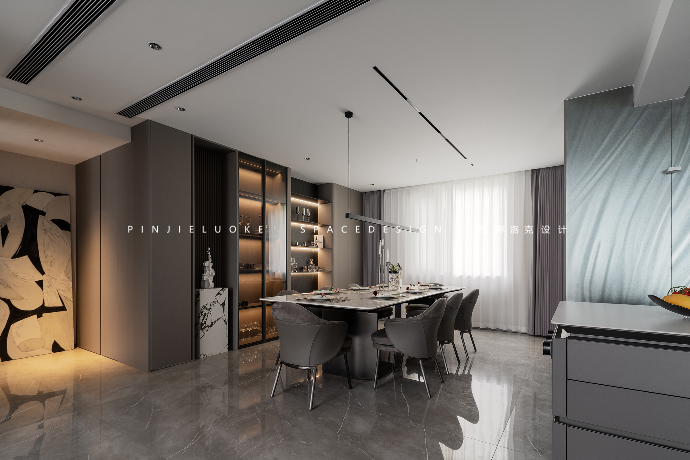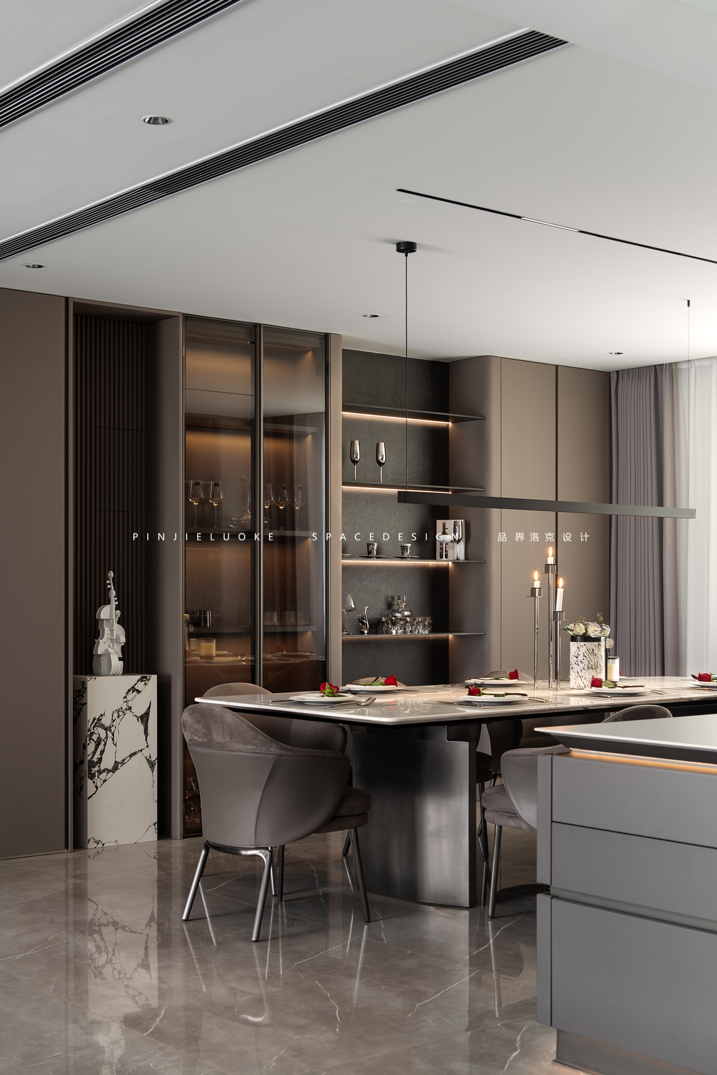 超大的开放西厨岛台不仅增加收纳储物功能,同时也增加备餐操作区域和简单就餐台,就餐区域设计了大量的储物空间以及展示陈设开架,在实用性和观赏性达到了平衡,中厨区域预留了双动线,外置吊轨门保证了烹饪期间的封闭性。