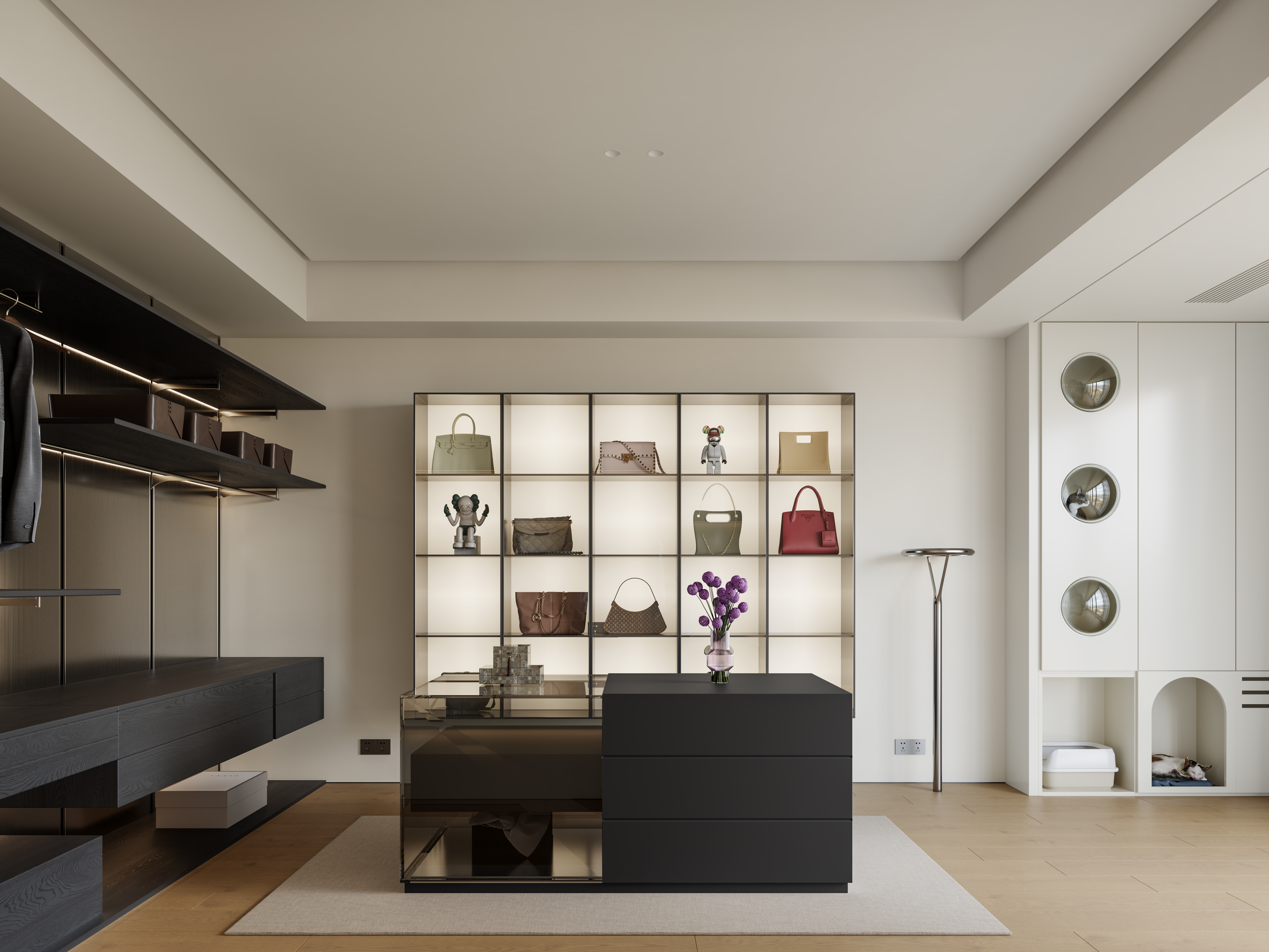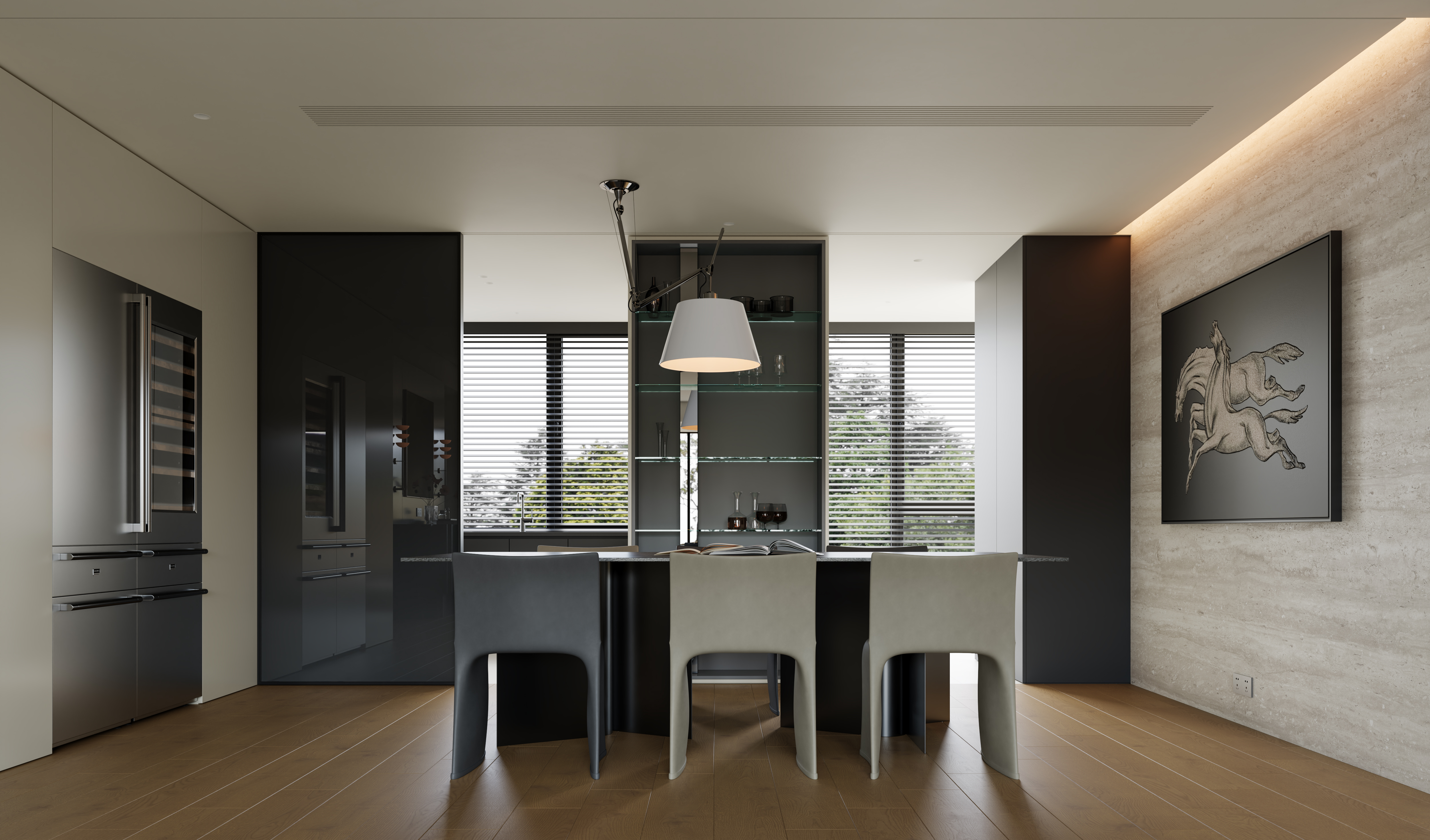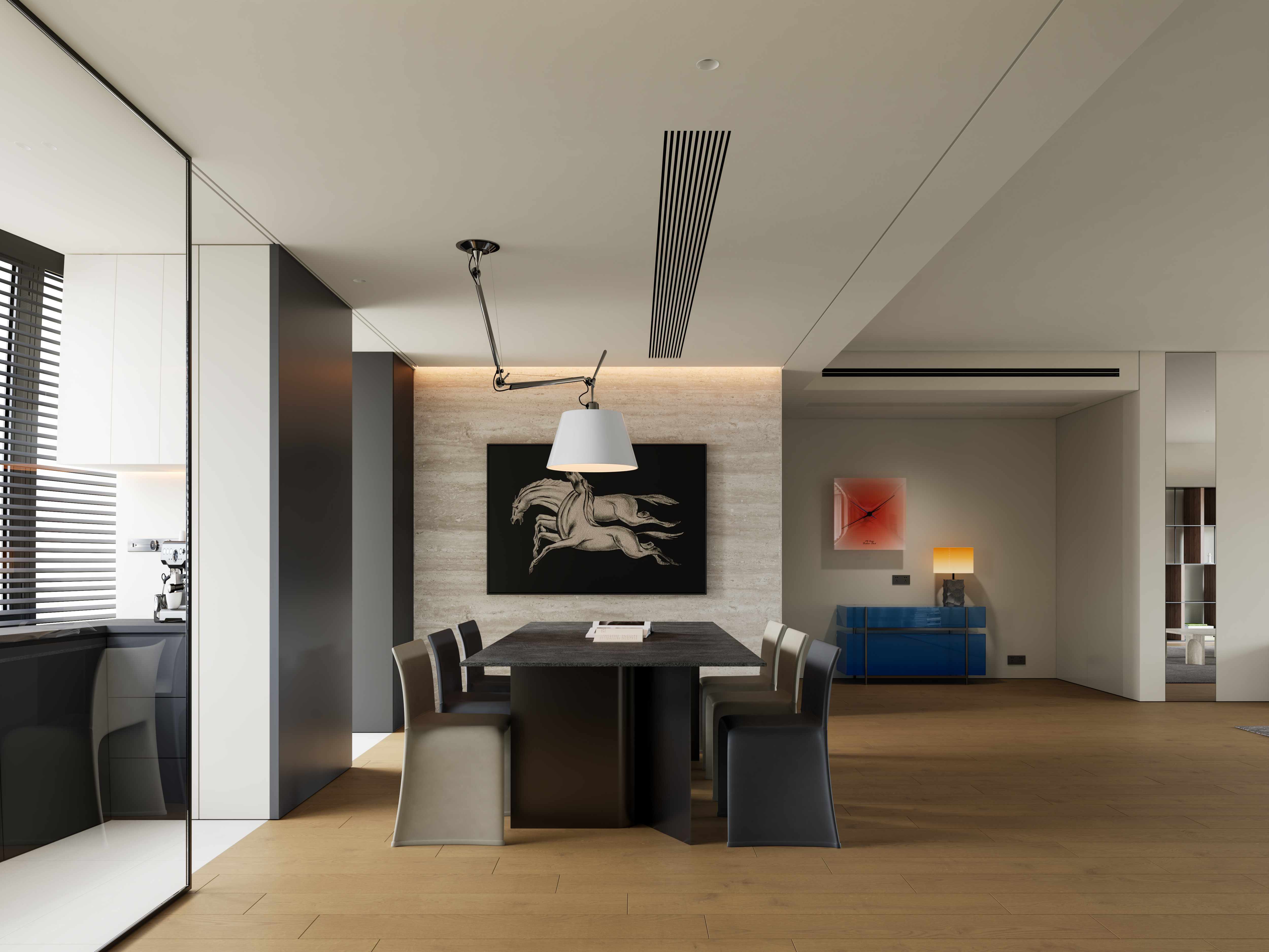 室内动线的设置流畅而有层次。开敞式布局营造了通透互动的共享氛围,而柔和的线条与天花板高度的起伏,则巧妙划分出静谧私密的角落。 -