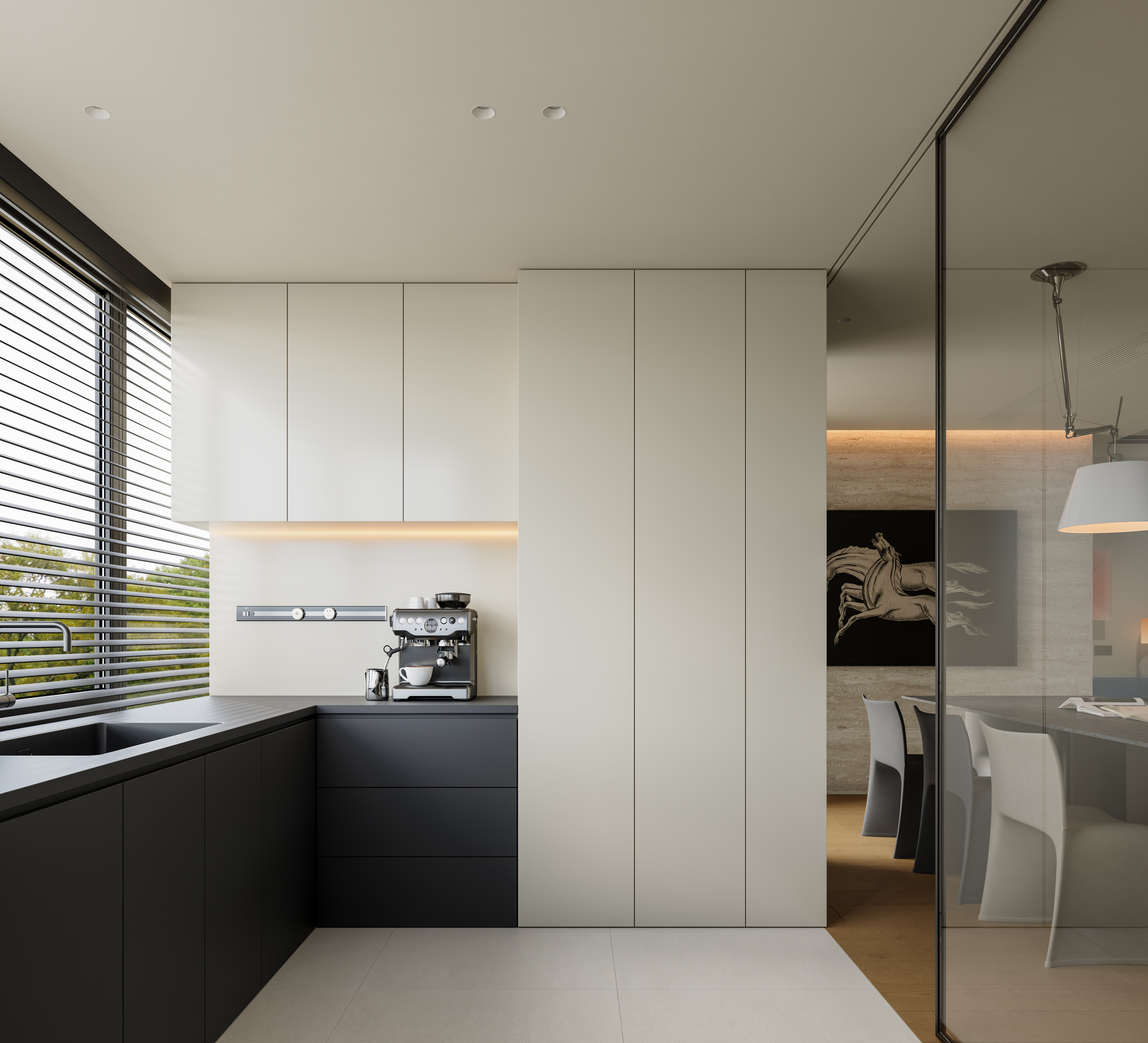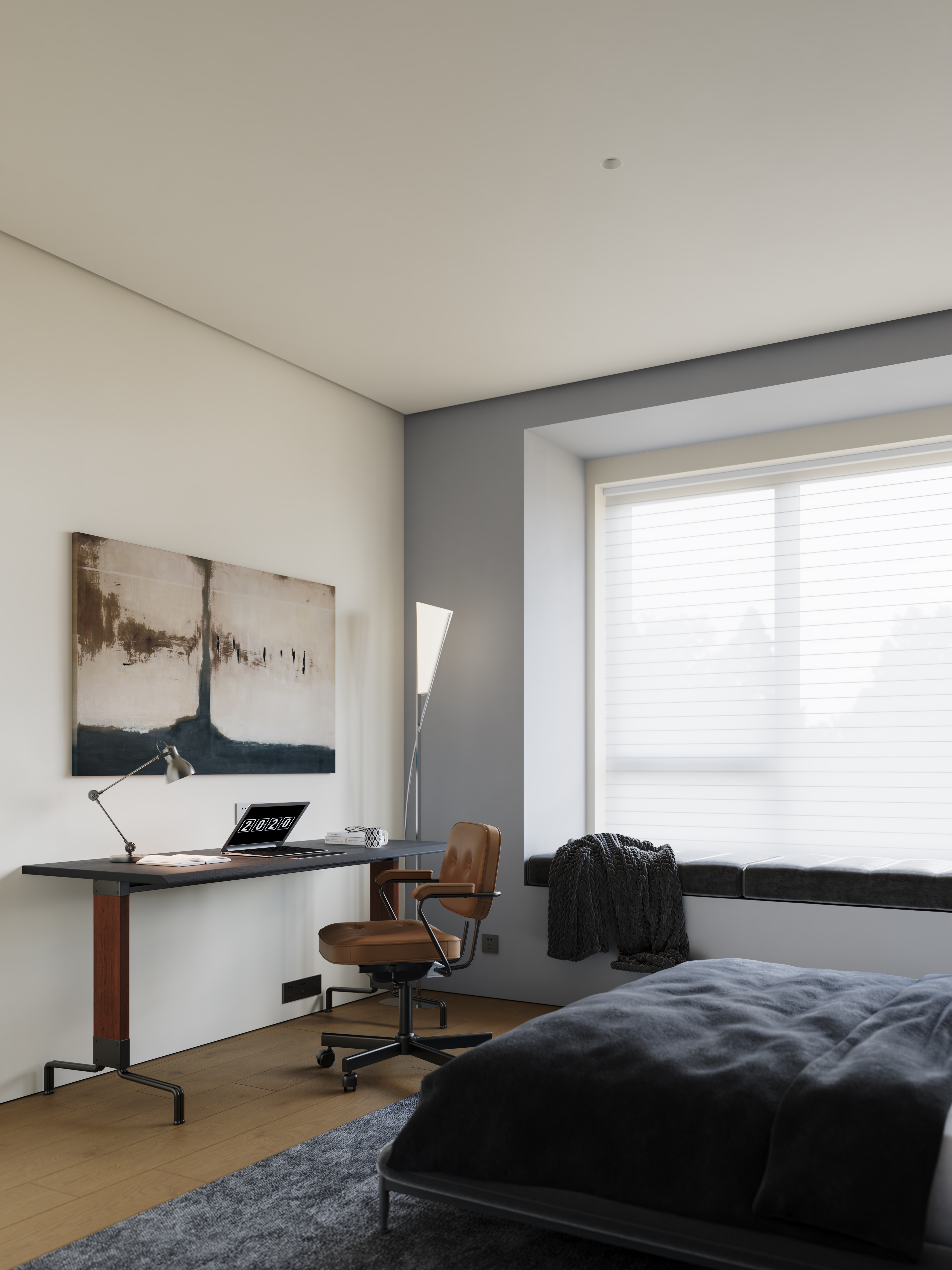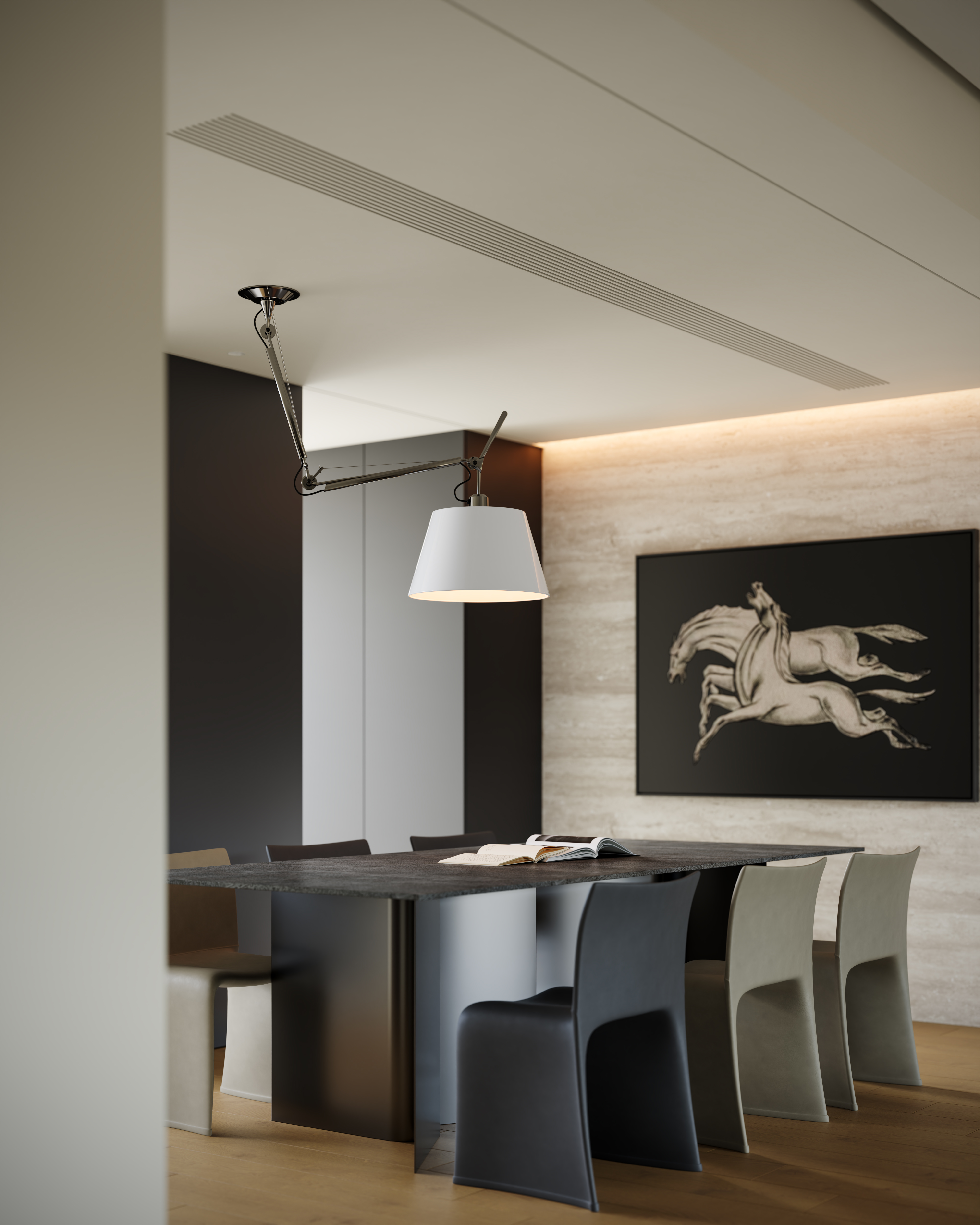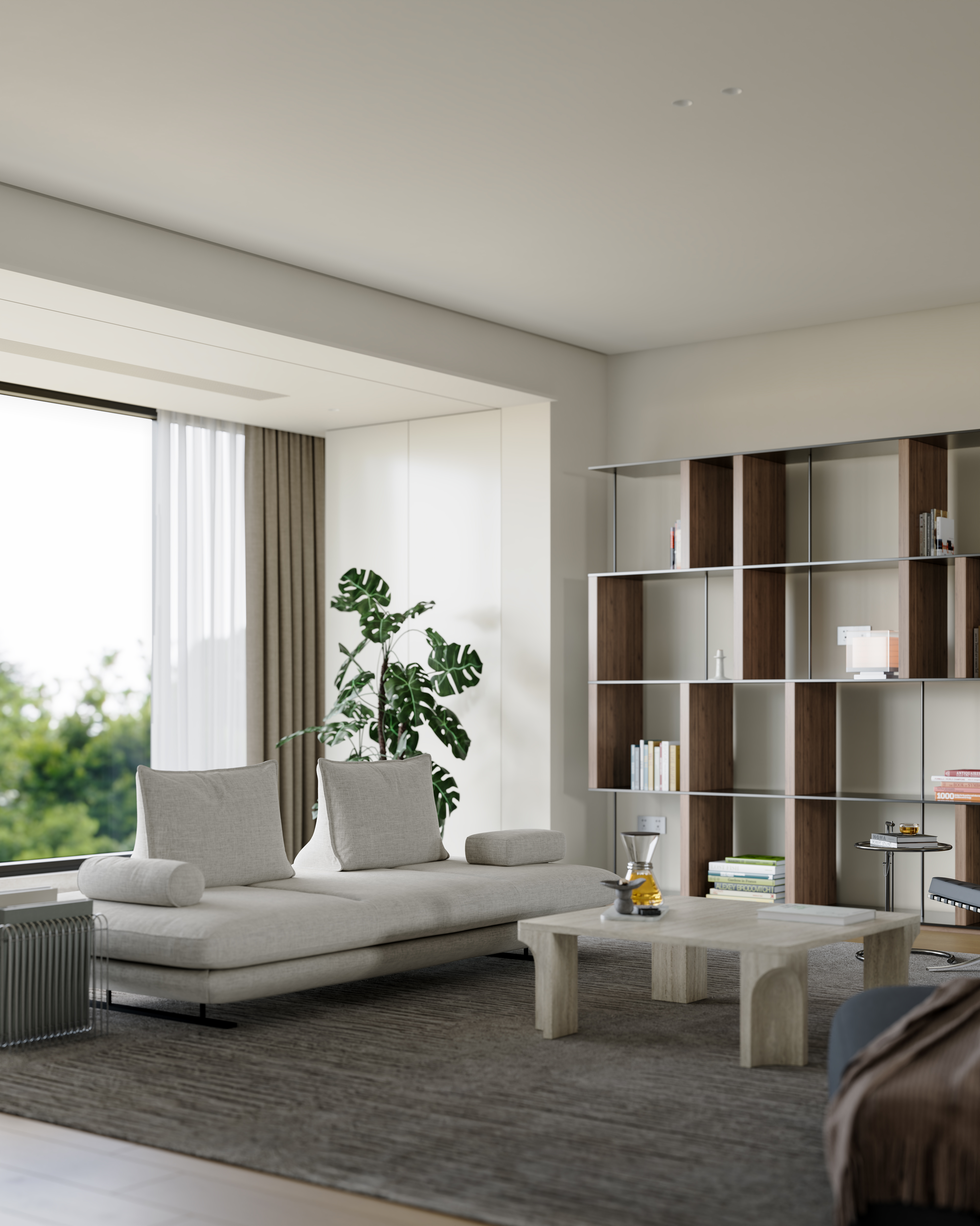 室内动线的设置流畅而有层次。开敞式布局营造了通透互动的共享氛围,而柔和的线条与天花板高度的起伏,则巧妙划分出静谧私密的角落。 -