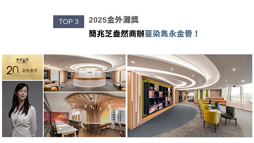 「金外滩」奖迄今已有20年历史,不仅是华人室内设计领域的经典奖项,也是华人室内设计行业发展的风向标。简兆芝团队透过可切换通透及雾面两种模式的电控玻璃,规划能充分引入採光、亦可兼顾会议时隐私的明朗办公室,而户外自然绿意及大厅装饰的永生苔藓相呼应,勾勒企业永续繁荣意象的商办作品《衍流萃息》,获颁「最佳办公空间奖」金奖的殊异佳绩!