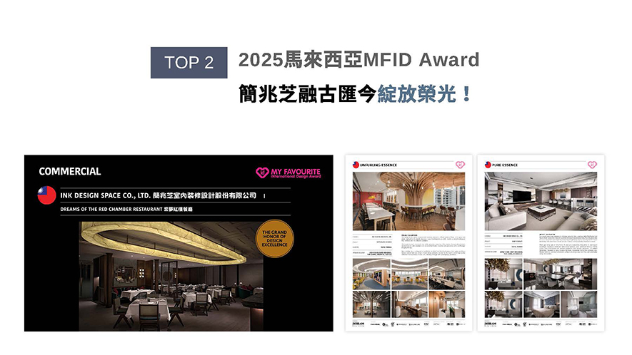 MFID作为马来西亚首个且唯一的国际设计奖项,在「创新、永续发展与文化交融」的指引下,开启设计产业的无限可能。简兆芝设计师为《弈梦红楼餐厅》佈置繁华而不失雅致的用餐空间;《衍流萃息》则酿出清新和谐、灵活的现代商办氛围,两件成功摘下本届赛事「Winner」荣耀!而静谧舒适的都会桃源《璞玉天成》,亦挺进入围席次!