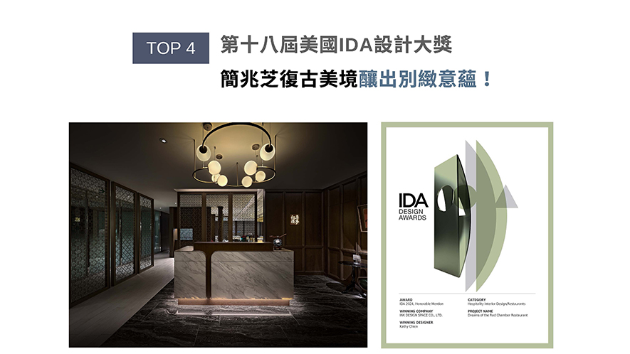 美国IDA国际设计大奖以创新性、实用性和发展性等多种面向为评选标准,发掘各领域的新兴人才。简兆芝室内设计匠心活用饭店各层不同的风情转换,全案铺展深木復古感,令来客由浅色调一楼大厅乘坐电梯入店时,透过截然不同的沉稳雅韵予以人们深刻迎宾印象,唯美亮眼的《弈梦红楼餐厅》勇夺「Honorable Mention」!
