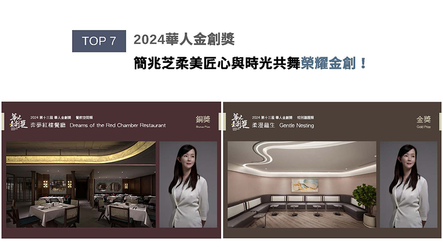 以「和谐、融合」理念巧妙演绎迥异场域的简设计师,在医疗场域《柔漫蕴生》中彰显医疗团队呵护新生的使命感;而老上海风《弈梦红楼餐厅》则使顾客在华丽復古氛围中品味人生的圆融。两件作品分别夺得2024华人金创奖「特别议题类」金奖与「餐饮空间类」铜奖荣誉!