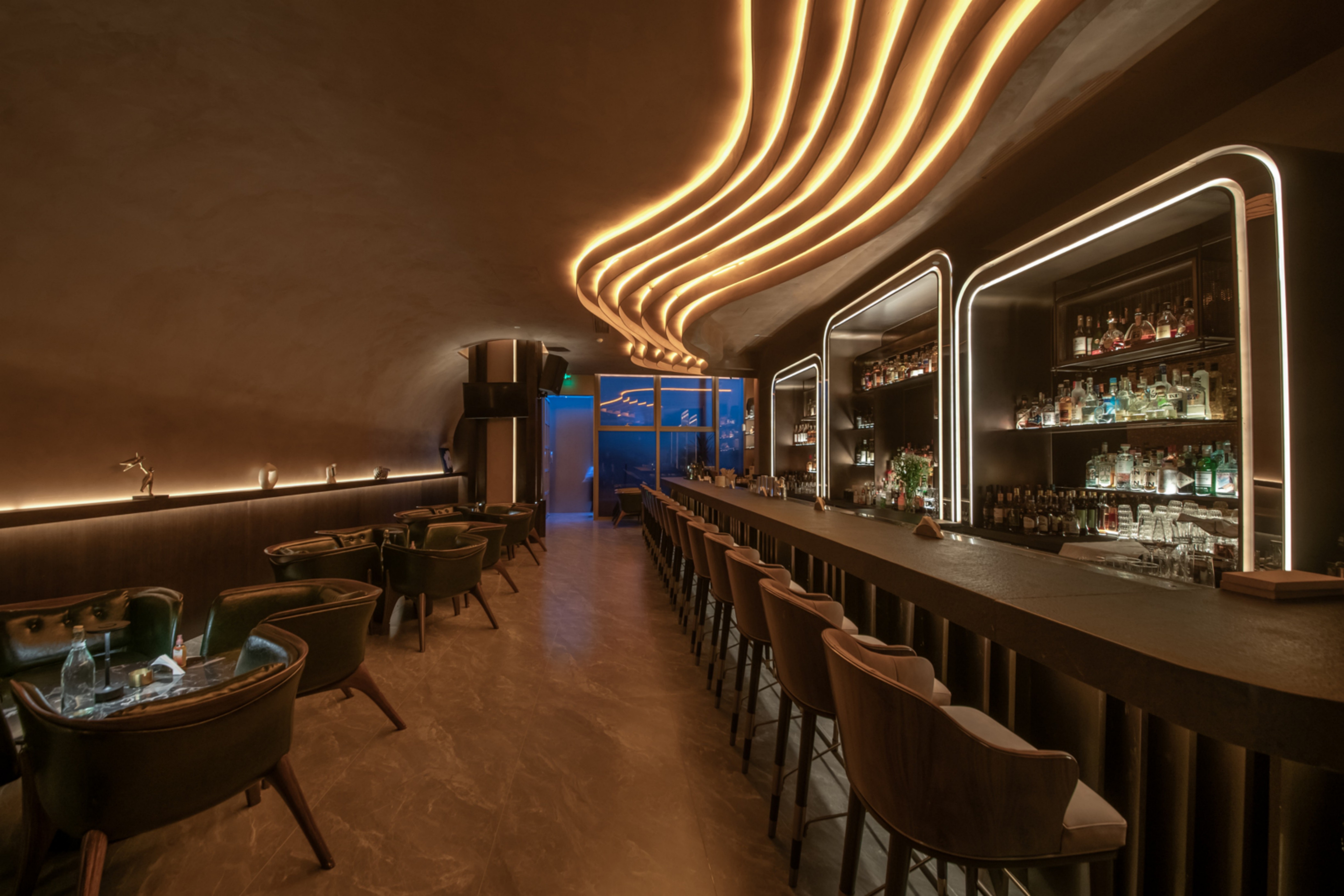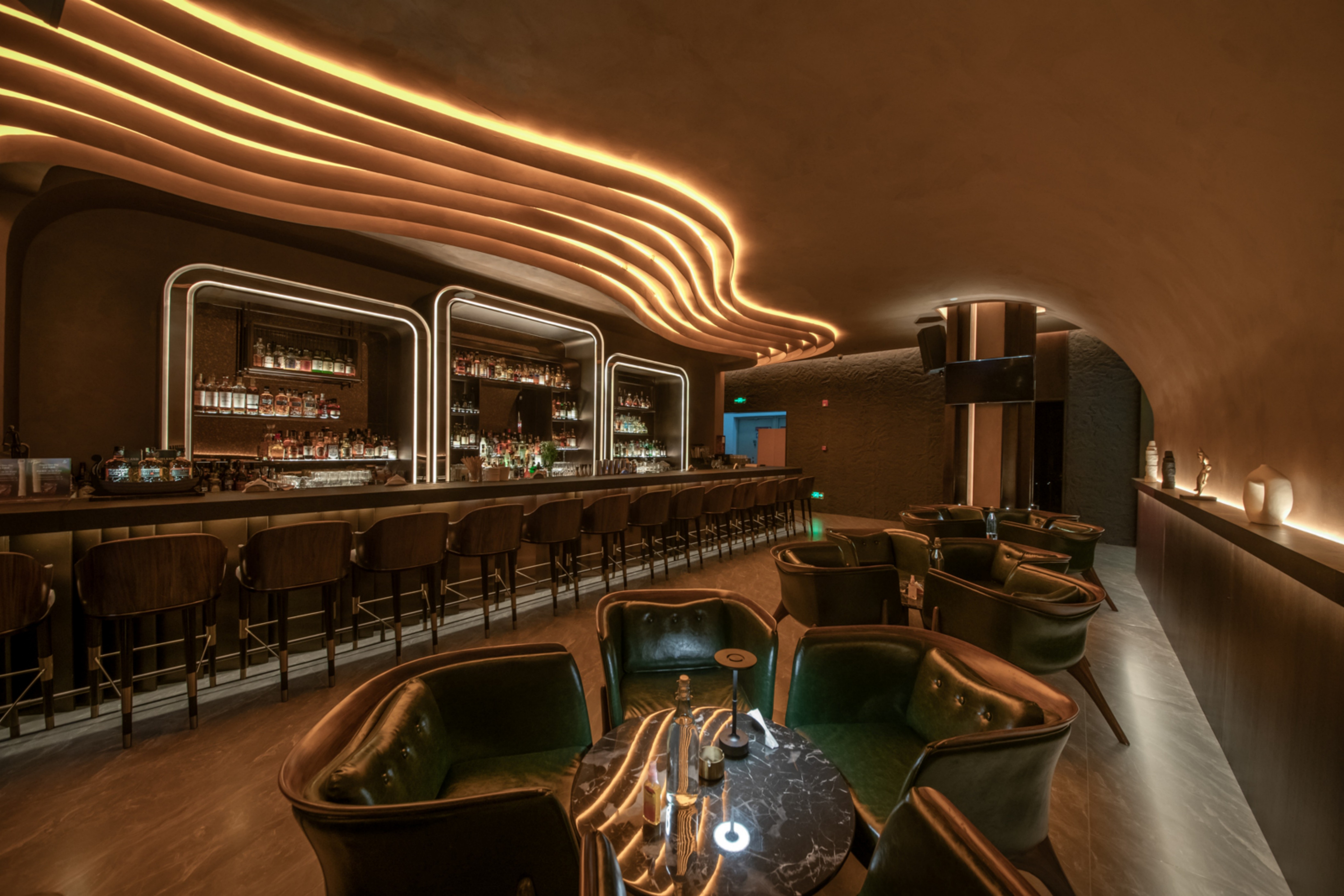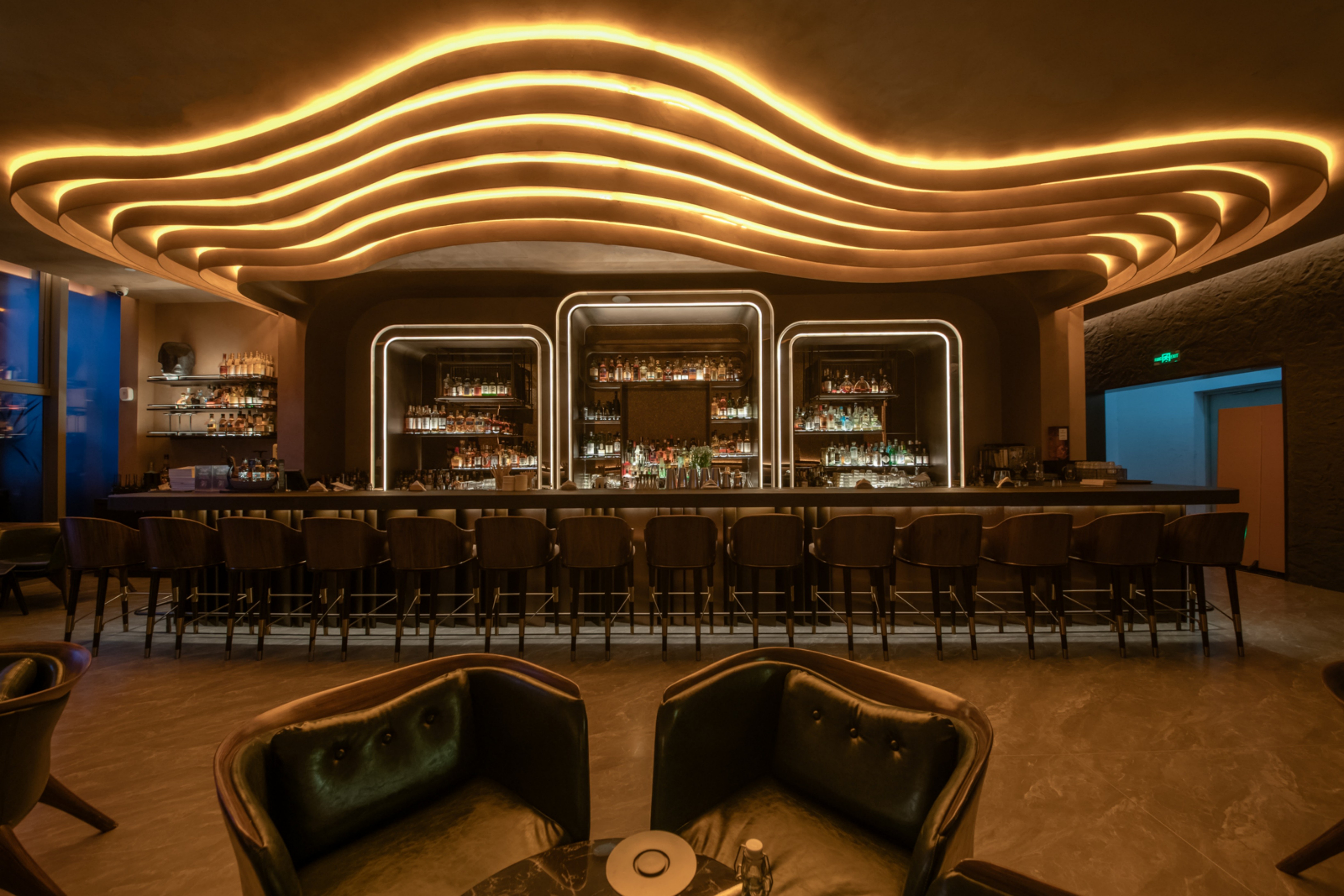 整体空间设计以“流动与汇集”为核心叙事。天花造型采用柔软而连续的曲线,象征水流的自然形态。交汇于酒吧最深处的核心区域——吧台。这一视觉引导不仅强化了吧台作为空间焦点的地位,也隐喻着繁忙都市生活在此沉淀、融合与释放。吧台区域因此不仅是调酒的舞台,更是整个空间能量与视觉的凝聚点,材质上选用温润的石材与金属进行搭配,在灯光映照下泛出如水光潋滟的质感,凸显现代精致氛围。