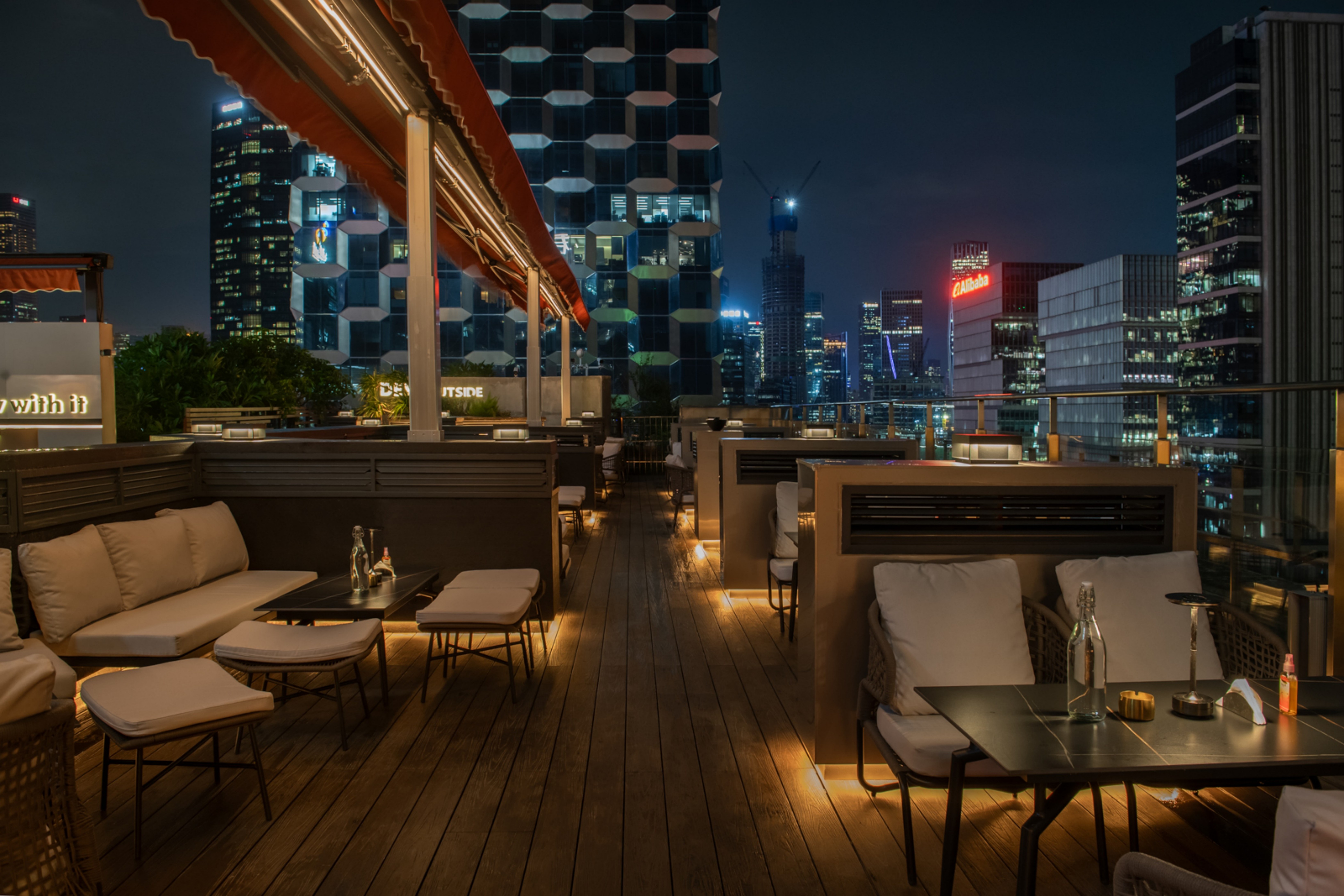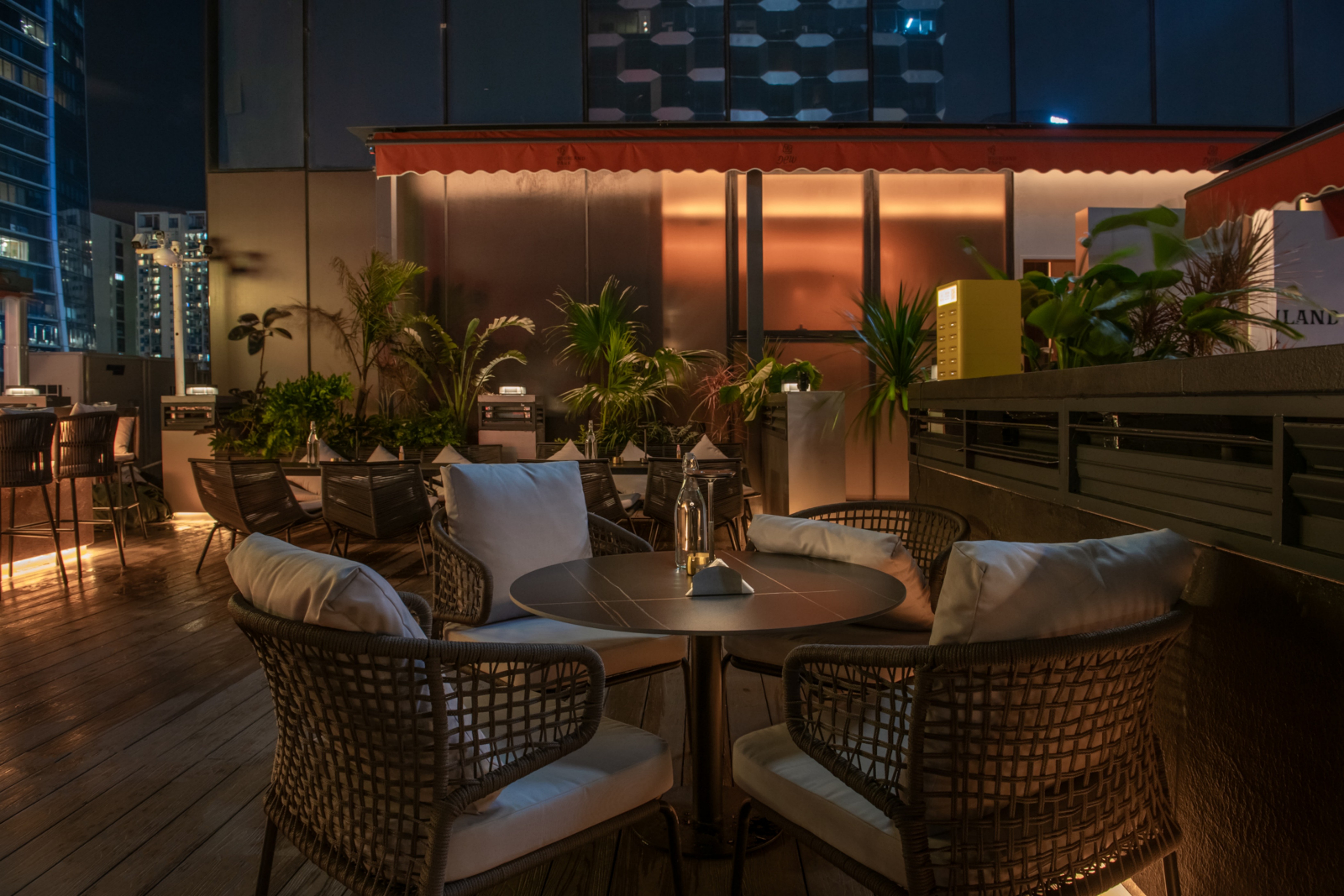 室外区域延续了“城市绿洲”的概念,为那些偏好半户外体验的客人提供了一处怡人场所。为应对深圳的气候特点,所有室外隔断均采用耐久性强的天然石材与不锈钢构成,并创新性地嵌入变频空调系统,确保无论是盛夏还是微凉时节,都能维持宜人的体感温度,实现真正的“冬暖夏凉”。绿植环绕布置,既柔化了建筑立面的冷硬感,也增强了空间与自然的对话,营造出室内外渗透共生的悠闲情境。