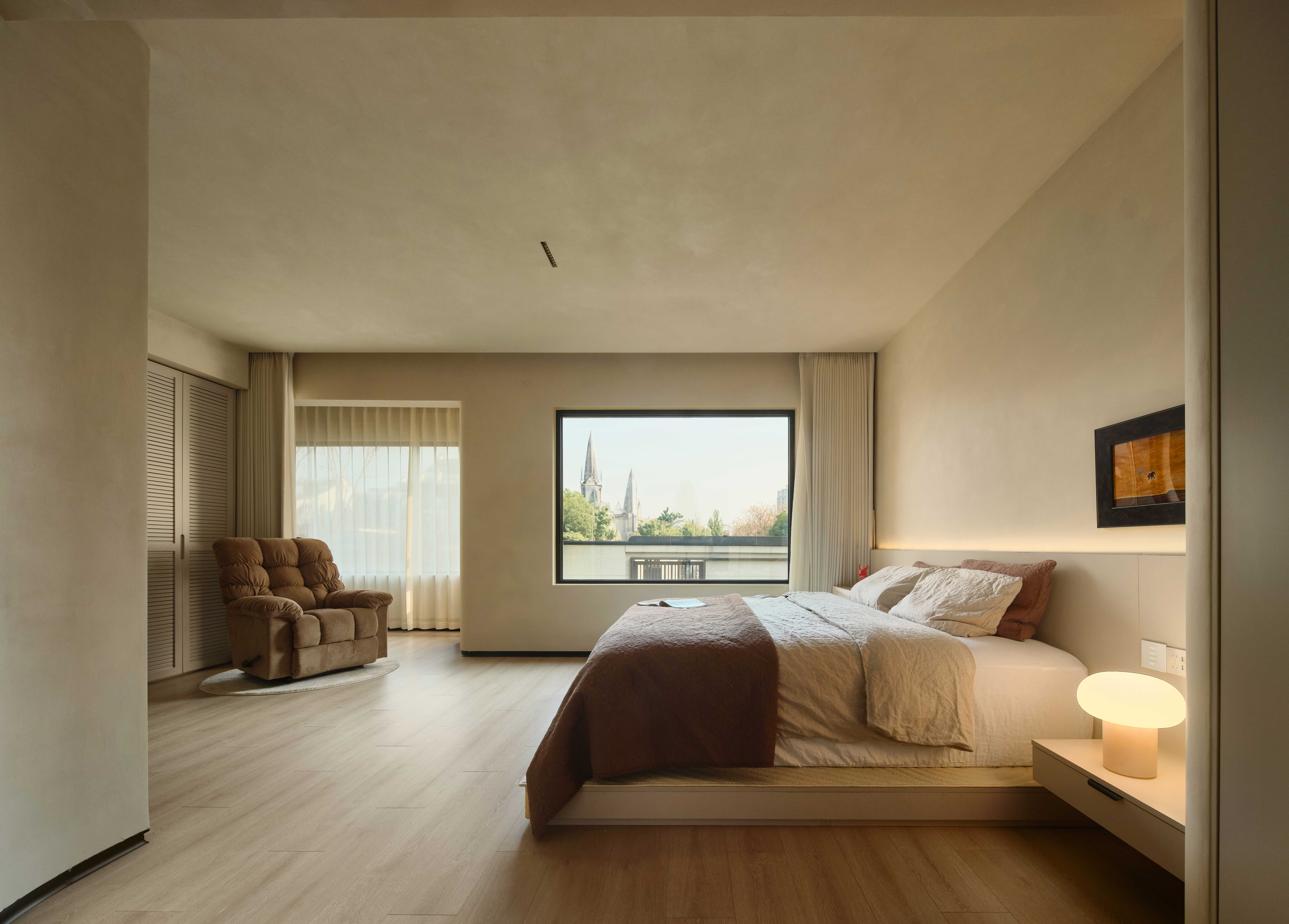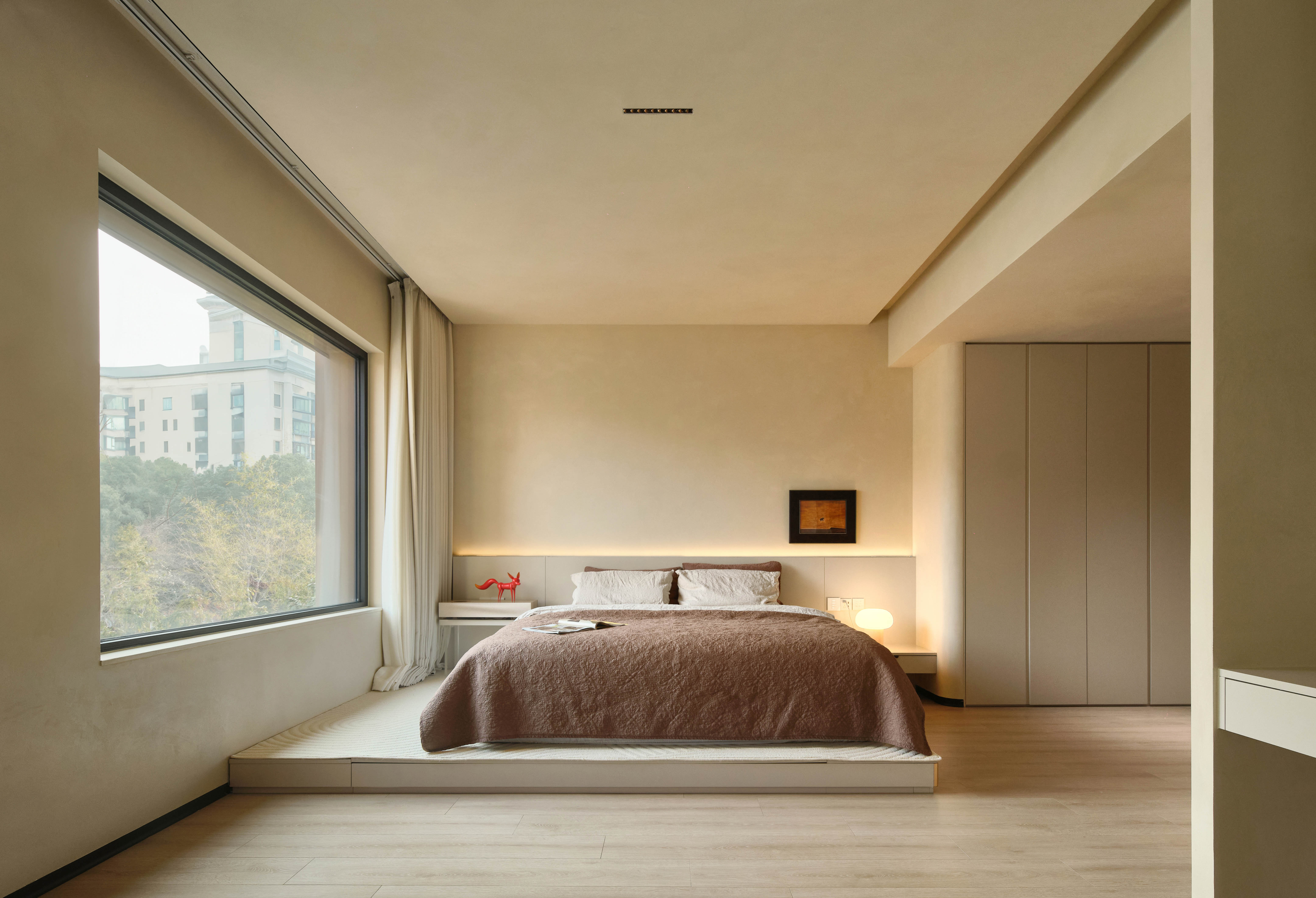 地台床自然的在地面舒展开来,床头内嵌灯带散出暖光,镀上一层柔和的滤镜。