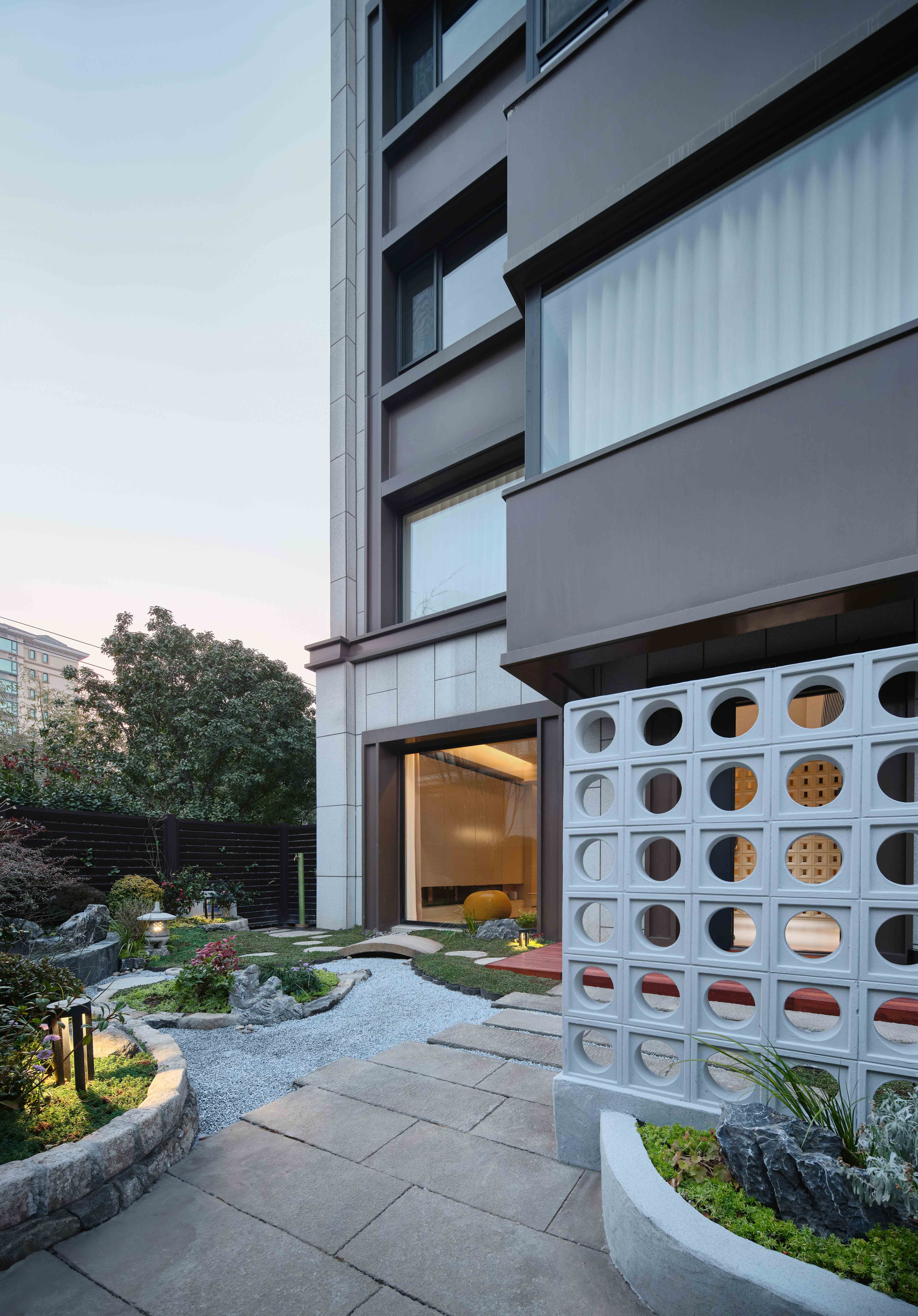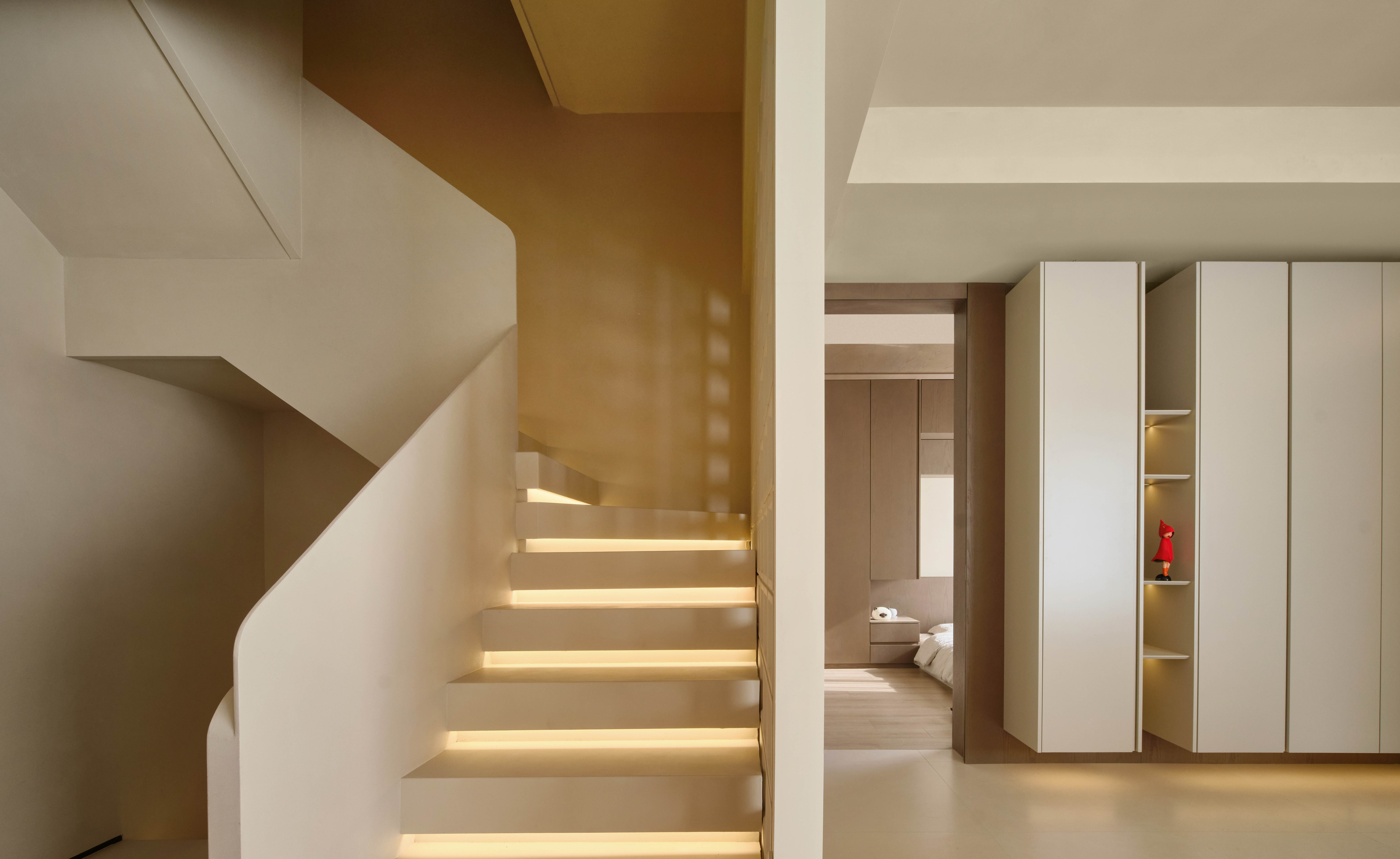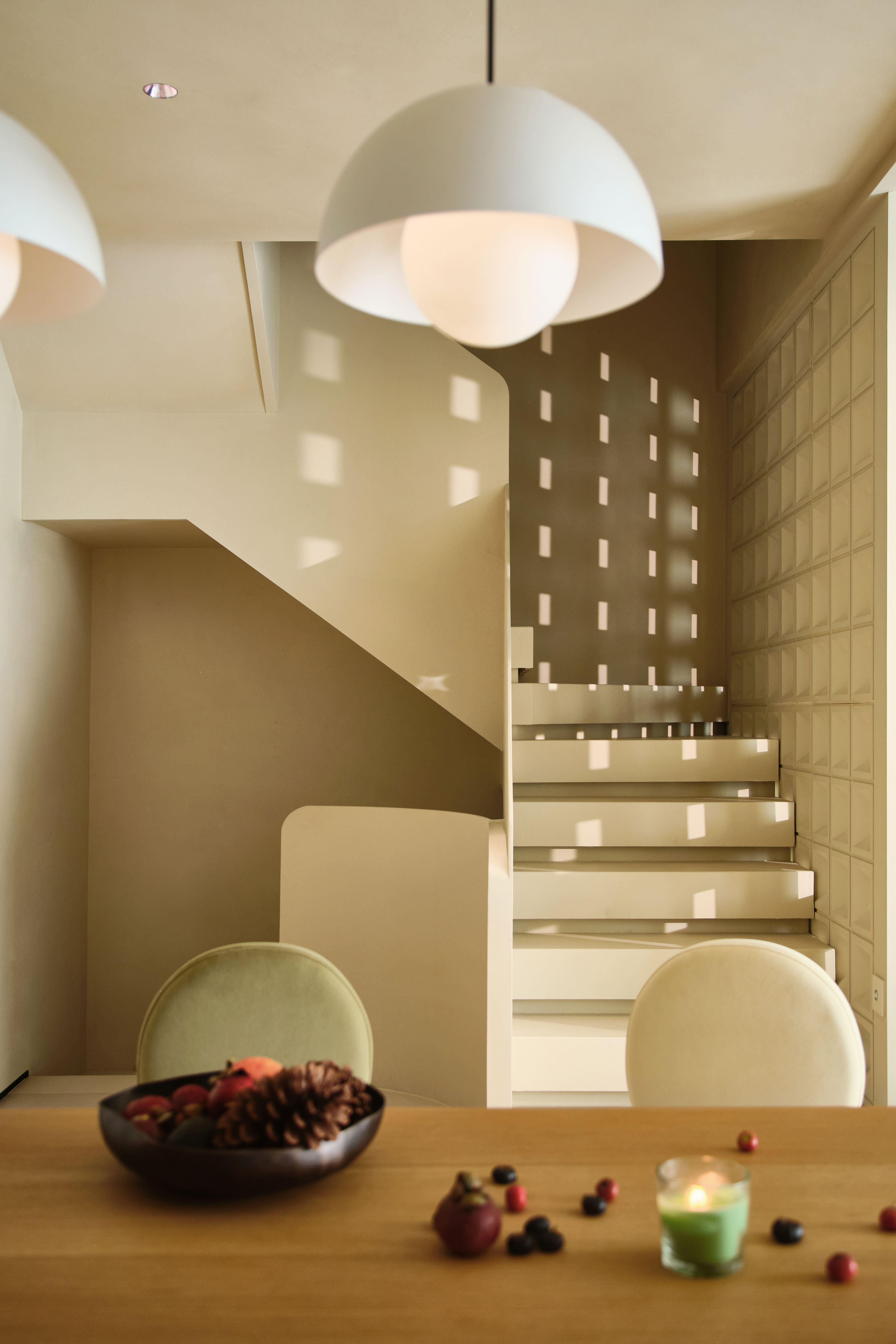 光透过玄关的镂空隔断悄悄潜入,斑驳洒在台阶上,像一串跳动的音符,引领人向未知探索。